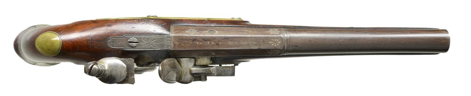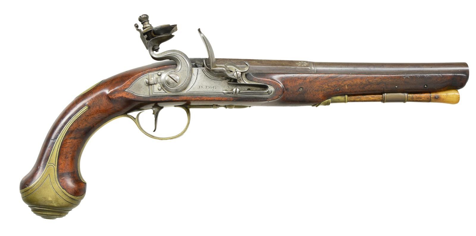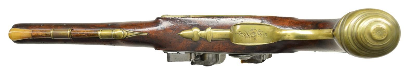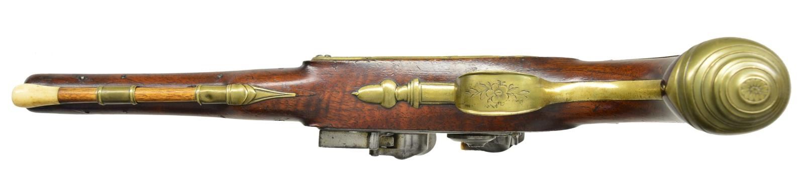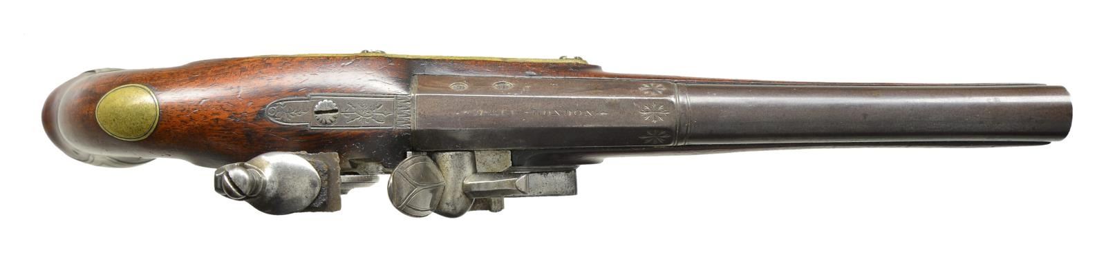 PISTOLS BY DURS EGG. Cal. 58 (pr.). S# NSN (pr.). Swiss born Durs Egg emigrated to England in the 1760's and worked for Henry Nock. He had formed his own business by 1772, was completely blind by 1822 and died in 1831. He was one of the most famous gunmakers of his day. These pistols were probably made in his early years at about the time of the American Revolution. They have 8" browned barrels which are octagonal at rear and transform through a wedding band to round with slightly flared muzzles. Top flats are engraved "D. EGG - LONDON" and London proofs are on top left flats. Barrels are not fitted with patent breeches. Tangs are engraved with spears, clubs and sheilds. Locks with slightly arched beveled plates and rebated tails are fitted with serpentine cocks, back sliding safetys, integral rounded pans, bridled friction frizzens and feather springs with spear finials. Locks are engraved with line borders and "D. EGG" in front of cocks. European walnut full stocks with knob grips are brass mounted. Trigger guards are of 1770-90 style with acorn finials. Heavy chamfered sideplates are one piece and grip heavy grip knobs have side spurs. Vacant ovals are on tops of grips and hickory ramrods with bone tips mount through single beaded pipes and matching thimbles. Stocks are pinned to barrels. CONDITION: very good. Barrels retaining most of an old rebrown showing some watered pattern to steel. Engraving on tops is slightly softened. Locks show bright polish over light pitting. Stocks with old oil refinish have many marks. Brass is nicely toned. Bores are good with some light pitting. Locks are fine. An attractive pair of British pistols probably dating from the revolutionary war period. (01-21799 (2)/MGM). ANTIQUE. $3,000-5,000.