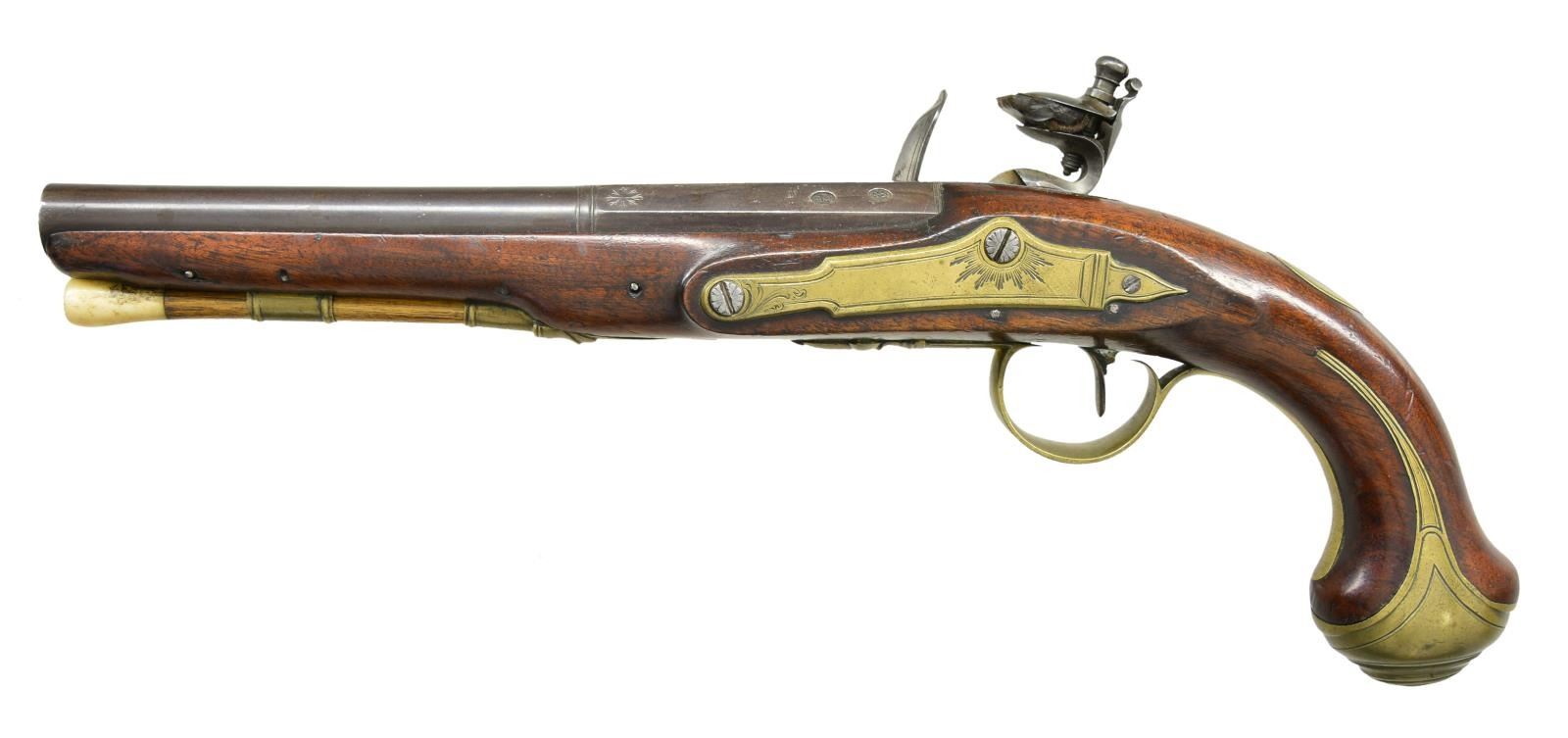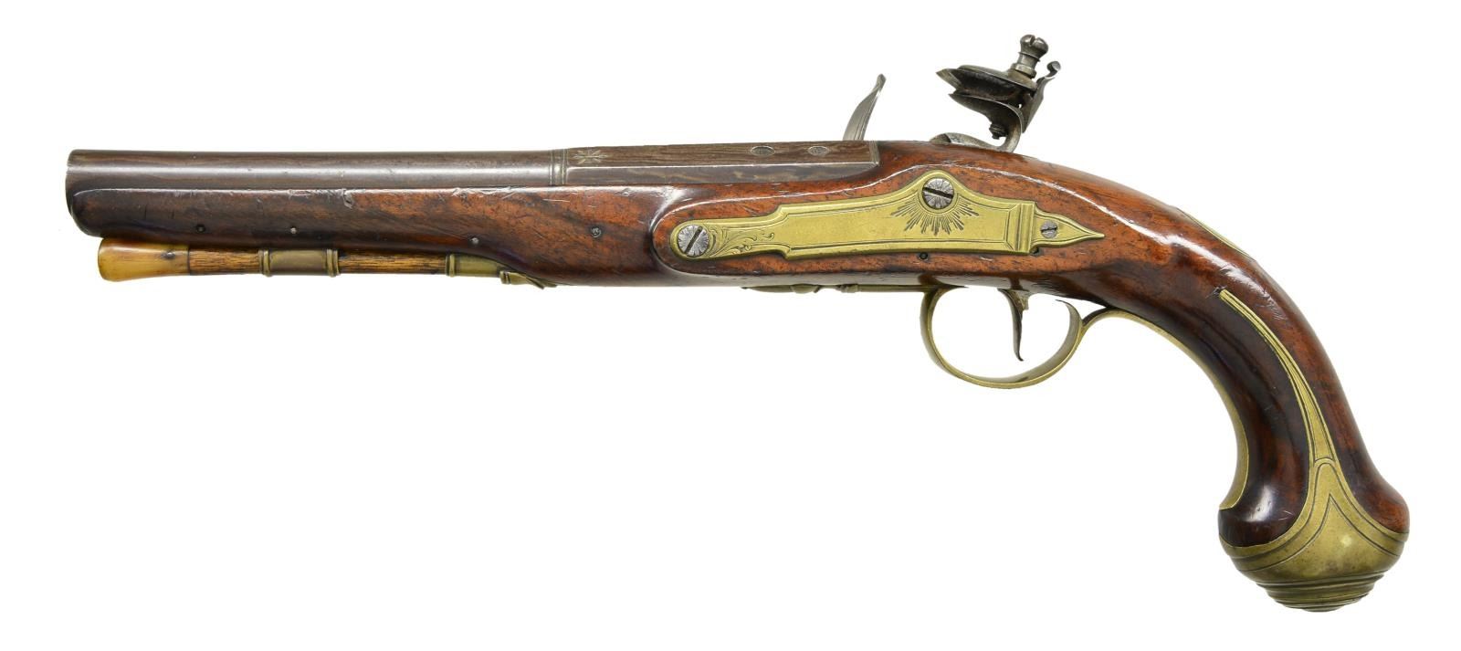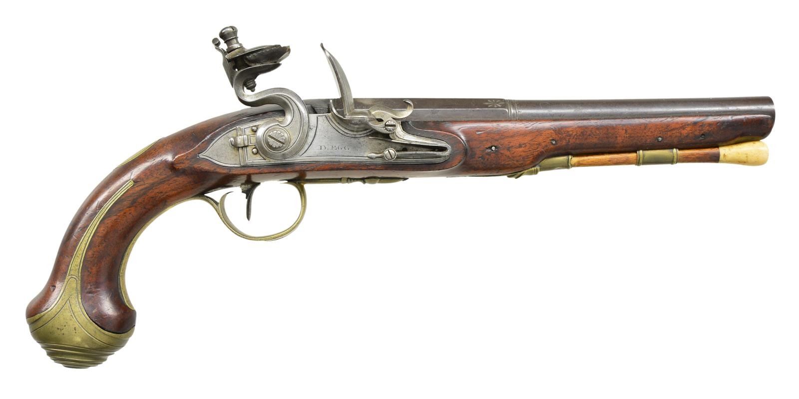 PISTOLS BY DURS EGG. Cal. 58 (pr.). S# NSN (pr.). Swiss born Durs Egg emigrated to England in the 1760's and worked for Henry Nock. He had formed his own business by 1772, was completely blind by 1822 and died in 1831. He was one of the most famous gunmakers of his day. These pistols were probably made in his early years at about the time of the American Revolution. They have 8" browned barrels which are octagonal at rear and transform through a wedding band to round with slightly flared muzzles. Top flats are engraved "D. EGG - LONDON" and London proofs are on top left flats. Barrels are not fitted with patent breeches. Tangs are engraved with spears, clubs and sheilds. Locks with slightly arched beveled plates and rebated tails are fitted with serpentine cocks, back sliding safetys, integral rounded pans, bridled friction frizzens and feather springs with spear finials. Locks are engraved with line borders and "D. EGG" in front of cocks. European walnut full stocks with knob grips are brass mounted. Trigger guards are of 1770-90 style with acorn finials. Heavy chamfered sideplates are one piece and grip heavy grip knobs have side spurs. Vacant ovals are on tops of grips and hickory ramrods with bone tips mount through single beaded pipes and matching thimbles. Stocks are pinned to barrels. CONDITION: very good. Barrels retaining most of an old rebrown showing some watered pattern to steel. Engraving on tops is slightly softened. Locks show bright polish over light pitting. Stocks with old oil refinish have many marks. Brass is nicely toned. Bores are good with some light pitting. Locks are fine. An attractive pair of British pistols probably dating from the revolutionary war period. (01-21799 (2)/MGM). ANTIQUE. $3,000-5,000.