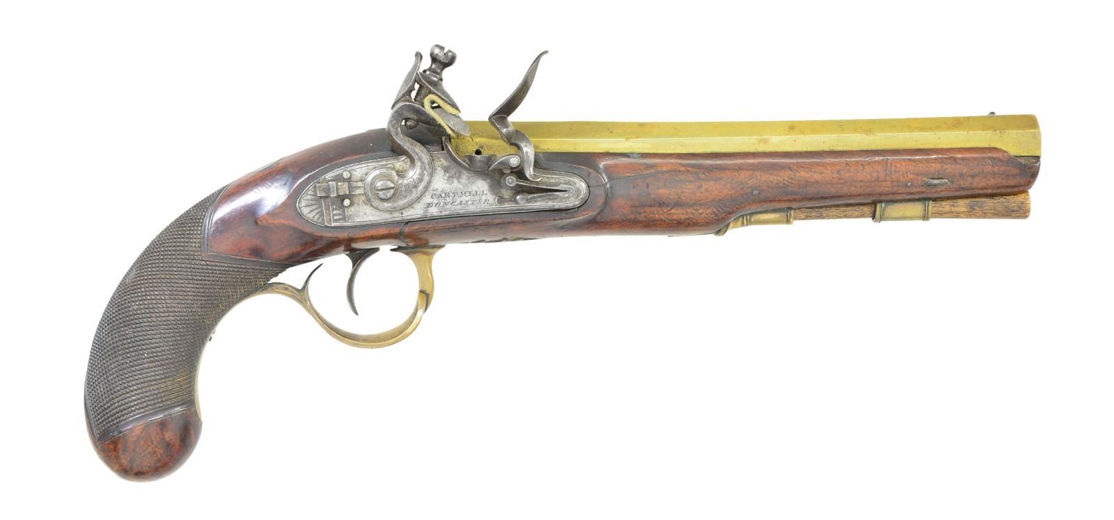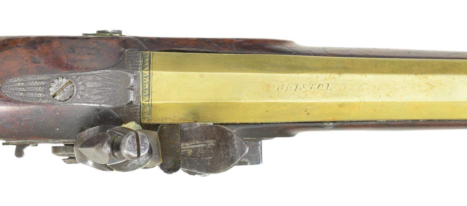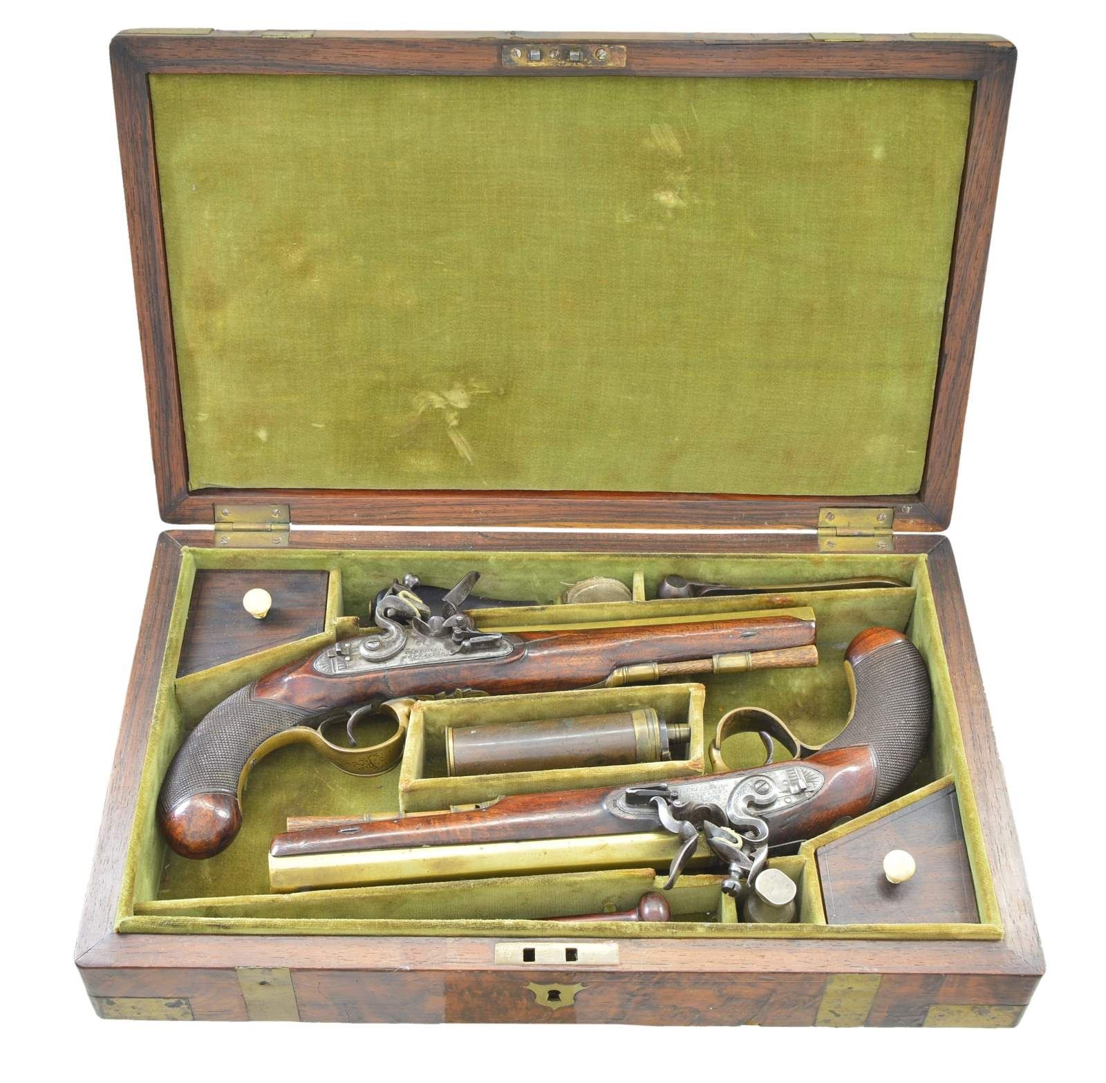 CARTMELL OF DONCASTER, YORK. Cal. 52. NSN. The 7 5/8" swamped octagon brass barrels without patent breeches are engraved "BRISTOL" on tops. Barrels are unproofed. Feather engraved breech irons have "V" notch rear sights. Locks with chamfered plates having rebated tails are fitted with back sliding safetys, serpintine cocks, semi waterproof pans, bridled frizzens and roller feather springs with spatulate finials. Locks have some feather engraving. Makers name and address are at centers. European walnut stocks with checkered bag grips extend to muzzles and attach to barrels with single captive sidebolts without escutcheons. Double beaded trigger guards with pineapple finials and shamrock sideplates are brass. Vacant silver ovals are at tops of grips and hickory ramrods are held by single beaded pipes and brass thimbles. UNATTACHED ACCESSORIES: pistols are housed in a cutlery type burl walnut veneered case with brass corners and trim. Fancy flush medallion on top is engraved with monogram "IS". Interior is lined in green velvet and contains copper bodied powder, ball and patch flask, rosewood and brass loading rod, ebony handled turnscrew, nutcracker type ball mould marked "35" and a Europeon type steel oil bottle. Two covered compartments with bone knobs hold balls, flint tin and key which operates lock. CONDITION: good to very good. Barrels and brass furniture with old cleaning are toning to gold. Locks cleaned to silver with dark gray splotches. Stocks retain most old oil finish possibly original, with a large number of marks. One pistol has crack at bottom center of lockplate which continues and up toward barrel channel, with old repair noted on left side. The other pistol shows stress crack and lifted wood above and to the front of sideplate. Bores are good. Locks are operable. Case is good with enhanced finish. Interior cloth is good with rubs, stains and marks. Pistols fit well, but wear in case is not commensurate with gun condition. (01-23016/MGM). ANTIQUE. $3,000-4,000.