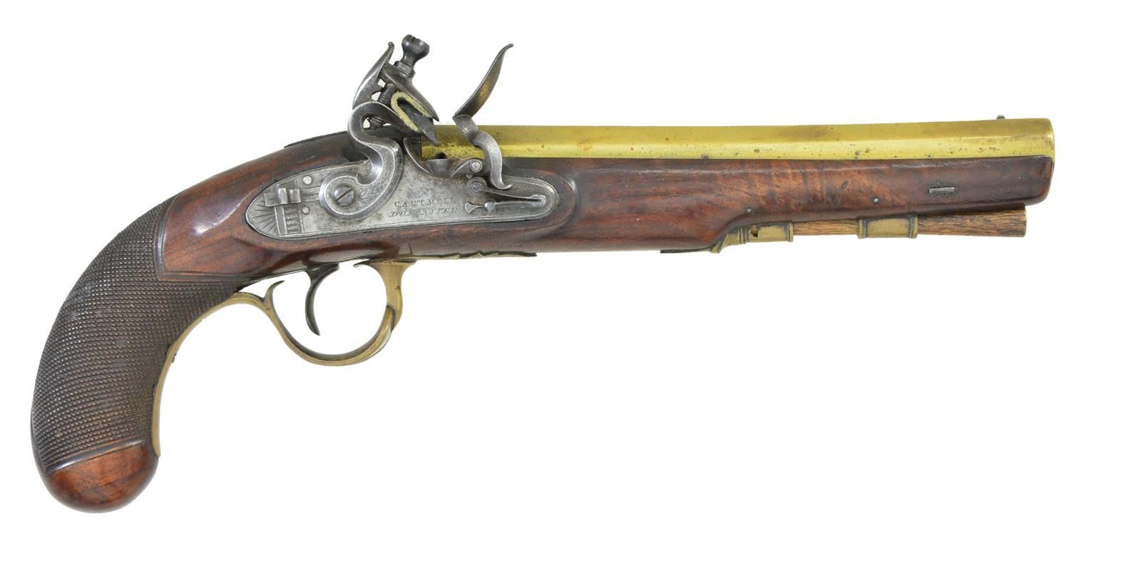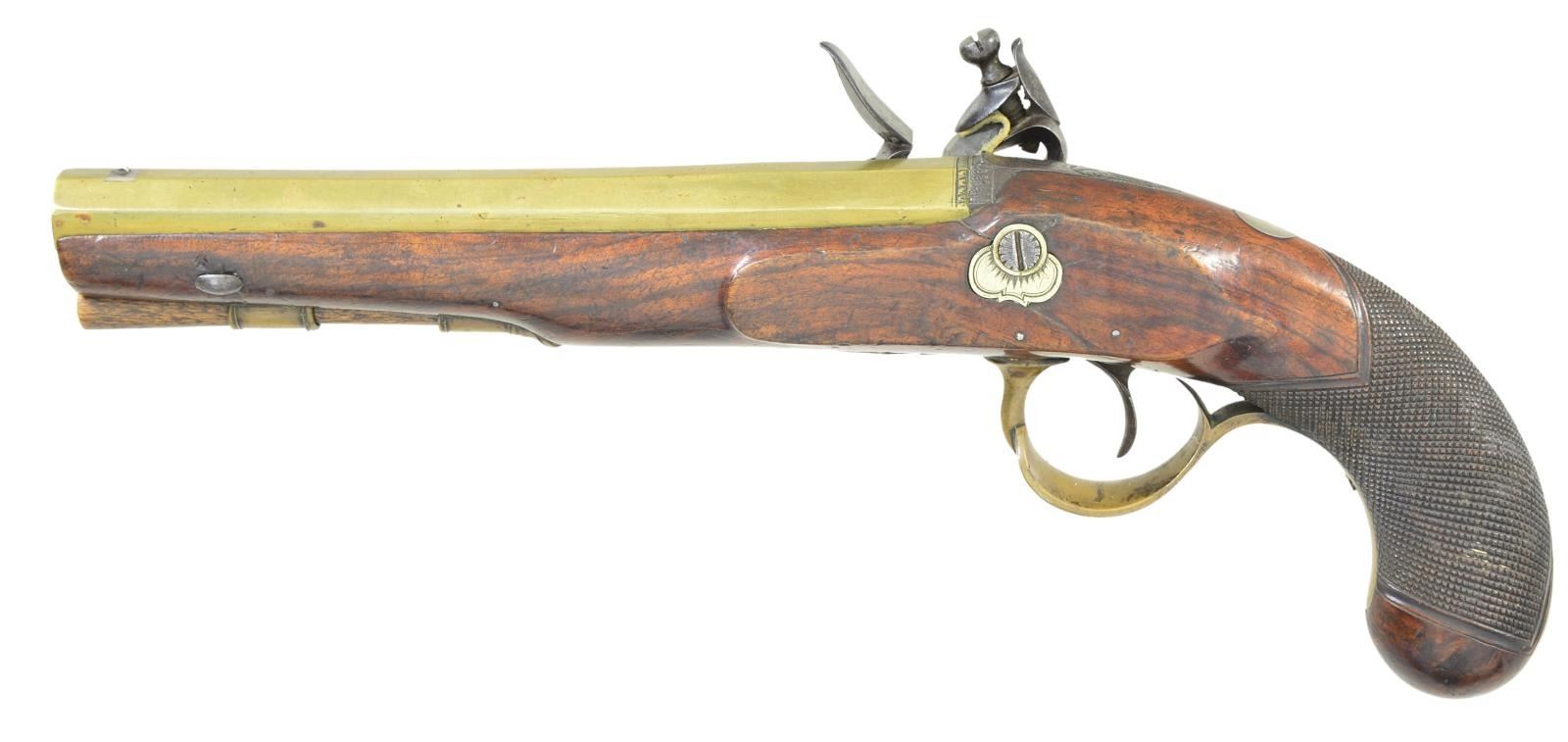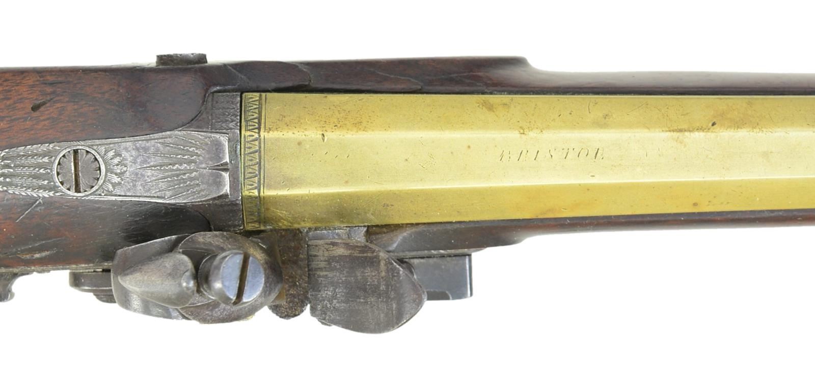CARTMELL OF DONCASTER, YORK. Cal. 52. NSN. The 7 5/8" swamped octagon brass barrels without patent breeches are engraved "BRISTOL" on tops. Barrels are unproofed. Feather engraved breech irons have "V" notch rear sights. Locks with chamfered plates having rebated tails are fitted with back sliding safetys, serpintine cocks, semi waterproof pans, bridled frizzens and roller feather springs with spatulate finials. Locks have some feather engraving. Makers name and address are at centers. European walnut stocks with checkered bag grips extend to muzzles and attach to barrels with single captive sidebolts without escutcheons. Double beaded trigger guards with pineapple finials and shamrock sideplates are brass. Vacant silver ovals are at tops of grips and hickory ramrods are held by single beaded pipes and brass thimbles. UNATTACHED ACCESSORIES: pistols are housed in a cutlery type burl walnut veneered case with brass corners and trim. Fancy flush medallion on top is engraved with monogram "IS". Interior is lined in green velvet and contains copper bodied powder, ball and patch flask, rosewood and brass loading rod, ebony handled turnscrew, nutcracker type ball mould marked "35" and a Europeon type steel oil bottle. Two covered compartments with bone knobs hold balls, flint tin and key which operates lock. CONDITION: good to very good. Barrels and brass furniture with old cleaning are toning to gold. Locks cleaned to silver with dark gray splotches. Stocks retain most old oil finish possibly original, with a large number of marks. One pistol has crack at bottom center of lockplate which continues and up toward barrel channel, with old repair noted on left side. The other pistol shows stress crack and lifted wood above and to the front of sideplate. Bores are good. Locks are operable. Case is good with enhanced finish. Interior cloth is good with rubs, stains and marks. Pistols fit well, but wear in case is not commensurate with gun condition. (01-23016/MGM). ANTIQUE. $3,000-4,000.
