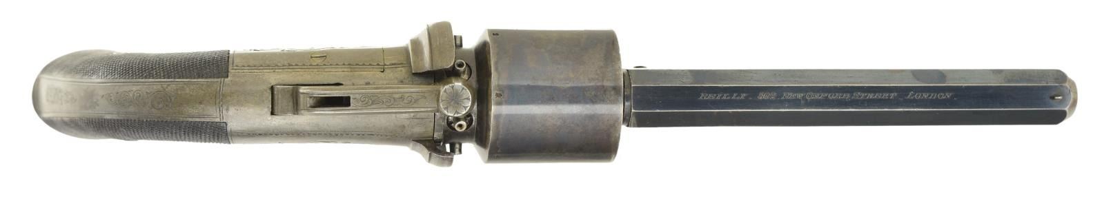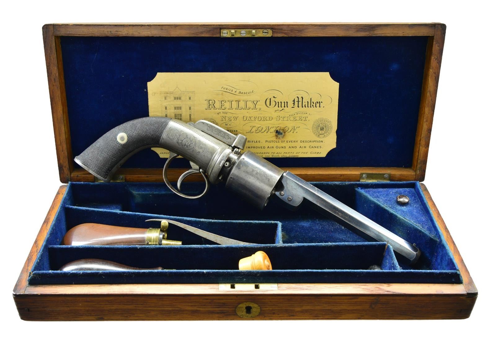 Cal. 48. S# NSN. This high condition early British revolver has blued 5 1/2" octagon barrel which attaches to pepperbox type frame with two screws through central axis pin. Top flat is engraved "REILLY 502 New Oxford Street, London". Case hardened six shot cylinder with Birmingham proofs has nipples shielded by frame in pepperbox style. Case hardened pepperbox type double action frame with top hammer is engraved with large shaded scroll flanked by smaller open scrolls. Two piece grips are fully checkered. UNATTACHED ACCESSORIES: revolver is housed in quartered oak case with key lock closure which has fancy shaped medallion on top engraved "TG" ?. Interior is lined in royal blue velvet and a large Reilly paper label is in lid. Bottom compartment is fitted for revolver and some good quality accessories including a bag shaped copper bodied powder flask, nutcracker type ball mould marked "54" with one leg shaped for tamping, a boxwood cap bottle, rosewood handled nipple wrench and a rosewood and brass loading rod. A covered compartment holds some cast balls. CONDITION: very fine. Barrel retaining over 60% original blue. Cylinder retains over 80% case hardening color which is quite vivid, action retains most of its case color which was never vivid and is actually gray in color. Bore is bright and shiny with congealed oil. Revolver does not appear to have been fired much if at all, nipples remain bright. Mechanically fine. Case is also fine with many marks and scuffs in original varnish finish. Interior cloth is very fine with some rubs and compressions. Label is fine with some marks and rubs, lightly foxed. Accessories run from very good to fine. A scarce and interesting early revolver in exceptional condition. (01-22257/MGM). ANTIQUE. $2,000-4,000.