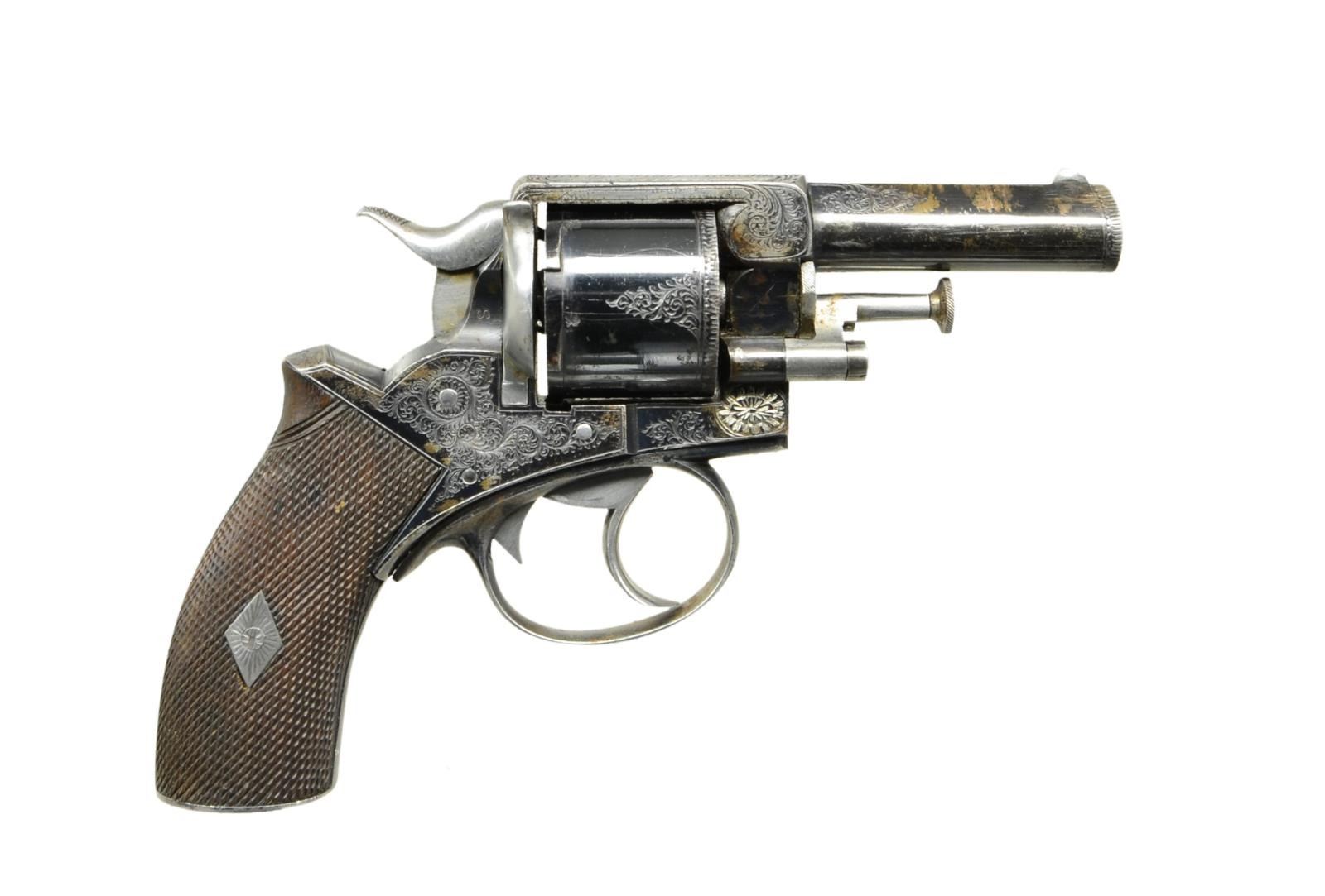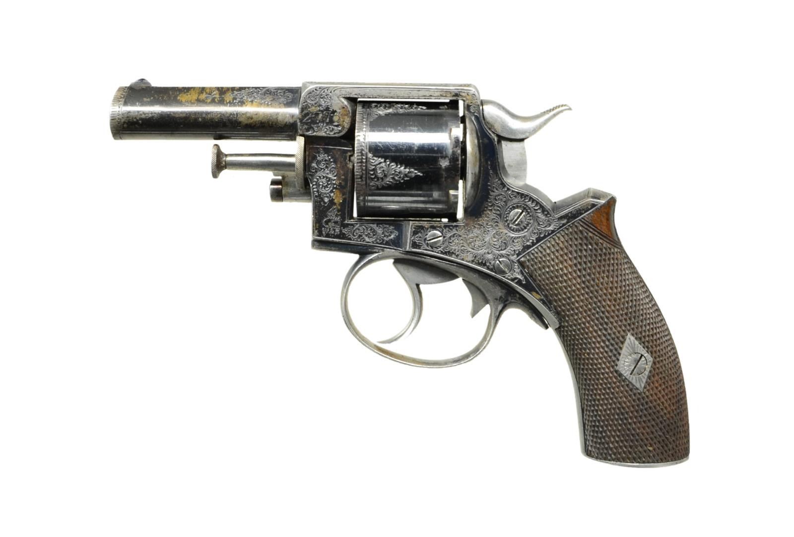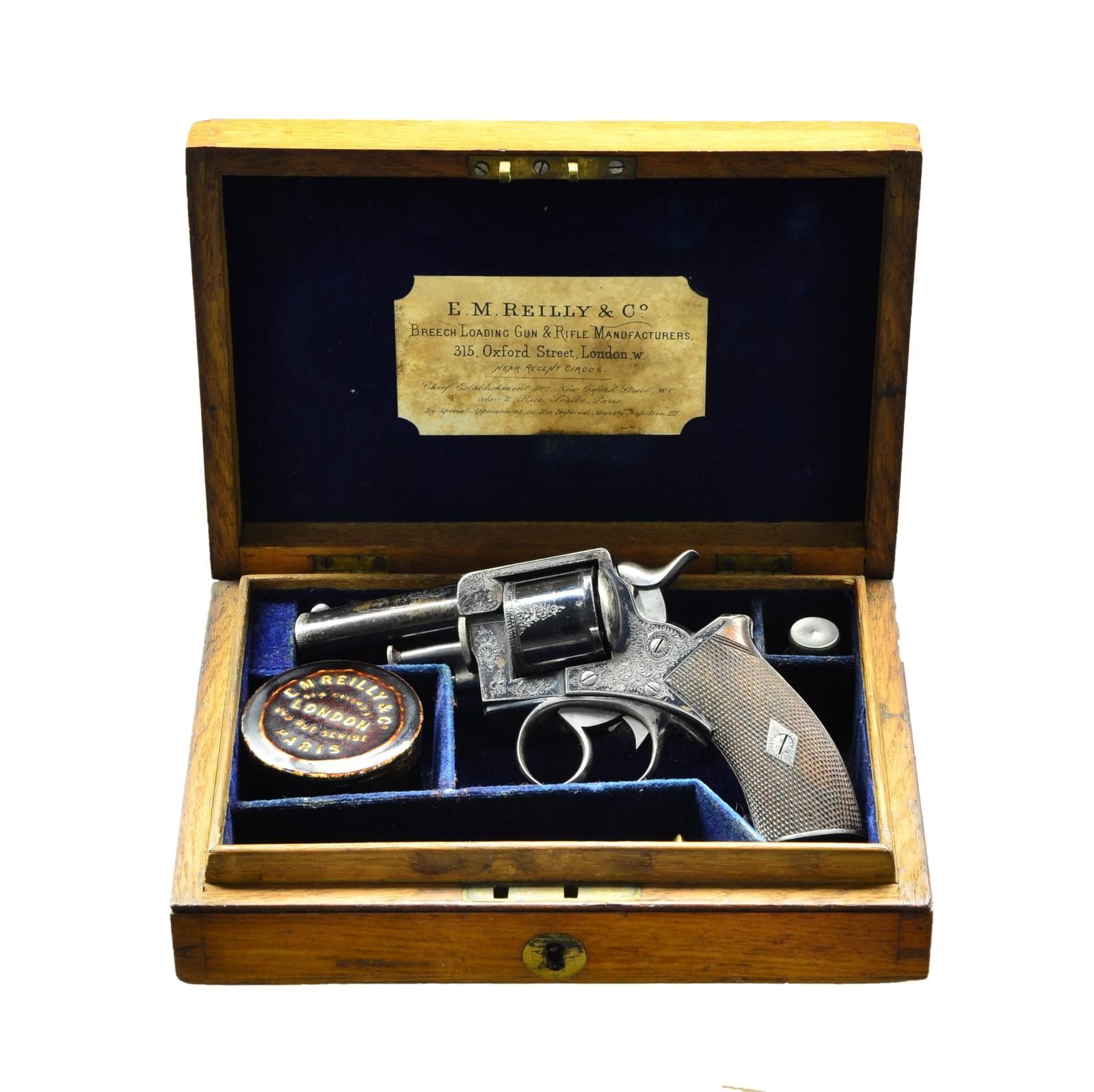 Cal. 32. S# 2776. This early Webley solid frame double action revolver has 2 1/2" ovate barrel. Unfluted cylinder indexes with ratchets at rear. A loading gate is on left side of frame. Cylinder removes in normal RIC manner. One piece checkered walnut grips have engraved steel cap without lanyard ring. Barrel, cylinder and action are blued, small parts are bright polish. Webley winged bullet logo is on left side of frame. S# is at rear of barrel on left. Revolver is engraved with about 70% coverage varying size scroll. Top of frame is engraved with retailer "E. M. Reilly & Co." "315 Oxford St. London". UNATTACHED ACCESSORIES: revolver is housed in its original oak case with key lock closure and circular brass medallion on top. Interior is lined in royal blue velvet and an E. M. Reilly label is in lid. Case contains large empty Japanned tin marked with E. M. Reilly info, a small pewter oil bottle, brass and steel cleaning rod and a key that does not operate lock. CONDITION: fine to very fine. Metal parts retaining 60-70% original blue, most loss appears to be from flaking. Grips and checkering are fine. Bore is shiny with some scattered pitting. Mechanically good. Case is also fine, retaining most of its varnish on exterior, brass is darkened. Interior cloth shows rubs and compressions with some areas worn through in bottom. Label is good considerably foxed. Accessories are good to fine. (01-22258/MGM). ANTIQUE. $1,500-2,500.