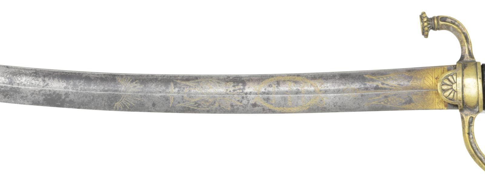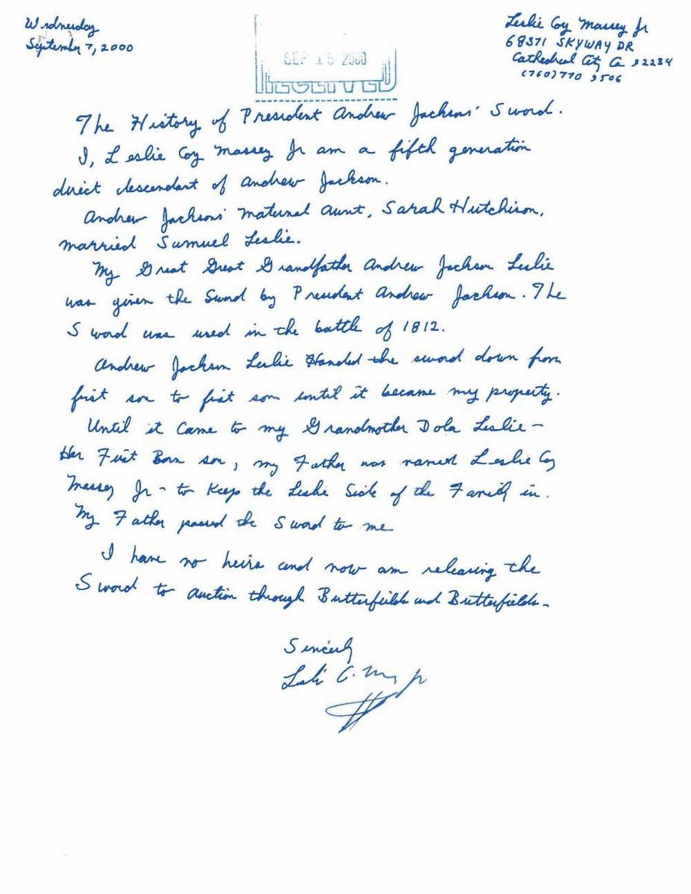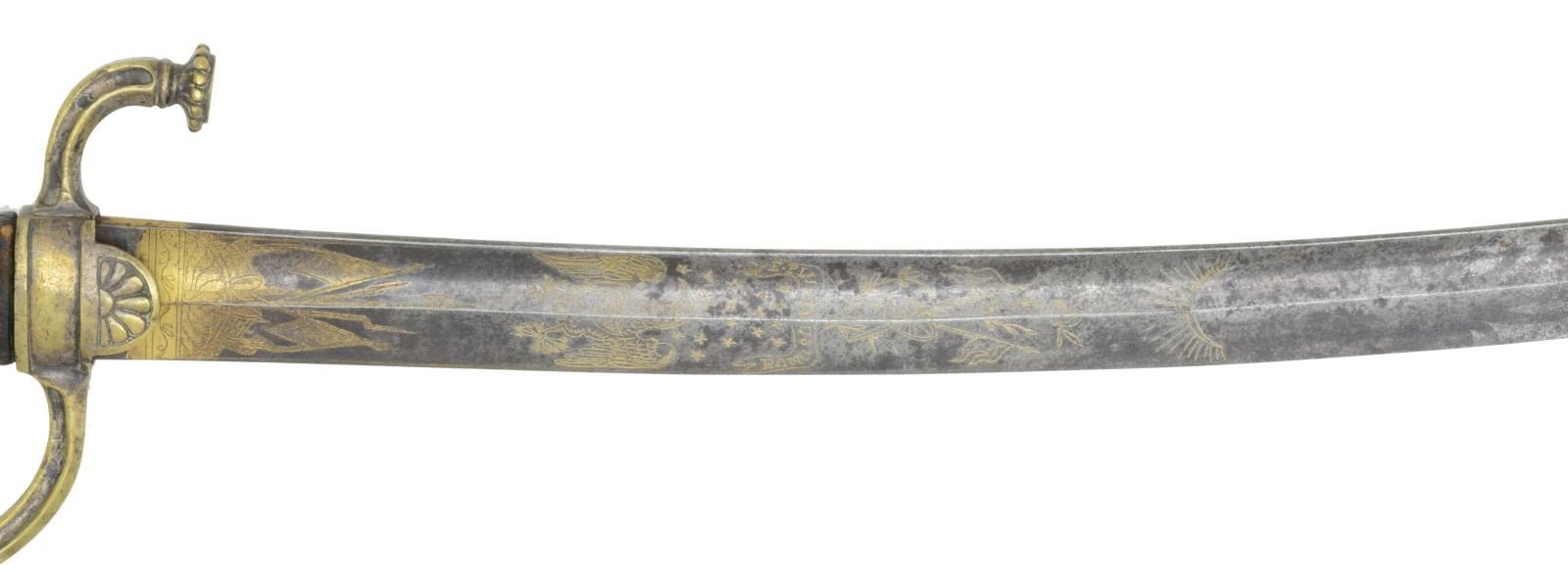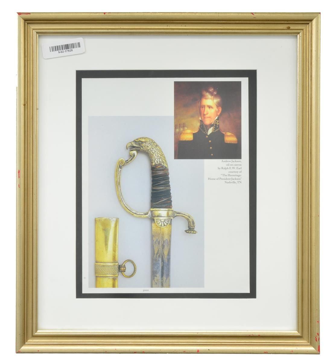 FAMILY OWNERSHIP HISTORY TO PRESIDENT ANDREW JACKSON. . Overall length: 40 3/4". Blade length: 33 3/4". This sword with direct descent in the family of President Andrew Jackson to a 5th generation descendant. All inheritors of the sword appear in the family tree, a copy of which is included. Additional documentation comprises a signed & notarized letter from 5th generation President Andrew Jackson descendent, Leslie Massey Jr., documenting the sword’s history and association with President Jackson. Blade has a single large fuller with gold highlighted etching on a blued field over 1/3 of its length. Etching includes various military motifs, including a large American eagle with 18 stars above and a large ribbon that reads “E. PLURIBUS UNUM”. There are also stands of American flags and a large wreath surrounding the words “honour and my country”. Silvered brass hilt with sharply downturned guard & medallion quillon. Classically formed knuckle bow with no embellishments. Exceptionally well-articulated eagle head pommel with beautifully sculpted feathers. Wire-wrapped leather grip. Silvered brass scabbard. UNATTACHED ACCESSORIES: a framed photograph of the sword with a portrait of Andrew Jackson. Notarized letters & family tree documenting the sword's descent in the Jackson family, together with a brief family history of the family. CONDITION: blade exhibits a medium gray, mottled patina. The etching remains quite sharp with substantial gold highlights remaining. Hilt is slightly loose with traces of the original silvered finish. Grip leather is approx. 90%, and grip wire is intact but out of its grooves. The scabbard with a few scattered minor dents and traces of original silver. The Andrew Jackson family eagle hilt represents an opportunity to acquire an example of the quintessential American sword with very plausible ownership by one of America’s most important Presidents. (02-17928/MRZ). $20,000-30,000.