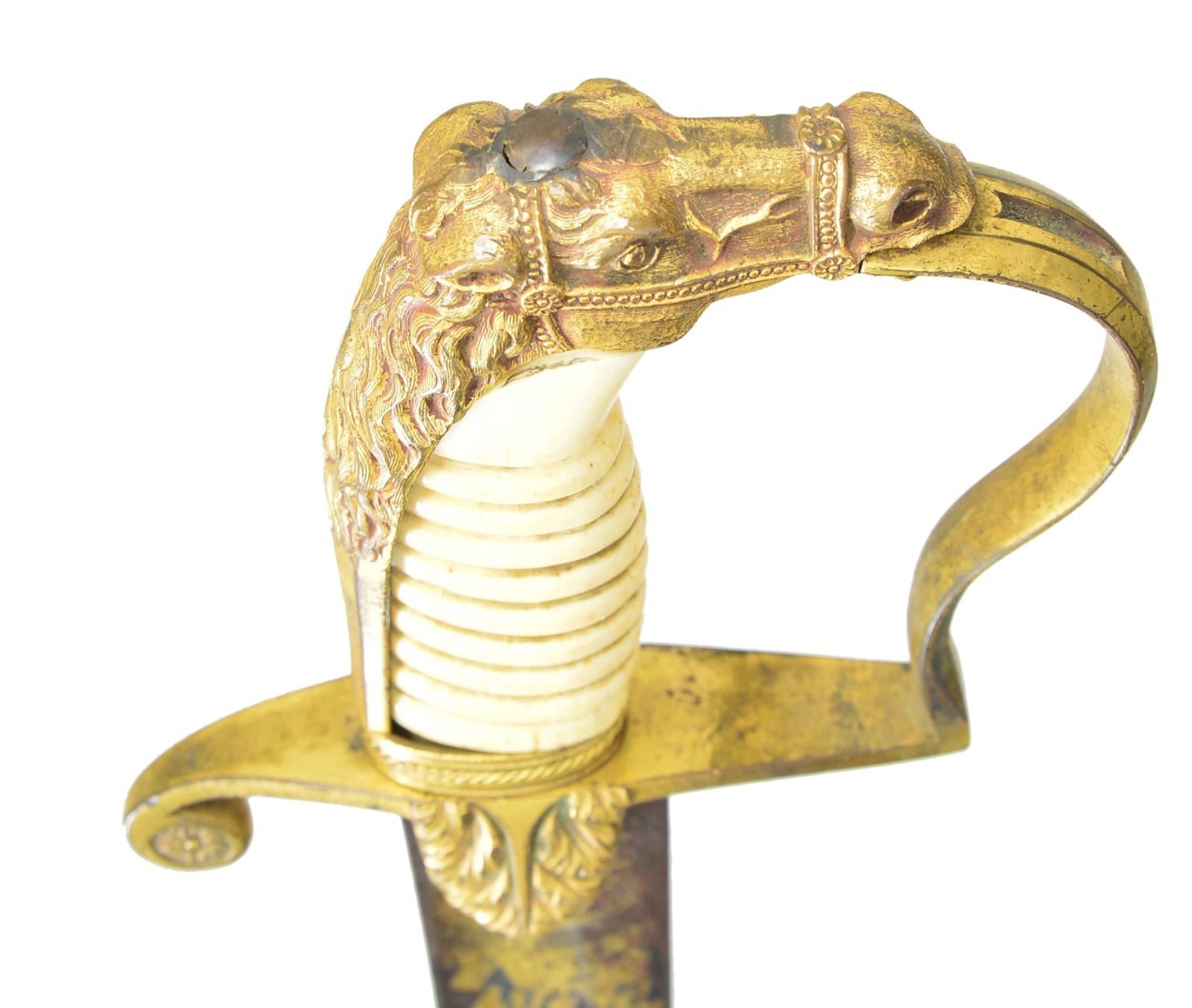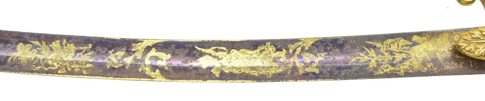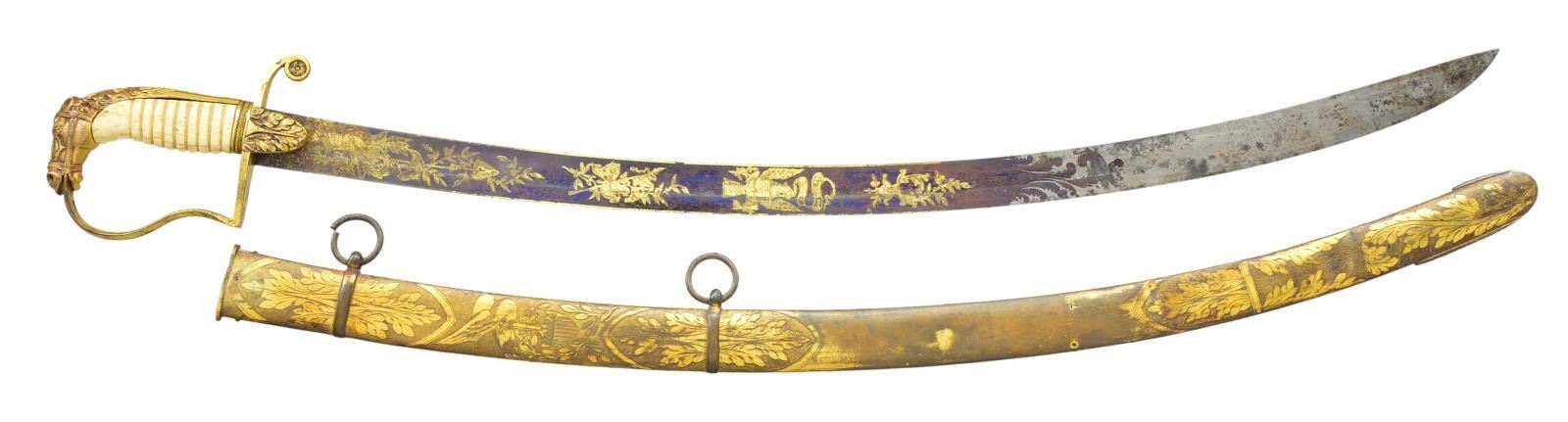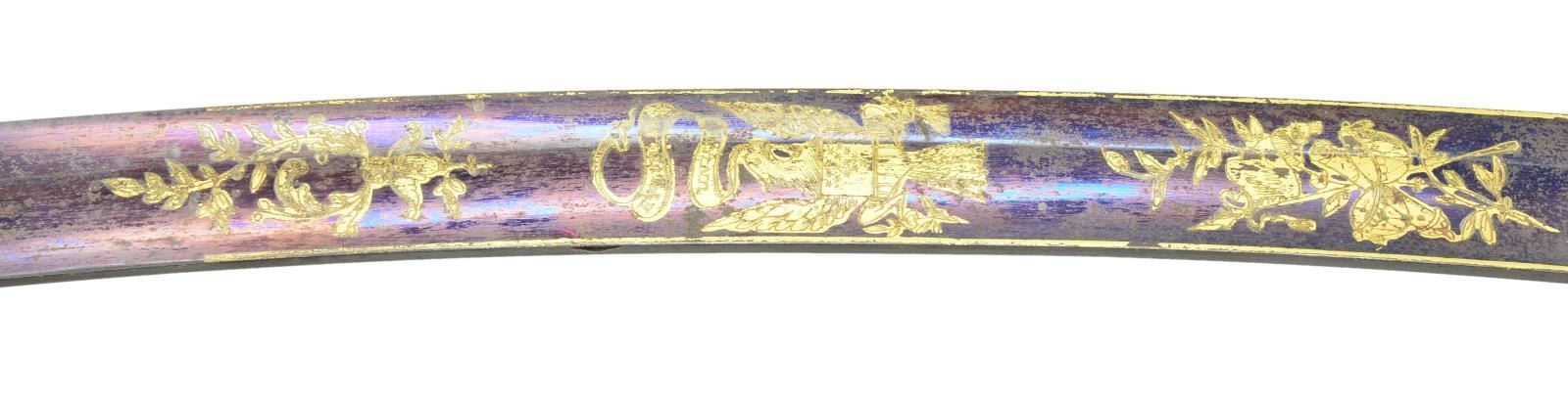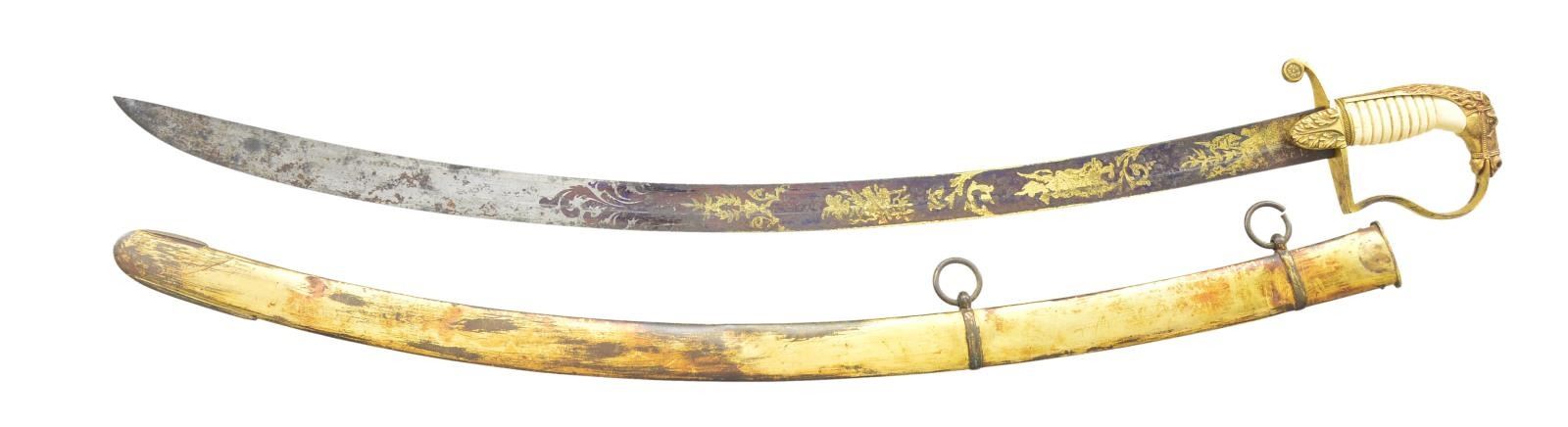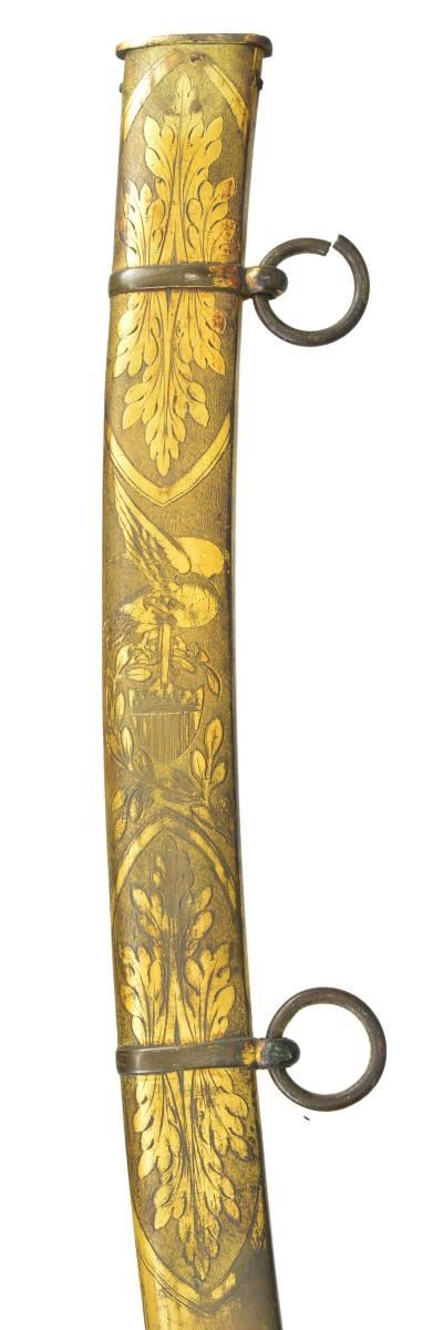 HORSE HEAD HILT. Overall length: 37 9/16”. Blade length: 31 1/2". Blade has a single wide fuller & gold highlighted etching on a blued field over 2/3 of its length. Etching includes foliate, patriotic & military motifs featuring a large American eagle, liberty cap on pole, & the goddess Liberty. Gilded brass hilt with oak leaf embellished languets. Plain guard with decorated disc quillon. Plain knuckle bow with a well-articulated horse’s head pommel with its mane extending more than half way down the backstrap. Bone grip with wire missing. Gilded brass scabbard engraved with oak leaves, an eagle & American shield. CONDITION: blade has a mottled overall patina with notable oxidation to the bluing & gilded etching. Corrosion is heavier near the ricasso. Hilt retains most of its original gilding. Grip shows a few tight cracks. Wire wrap is missing. Scabbard has several shallow dents and retains about 1/2 of its original gilding. (02-19232/BF). $3,000-4,000.