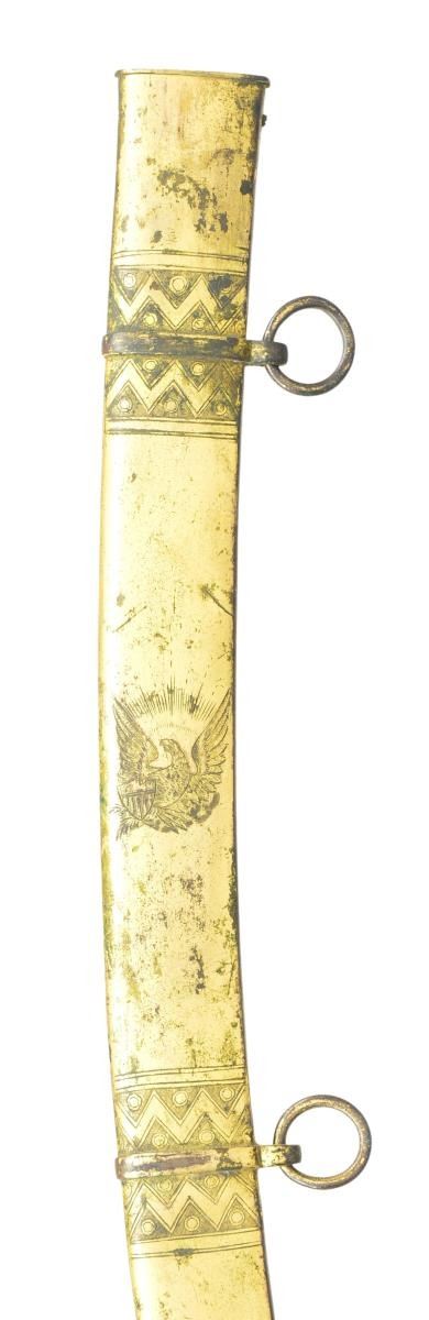 Overall length: 37 1/2". Blade length: 32". The tri-color blade has a single wide fuller and features a gold highlighted etched blade on a blued field over the first 17 1/2". The gold etching is separated by 2 etched white panels on each side. Gilded etching includes a large American eagle, liberty cap on pole, sprays of arms & foliate motifs. Gilded brass hilt with spade languets. Plain guard with disk quillon. Knuckle bow has a lobed motif with overlapping oak leaves. Laurel decorated backstrap terminates in a flourished bird’s head pommel. Carved bone grip. Gilded brass scabbard with etched geometric motifs & an American eagle. CONDITION: blade shows areas of original factory polish, but has significant oxidation near the hilt. Hilt has a dark oxidized finish mixed with areas of original gilding. Guard is very slightly misshaped. Grip is repaired near the pommel. Scabbard retains approx. 60% of its original gilded finish. (02-19192/BF). $1,400-1,800.