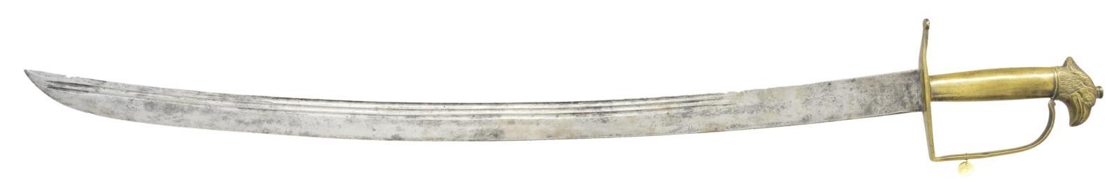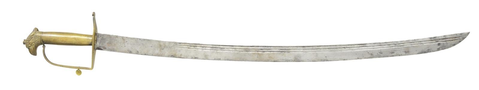 RESEMBLING A PRAHL. Overall length: 34 1/4". Blade length: 28 1/2". This sword has a 3-fuller German import blade of the Federal era. It has been mounted, likely in the Philadelphia area, with a solid brass hilt reminiscent of swords done by Prahl. The plain guard terminates in a rudimentary shell quillon. Plain knuckle bow enters the base of a brass Philadelphia style eagle head pommel. The grip is round in contrast to Prahl’s faceted grips. No scabbard. CONDITION: blade has a medium gray, lightly mottled patina. Hilt is a bit loose, but undamaged. Brass has a pleasing mellow mustard patina. (02-19202/BF). $1,200-1,800.