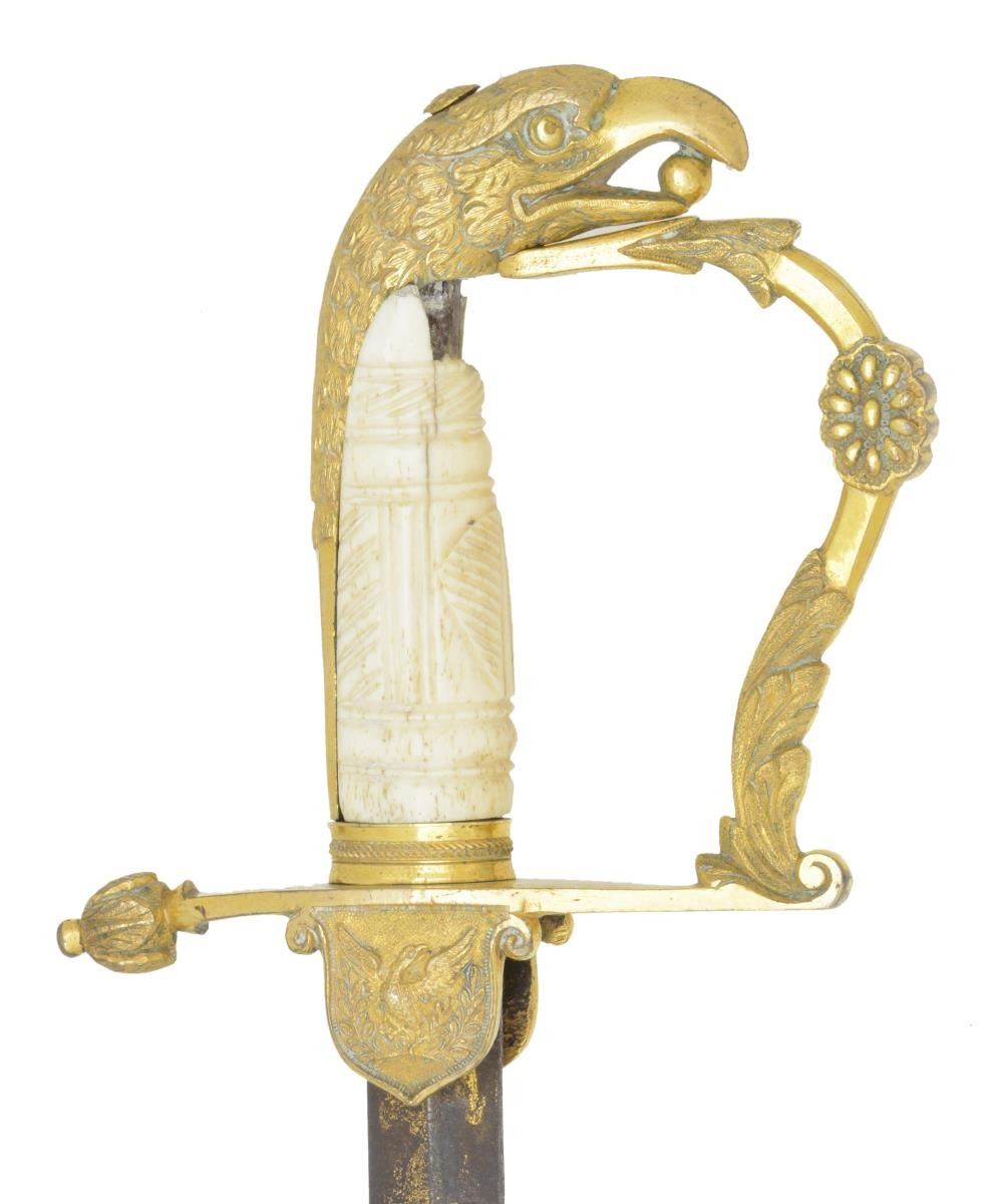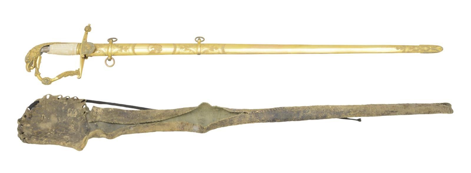 1) SWORD. Overall length: 34 1/2". Blade length: 29 1/4". Blade has a raised medial ridge and features gold highlighted etching on a blued field. Etching includes various foliate motifs and sprays of arms, one of which includes a Liberty cap on pole, American shield and a cannon barrel. Heavily gilded hilt features a raised wing eagle motif on the shield shaped languets. Quillon is nicely embellished with laurel leaves on 1 end of the crossguard. A stylish knuckle bow emanates from the opposite end of the crossguard. Heavy acanthus leaves and a central medallion decorate the knuckle bow. Graceful eagle head pommel with a ball in the eagle's beak. Eagle feathers extend over halfway down the faceted backstrap. Carved and decorated certifiably antique ivory grip. Very heavily gilded scabbard with decorative floral and geometric engraving on the front along with an artistically rendered raised wing eagle and shield between the scabbard rings. The sword is accompanied by its original period buckskin traveling case. The case is handmade and handsewn with a large flap at the top to cover the hilt. Family history since the 1820's has stated the sword was presented to General Andrew Jackson from some grateful citizens of New Orleans. It is maintained that the sword was given to Doyle O'Hanlon, or perhaps Andrew O'Hanlon, by Jackson himself. The sword has passed through generations of the O'Hanlon family to present day. UNATTACHED ACCESSORIES: a copy of a newspaper article with Andy O'Hanlon holding the sword during a Jackson Day celebration held annually on January 8th. A copy of a partial O'Hanlon family tree and information on Doyle O'Hanlon. CONDITION: the once tricolored blade has most of the white and blue field obscured by overall light oxidation. However, most of the etching remains clear and well gilded. Hilt is loose but retains nearly all of its original heavily gilded finish. The grip is missing a small section of ivory at the top that measures approx. 7/8" x 7/8". The scabbard shows very light wear overall and also retains virtually all of its original heavily gilded finish. The buckskin case shows heavy use but appears to remain substantially complete. The seam of the shaft is open over about 50% of the case. The upper flap, as well as its closing holes, are surprisingly intact. This case is a very rare survivor of its form as it was likely made on a plantation, miles from a professional sword cutler.