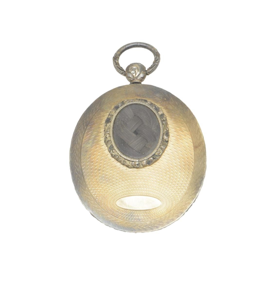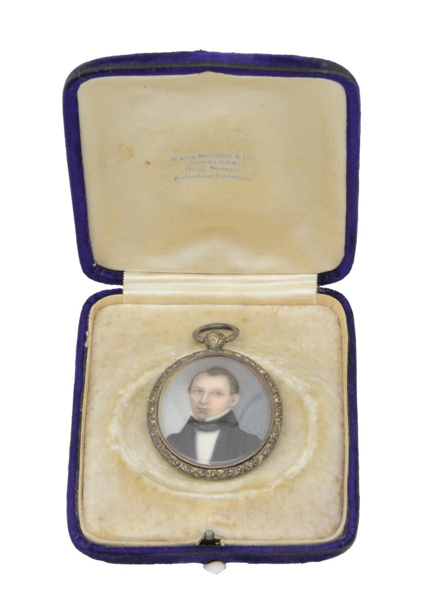 2) PORTRAIT. A wonderfully detailed portrait miniature pendant on certifiably antique ivory measuring approx. 2 1/2" x 1 1/2" including the suspension ring. The reverse of the pendant encloses braided hair presumably of the sitter. This portrait has accompanied the sword with the family as long as can be remembered. It is likely Andrew Jackson O'Hanlon of Fayetteville, NC who was the first recorded owner of the sword according to the family. O'Hanlon may have received the sword directly from Jackson or possibly from his father, Doyle O'Hanlon, who may have received it from Jackson. The pendant is housed in an early unassociated watch case with a Savannah, GA address. CONDITION: portrait is crisp with vibrant colors. The pendant is undamaged and shows a light overall tarnish. Hair is exceptionally well preserved. PROVENANCE: from Doyle O'Hanlon to Andrew O'Hanlon to George O'Hanlon to Issac O'Hanlon to Edward O'Hanlon to Andy O'Hanlon to A Florida Collector. (02-19440/BF). $2,000-3,000.