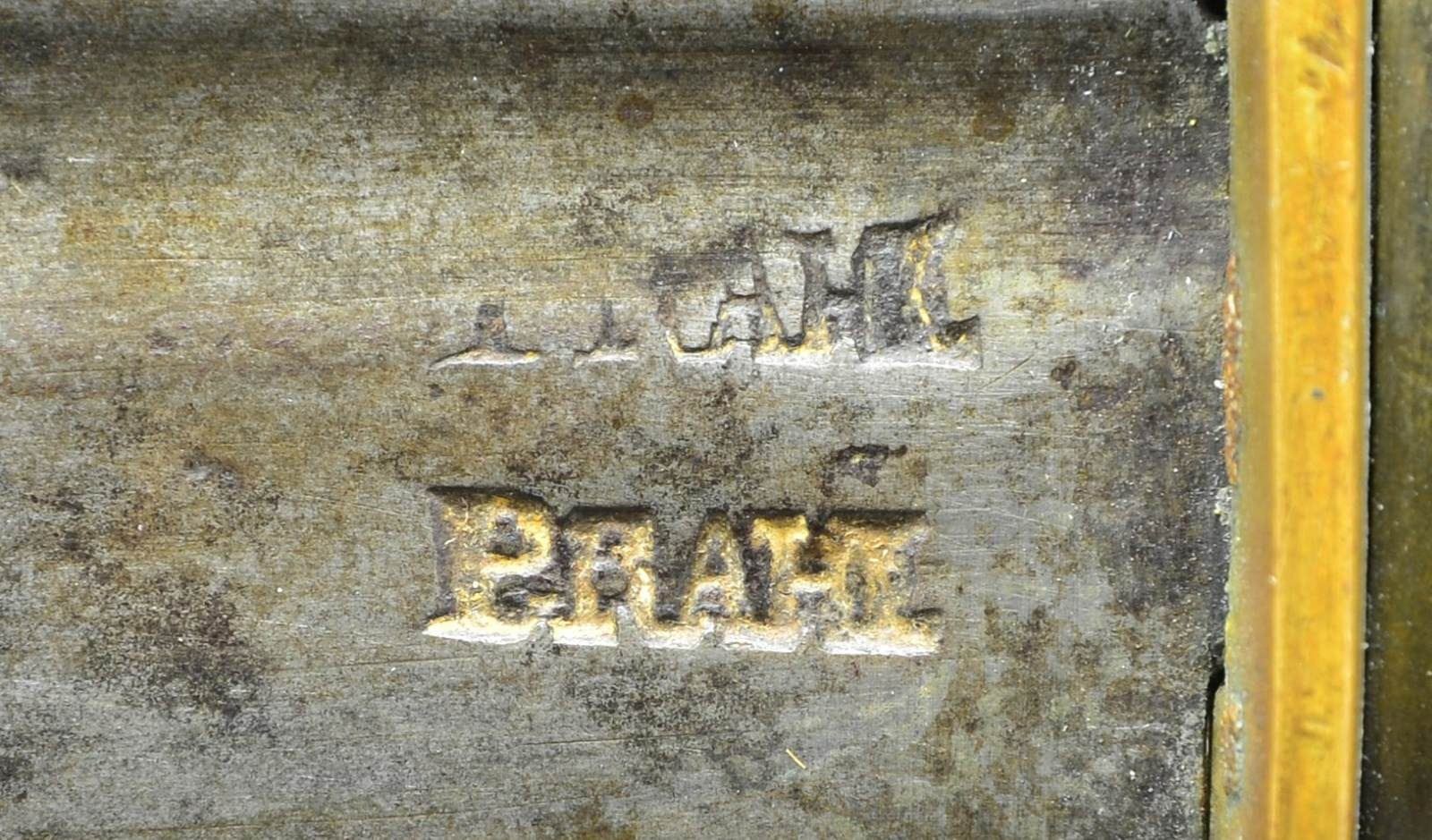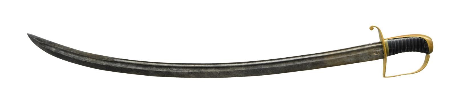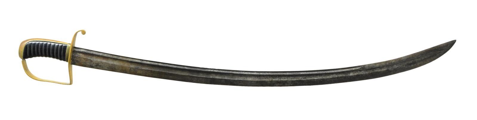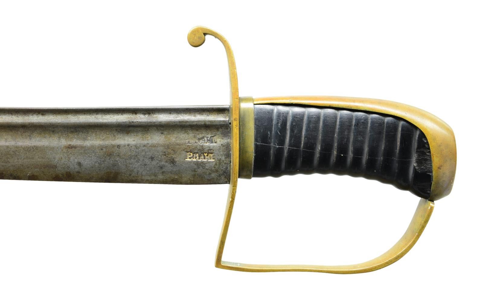 31.5” two fuller blade, 1.5” wide, stamped “PRAHL” lengthwise at ricasso, brass stirrup hilt, carved ebony grip. Louis Prahl of Philadelphia was among the first post-Revolutionary War American sword makers. All Prahl swords are rare and few examples are known of several patterns. CONDITION: very good to fine overall, blade has smooth gray iron patina, grip has several small chips & hairline cracks. (02-19212/JS). $2,000-3,000.