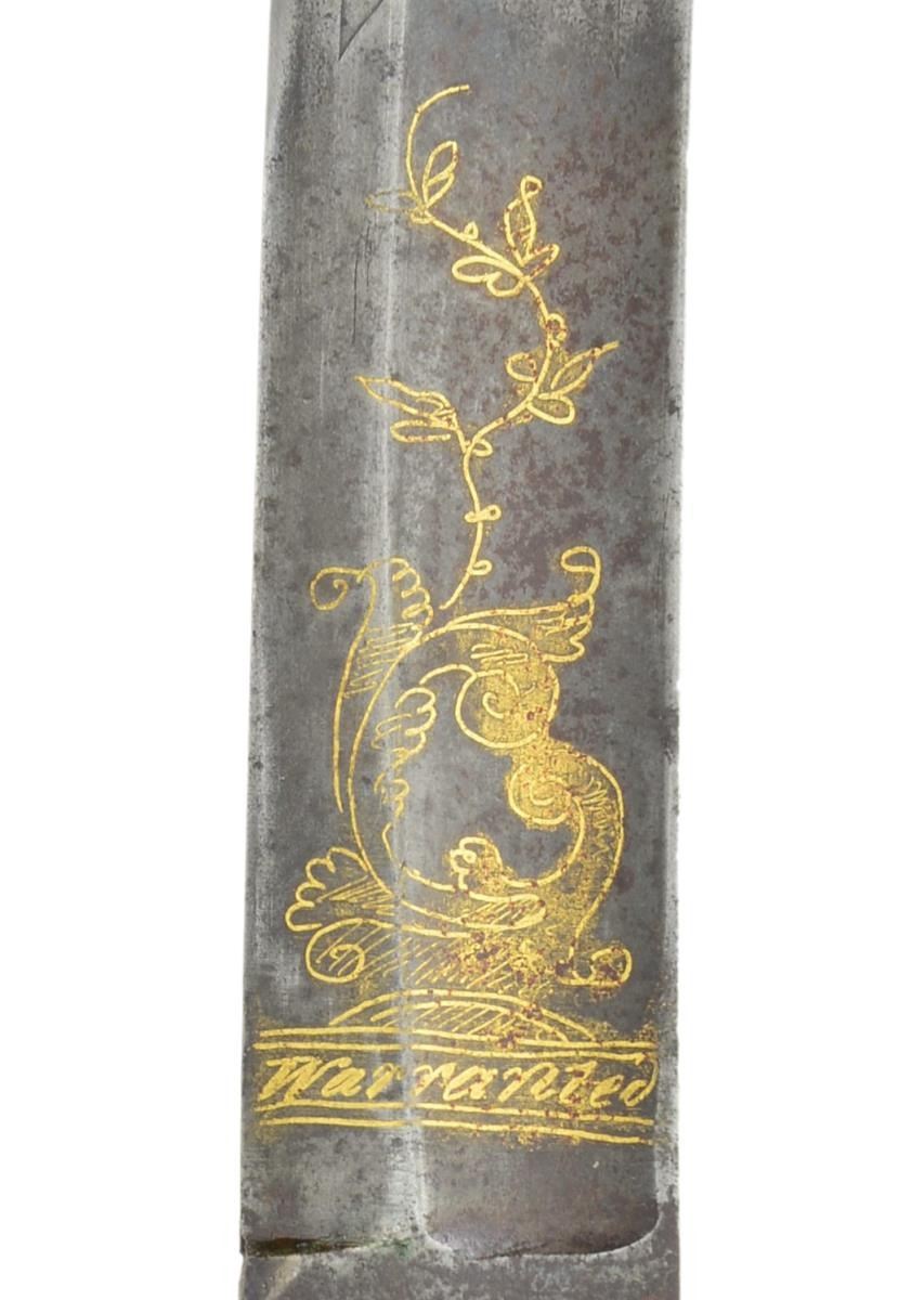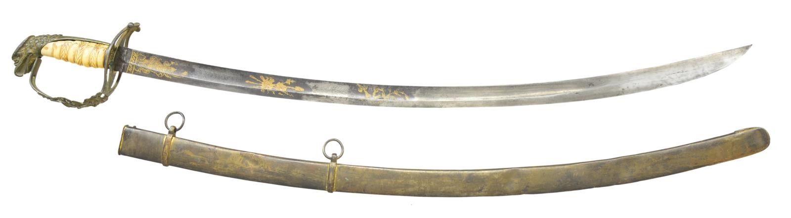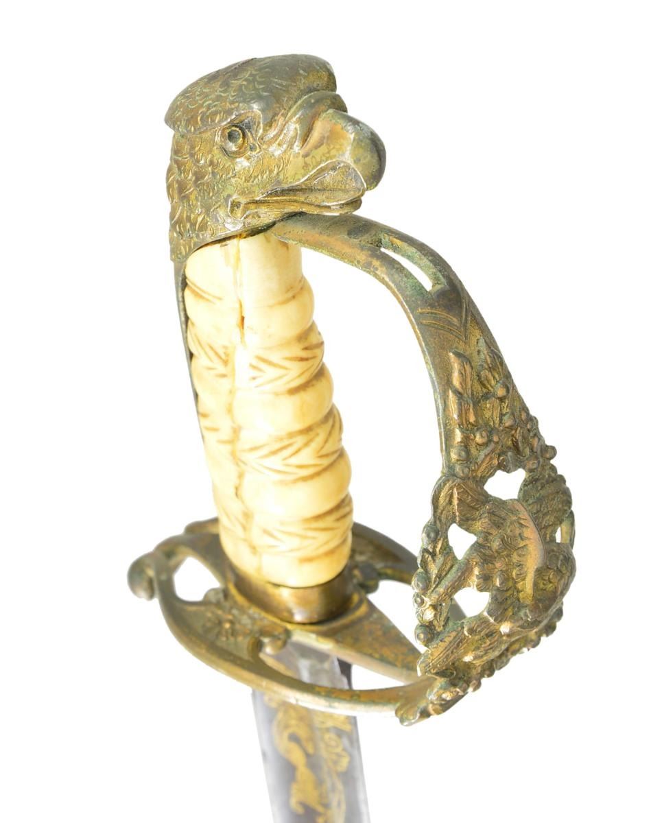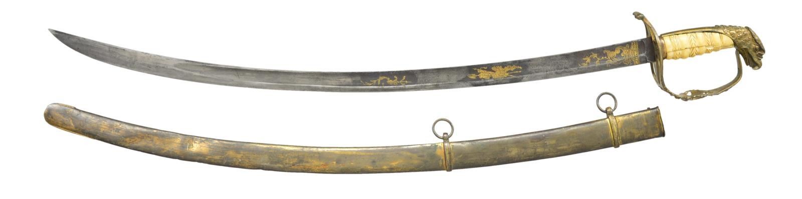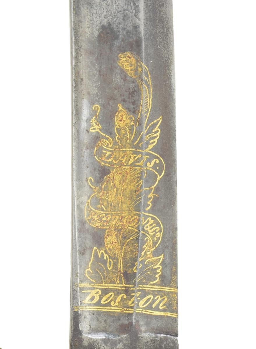 SABER. Overall length: 36 1/2". Blade length: 30 1/2". Tri-color blade has a single wide fuller with gold highlighted etching on a blued field over half its length. Etching includes sprays of arms & foliate motifs. There are 2 white panels on either side of the blade. Etched markings near the ricasso read “Warranted” & “DAVIS. WATSON & CO. Boston”. Gilded brass hilt with fanciful 4-slot guard. Heavily embellished knuckle bow featuring an eagle on rocks with laurel leaves. Well-articulated eagle head pommel with carved certifiably antique ivory grip. Gilded brass scabbard. CONDITION: blade has a medium gray patina with some wear to the etching & blued field. Markings remain quite clear. Hilt is solid and retains areas of original gilded finish. Grip is 97% complete, but has 2 severe cracks. Scabbard shows traces of original gilded finish with several shallow dents concentrated near the tip. (02-19191/BF). $1,500-2,000.