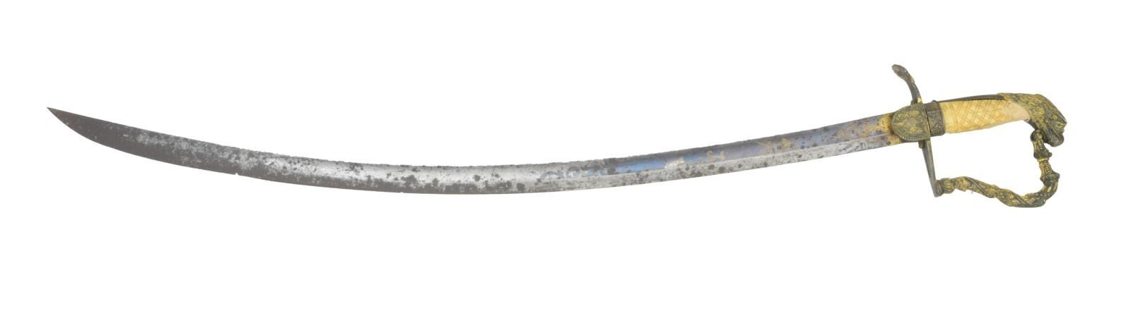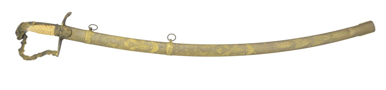 BY FREDRICK WILHELM WIDMANN OF PHILADELPHIA. Widmann produced some of the most iconic swords known to collectors of American edged weapons. He emigrated from Prussia in 1816 and produced swords until his death in 1848. This sword measures 37 3/8” overall with a 31 3/4" blade. Blade has a single wide fuller featuring gold highlighted etching on a blue field over the first 13” of the blade. Etching includes foliate & military motifs. Gilded brass hilt with a classic Widmann scallop shell quillon. Languets both have American eagles and the guard is stamped on the underside “F.W. WIDMANN PHILADA”. Highly embellished knuckle bow showing acanthus leaves intwined by a beaded string. Well-formed eagle head pommel, plain backstrap & classic Widmann ferrule showing a grapevine motif. Carved certifiably antique grip. Gilded brass scabbard showing oak leaves, stars and 2 monumental American eagles with raised wings. The suspension loops bear the typical Widmann grapevine motif. The back of the scabbard is boldly stamped “F.W. WIDMANN PHILADA”. CONDITION: the blade retains more than 50% of the gold highlighted etching & blued field. The balance of the blade has spotty oxidation and there is some pitting near the tip. The edge has one significant nick 7” back from the tip. The hilt is a bit loose, but is structurally solid. A significant amount of gilded finish remains on the hilt. The grip has expected age cracks and has a 1 1/4" repair near the pommel. Scabbard has gold remaining in the protected areas with the remaining parts of the scabbard a mellow mustard patina. (02-19223/BF). $1,200-1,800.