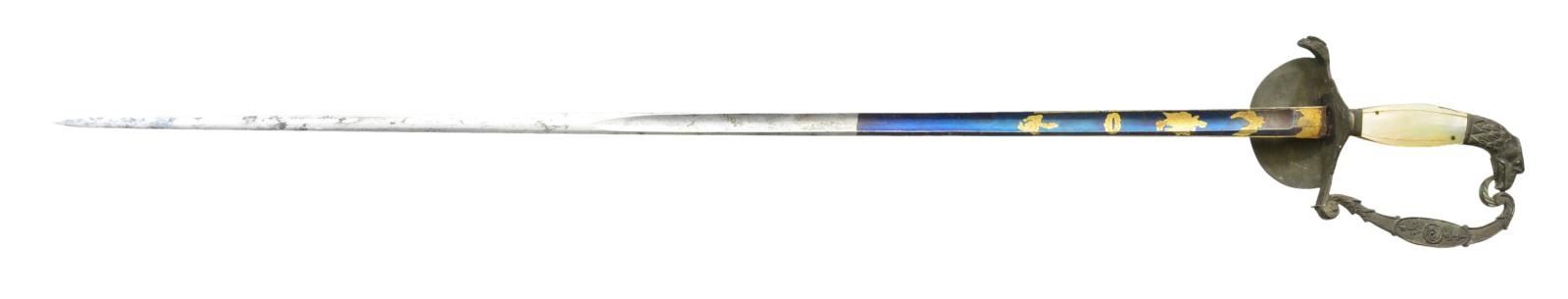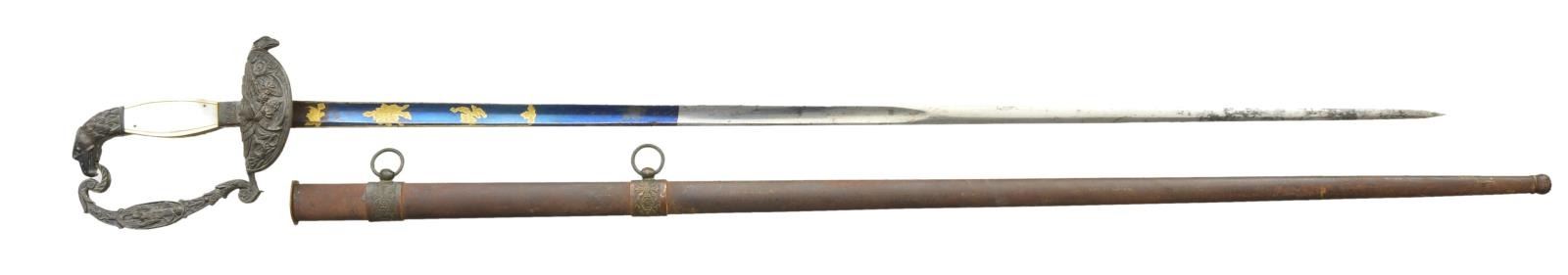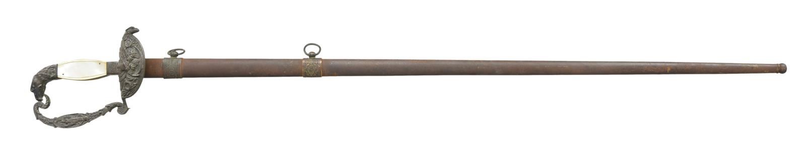 Overall length: 38”. Blade length: 31 3/4". Blade has a single wide fuller with the first 11 1/2" having a blued finish with gold highlighted etching. Etching includes various military & foliate motifs. Gilded brass hilt with an eagle head quillon. Downturned guard features an American eagle perched on an anchor. Decorative knuckle bow has a central oval with a winged victory. Eagle head pommel. 2-Piece mother of pearl grips. Brass mounted iron scabbard. CONDITION: blade is quite nice with vibrant blue & gold highlights. Hilt is a bit loose and has a very dark patina with virtually no evidence of original gilding. Grips have a tiny bit of chipping on the edge. Scabbard has an oxidized finish, but is undamaged. (02-19228/BF). $500-700.