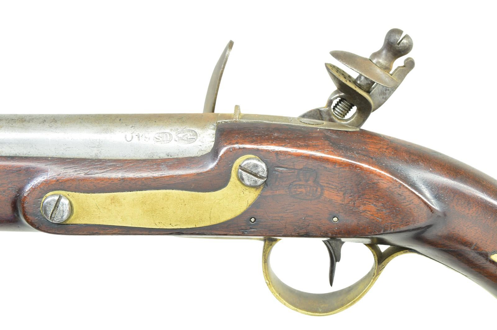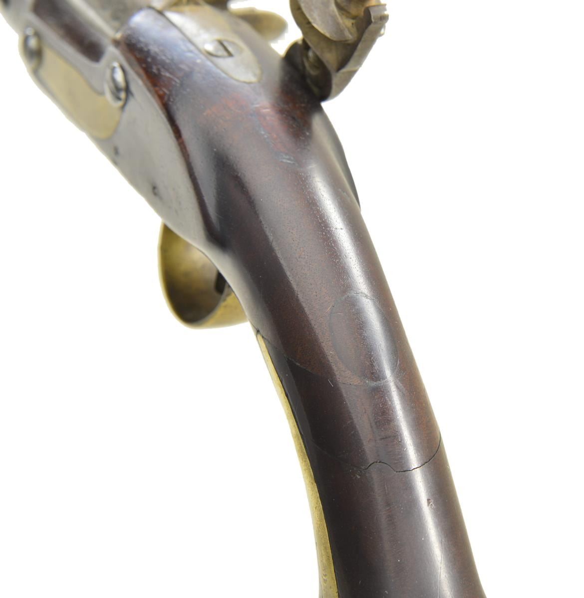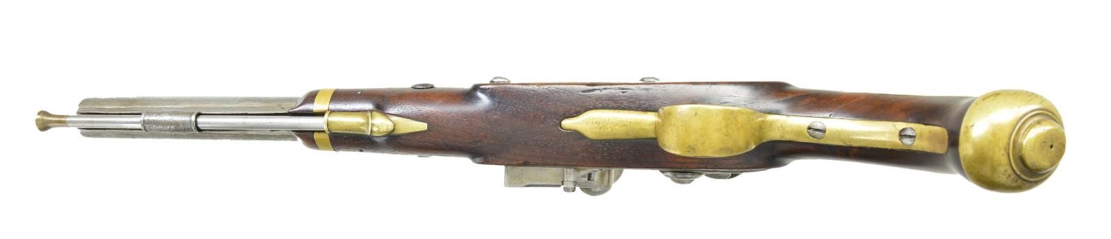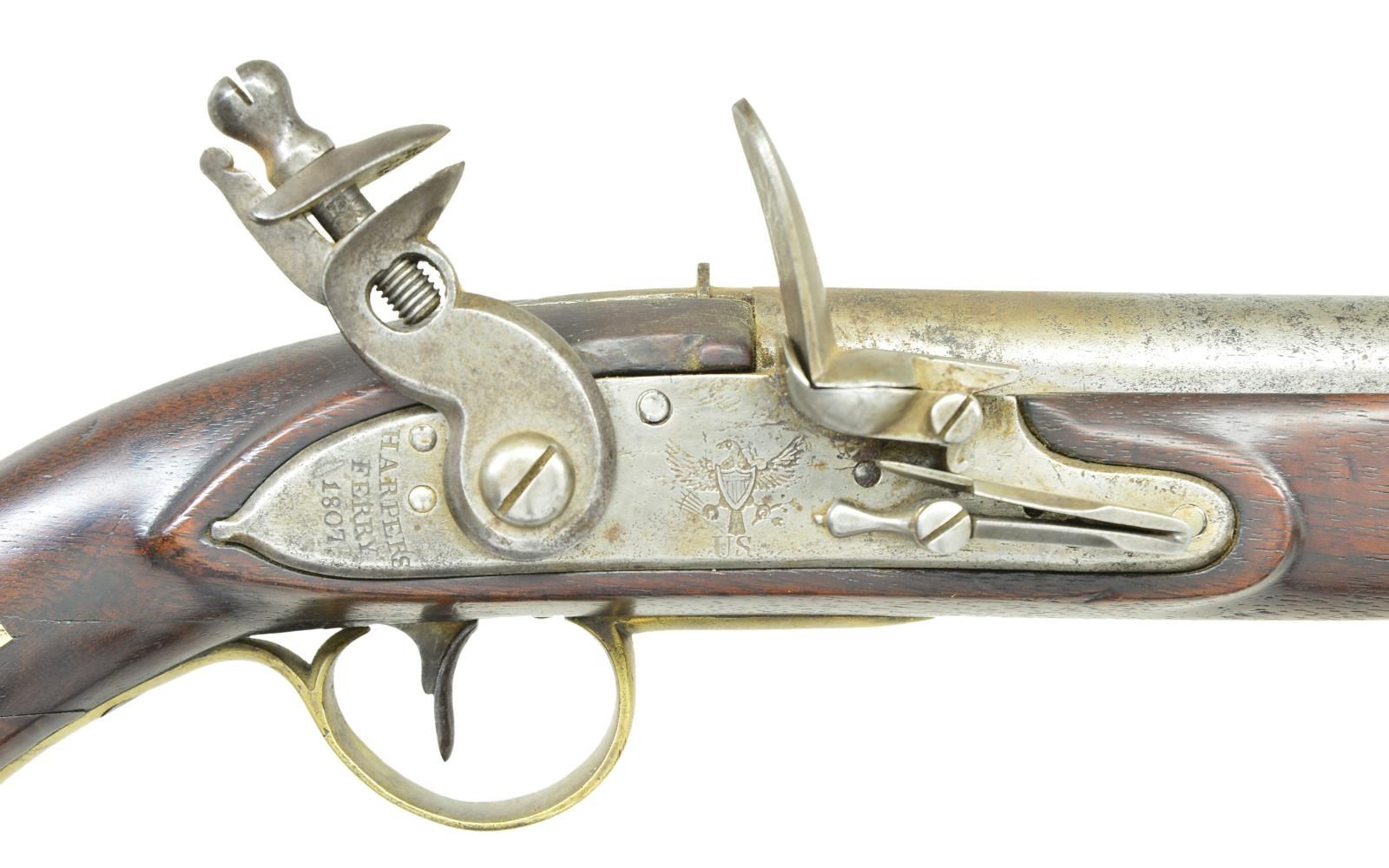 Standard configuration of pattern: 10” round barrel, breech proofed on left: “eaglehead/P”, “US” and stamped S# 640. Lock is marked “HARPERS / FERRY / 1807” in vertical arcs behind cock. Under the integral round bottom pan is a spread winged eagle facing left over “US”. Walnut stock inspected opposite lock “V / CW” (Charles Williams). This gun is from Southern estate & not listed in "Harpers Ferry Arsenal and Joseph Perkin The Classic Arms of the Early Years", 2012, Hudak. CONDITION: good overall, apparent reconversion back to flint from percussion. Appears complete and original other than replaced ramrod. Stock is sound with discernible cartouche, has old screwed & inset repair where wrist was broken. Iron cleaned, mottled gray patina, markings all discernible, S# 640 worn, right wing tip freshened, mechanics function, clear smooth bore. Regardless of professional restoration, an attractive example. (01-23296/JS). $5,000-7,000.