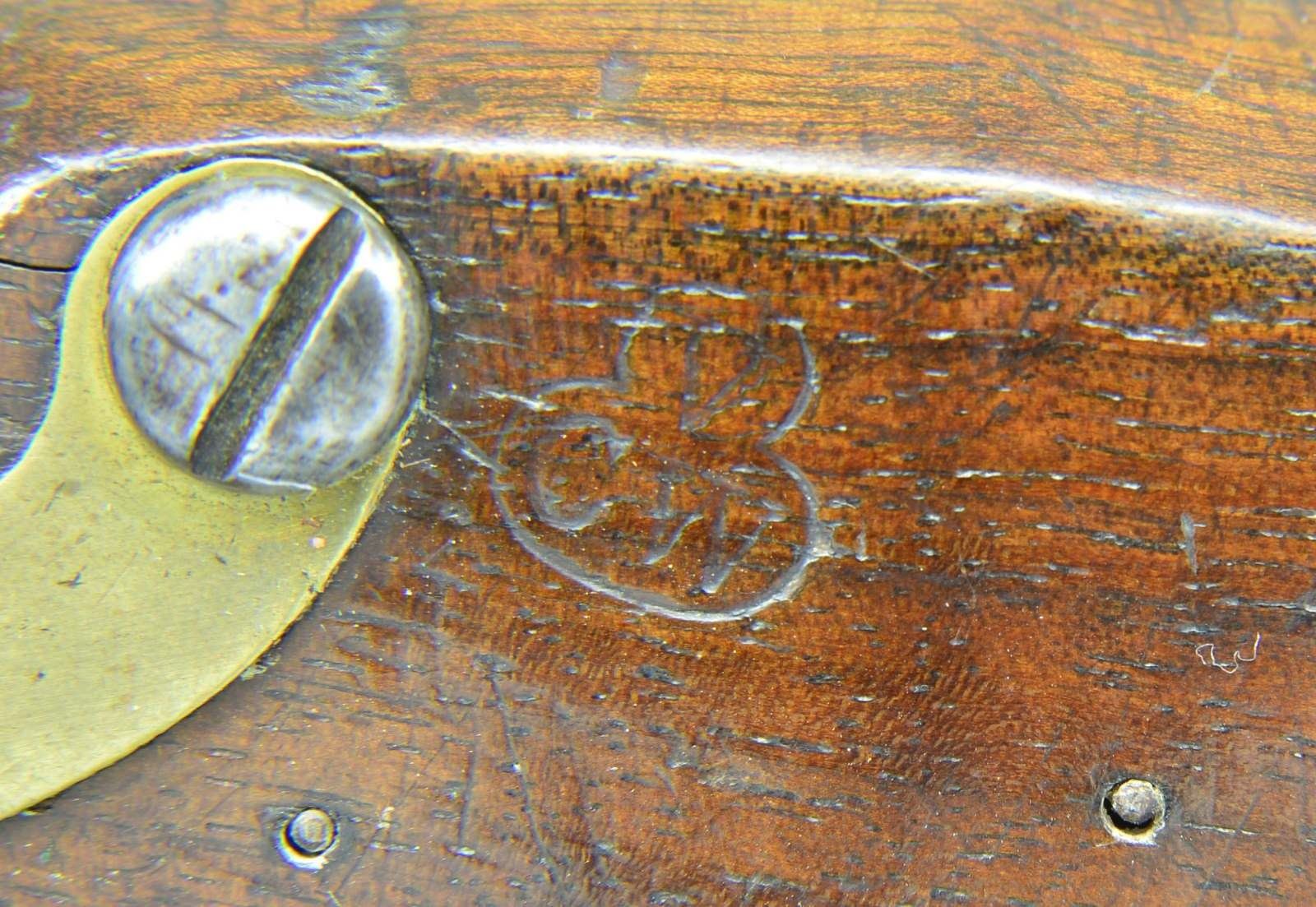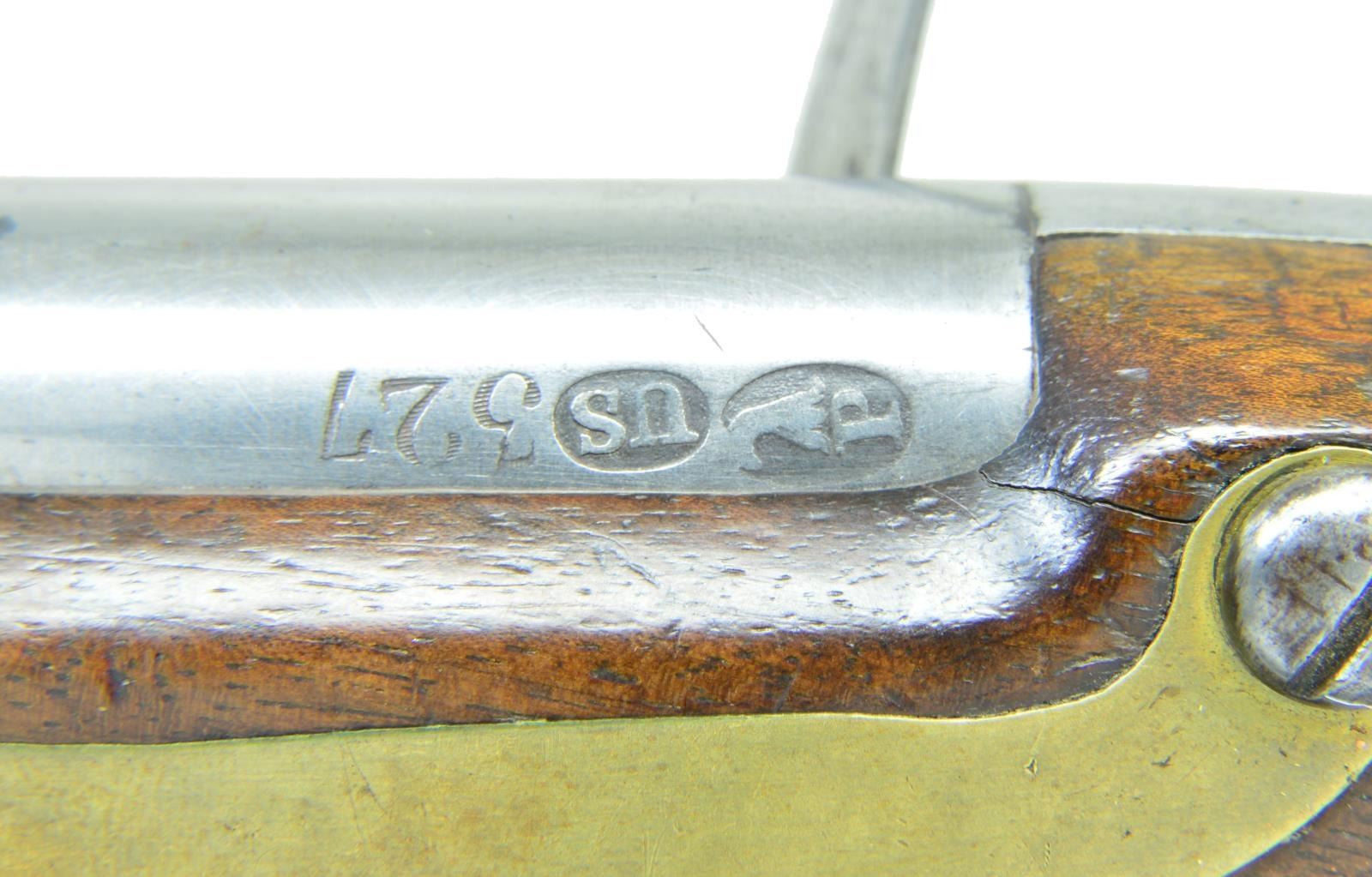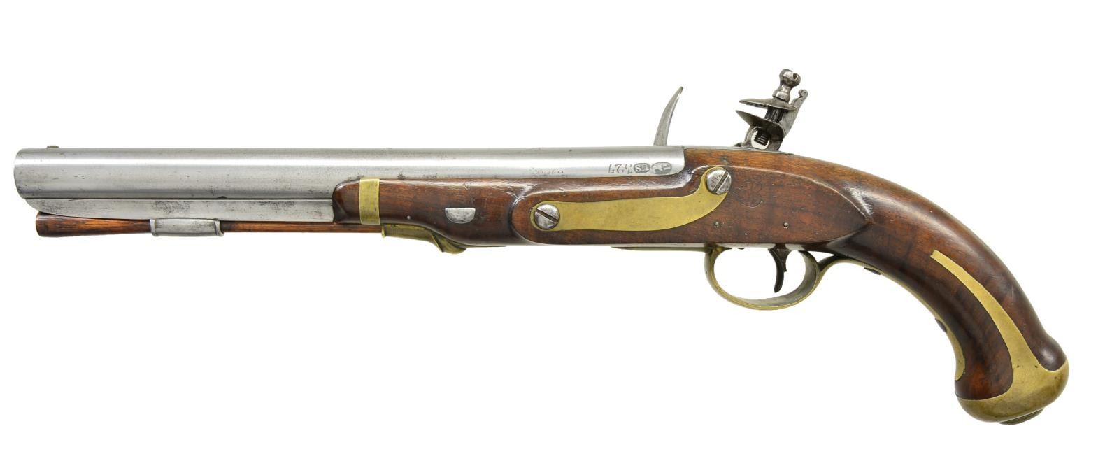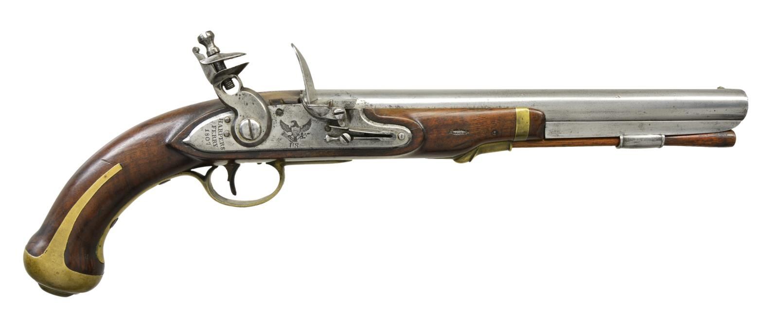 Cal. 54. S# 327. Bbl. 10 1/16" brown w/ smoothbore & small brass sight. Left side of bbl. has eagle’s head proof followed by “U.S.” & number “327”. Harpers Ferry marked lock dated 1807. American eagle over U.S. is forward of hammer. Wedge fastened stock. Left side has clear V/CW cartouche. Brass fittings consist of butt cap, trigger guard, side plate, forearm tip band & thimble. Hardwood ramrod is held on iron under rib by a single faceted pipe. Total of 4,096 mfg. 1806-1808, and estimated 2,580 were dated 1807. First U.S. military handgun made at a national armory. CONDITION: very good. Metal has a cleaned appearance showing scattered spots of corrosion. Brass has a mild aged patina. Wood has good finish showing scattered scratches & marks. Sound lock. Lightly pitted bore. (01-23074/DS). ANTIQUE. $4,000-6,000.