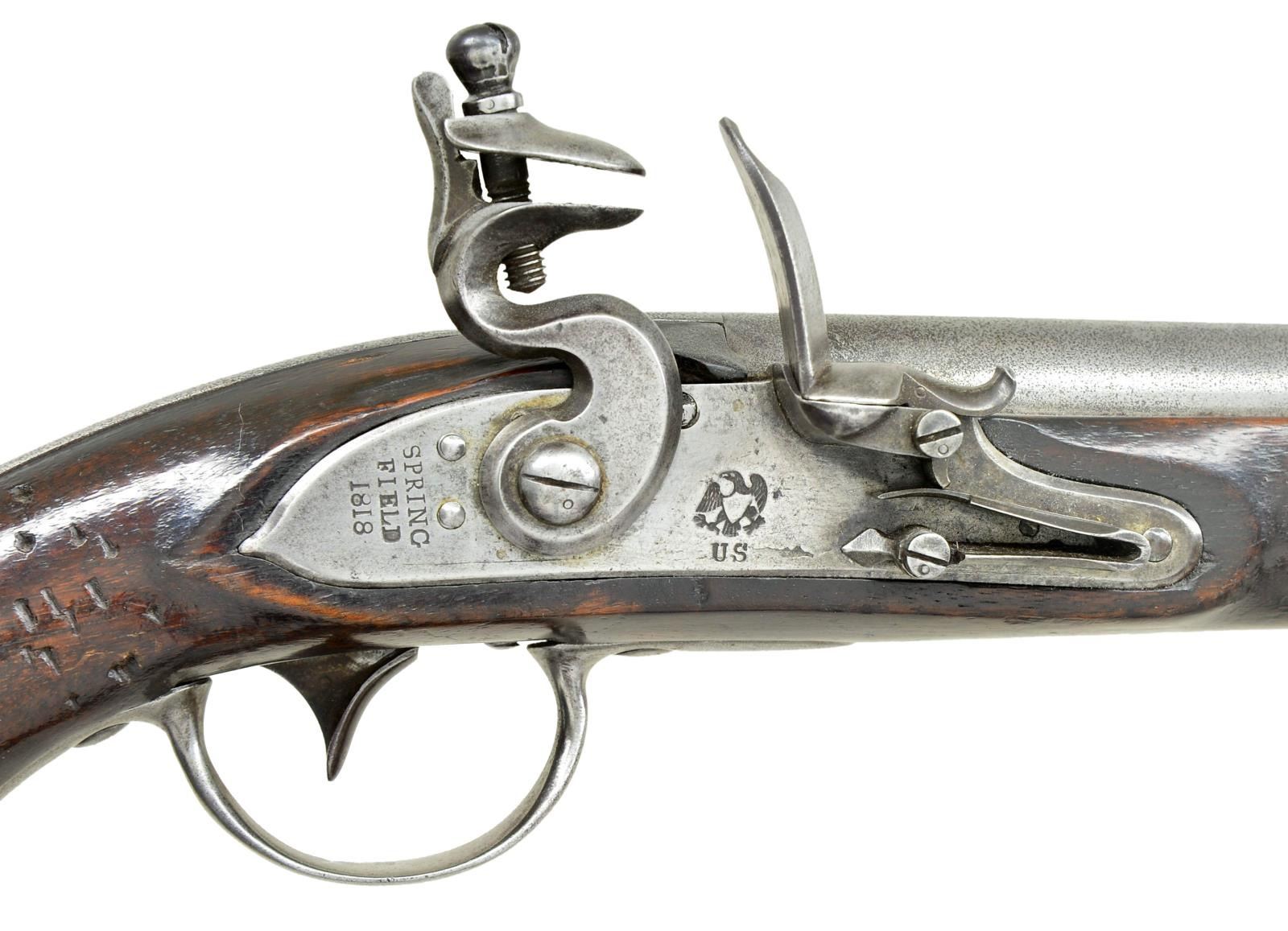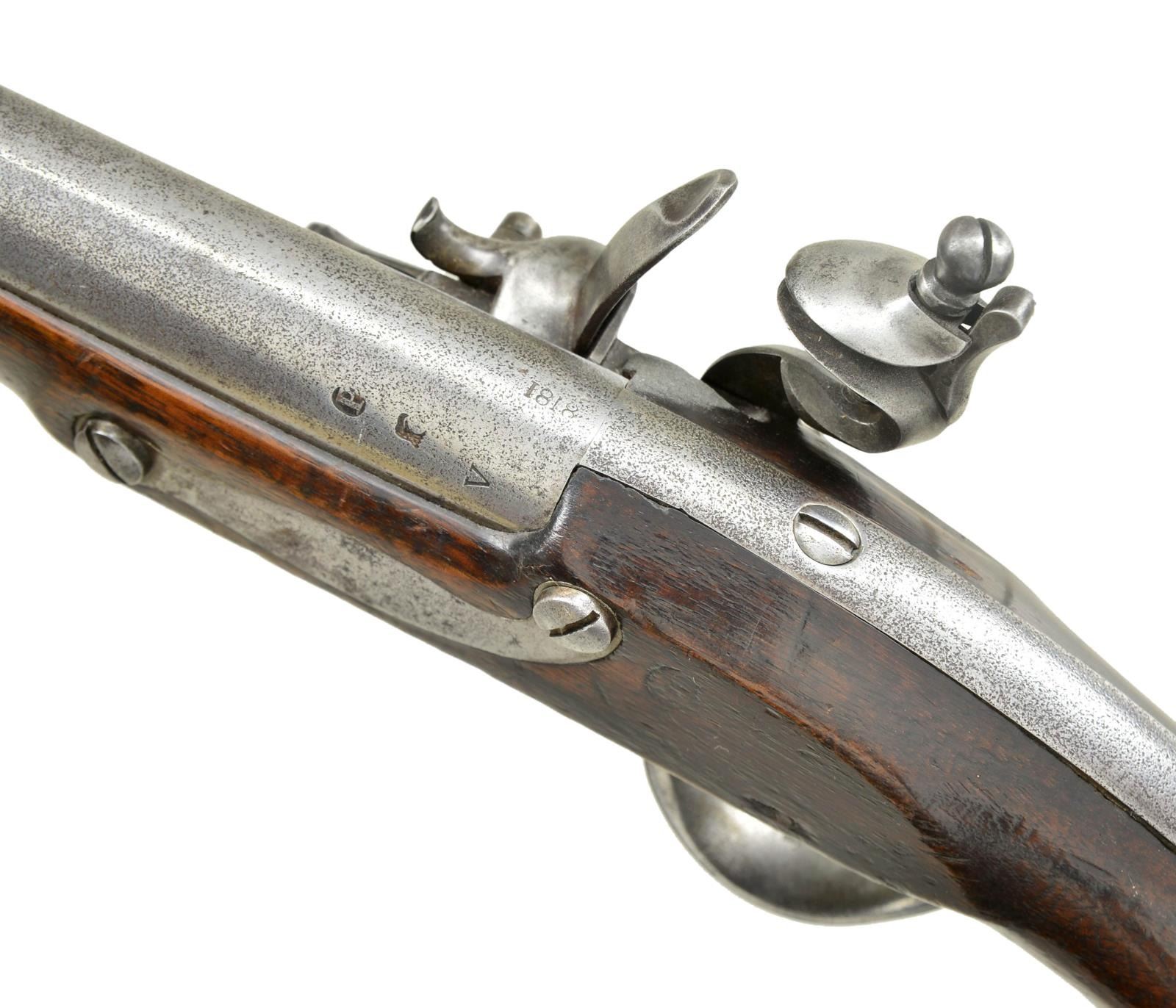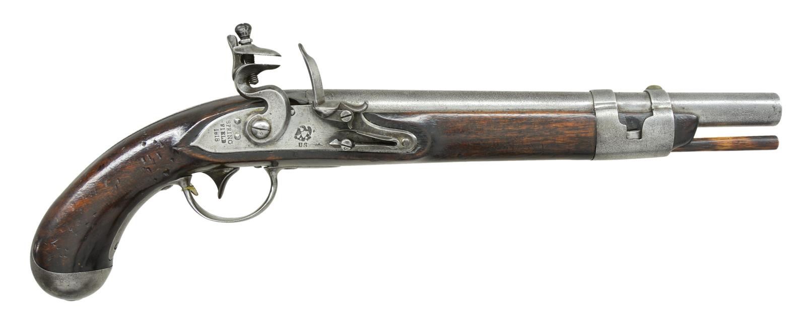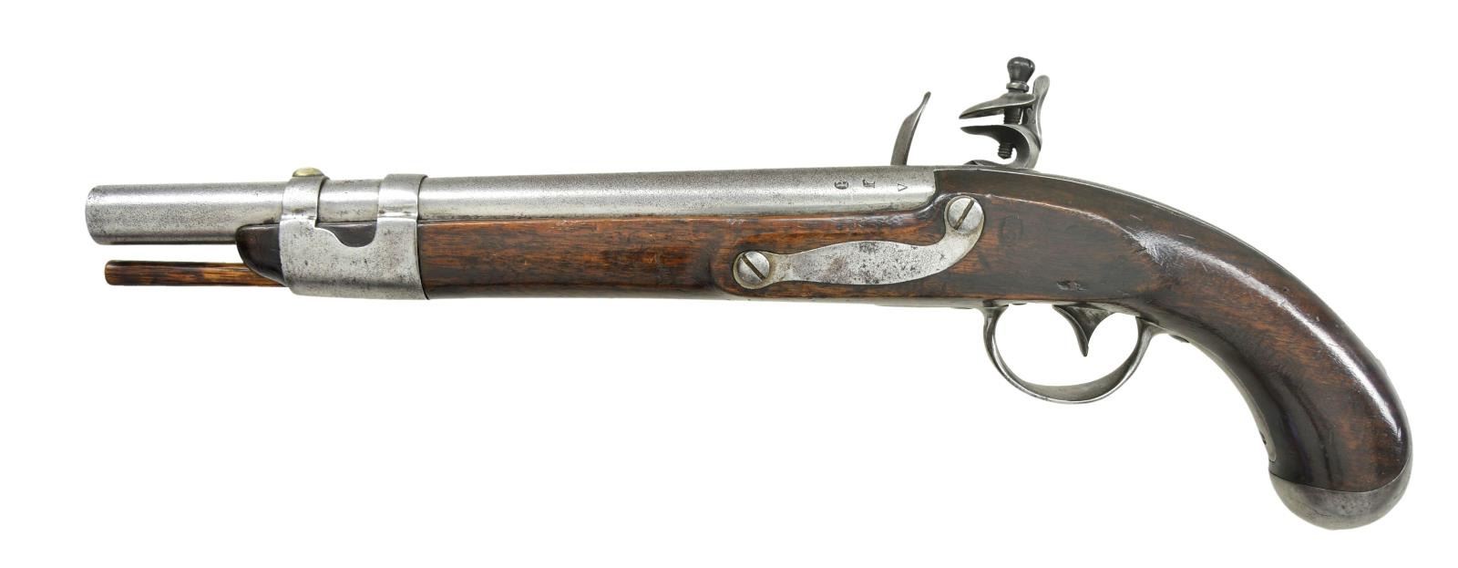 Cal. 69. NSN. 18” overall, 11.25” barrel dated “1818” at top of breech and proofed raised “P” cartouche / eagle head / “V”. Lock stamped with spread-wing eagle / “U.S”, at tail: “Springfield/1818”. Inside of lock “JD (Joseph Dale). Internal lock “crescent” proofs match external ones on battery. Trigger plate is stamped “EA” (Epaphriditius Allis). Stock is inspected with script “S” cartouche & “v” / “JN” (John Newberry). There is stamped “B” above buttcap on left. Original wood ramrod has slotted iron tip. This pistol is the largest of all American martial flint pistols. Production started in 1807 but were shelved and all completed and dated 1818. This example with earliest serpentine hammer and original flint configuration is scarce survivor. CONDITION: very good overall, metal overall gray with fine pitting. Stock well fit with cosmetic blemishes, old varnish partially obscures proofs, but all can be discerned. Mechanically fine, smooth clear bore. (01-21488/JS). ANTIQUE. $4,000-6,000.