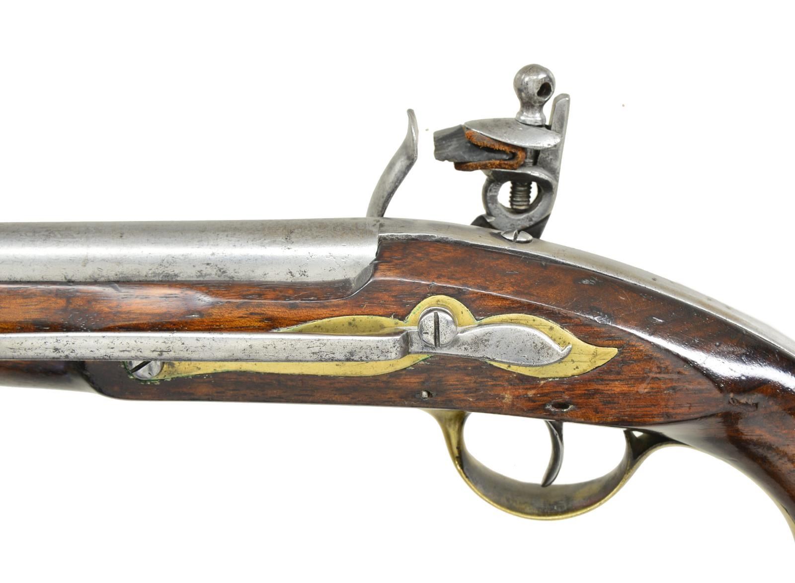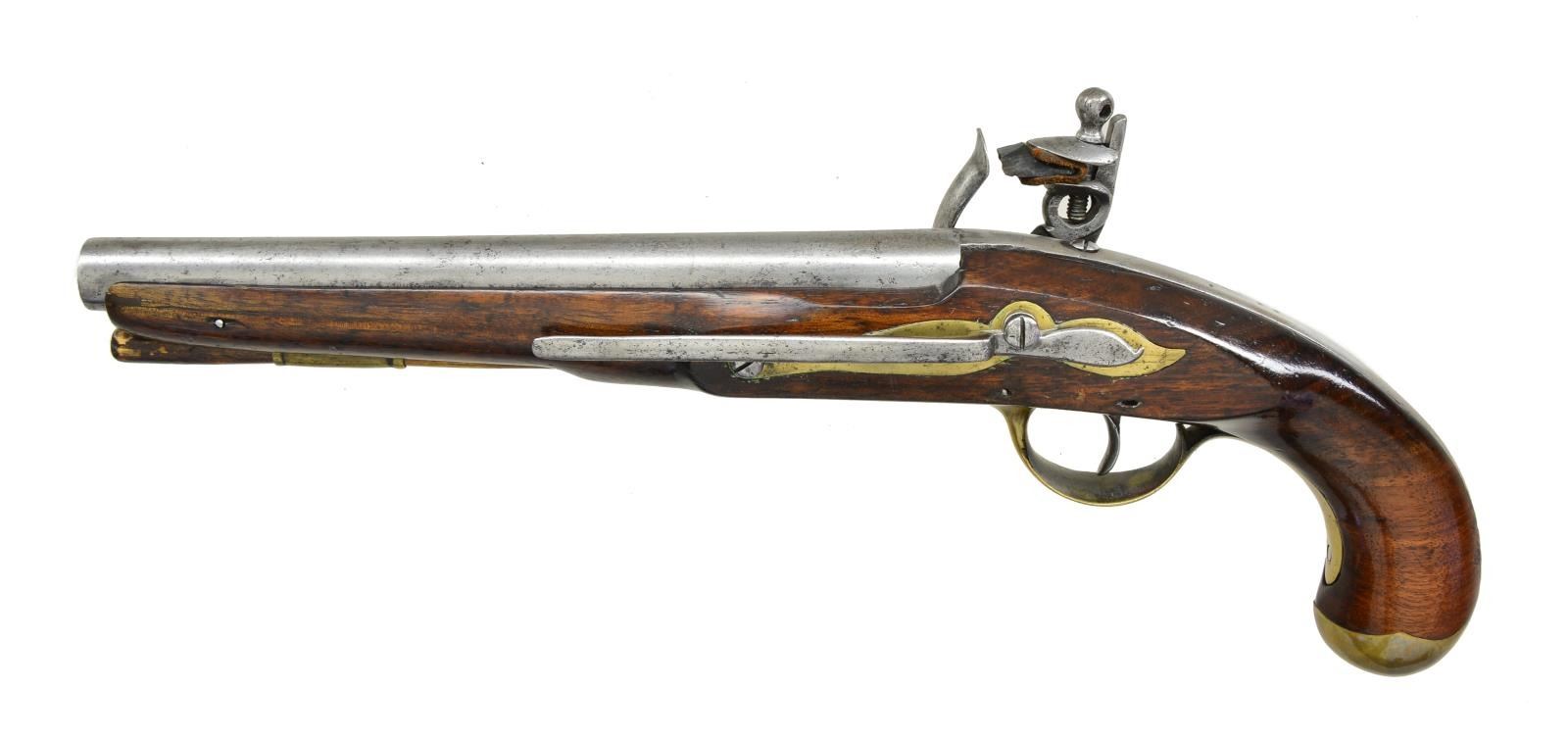 PISTOL. 67 cal. NSN. 10” barrel with no external markings, Roman numerals found internally cut into barrel, breech, and stock, “++VII” & “VIIII”. Lock has eagle over “U. STATES” & “S. NORTH / BERLIN / CON.” Brass furniture with 6” iron belt hook. There are numerous variants of this pattern as noted in various texts. This example appears original though reconverted but using original lock components. This is good looking War of 1812 era pistol that presents nicely and functions well. CONDITION: good to very good overall as stock restored with 3.5” inset forward of frizzen where wood burned out from percussion use. Stock refinished with varnish, scattered cosmetic blemishes. Metal cleaned. Mechanically fine with smooth clear bore. (01-21487/JS). ANTIQUE. $1,500-2,500.