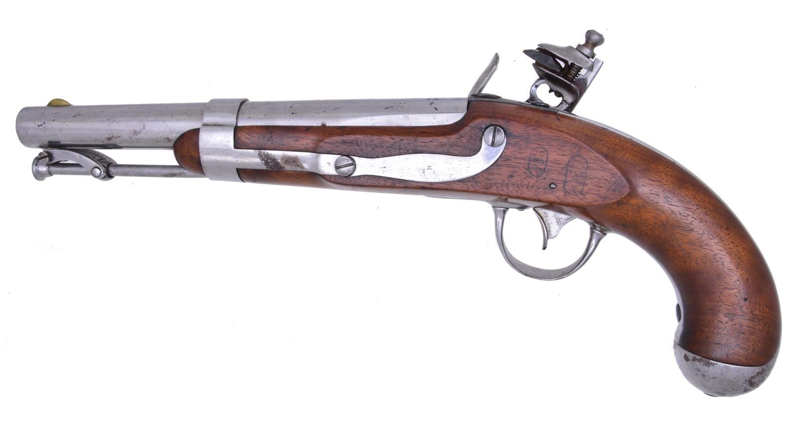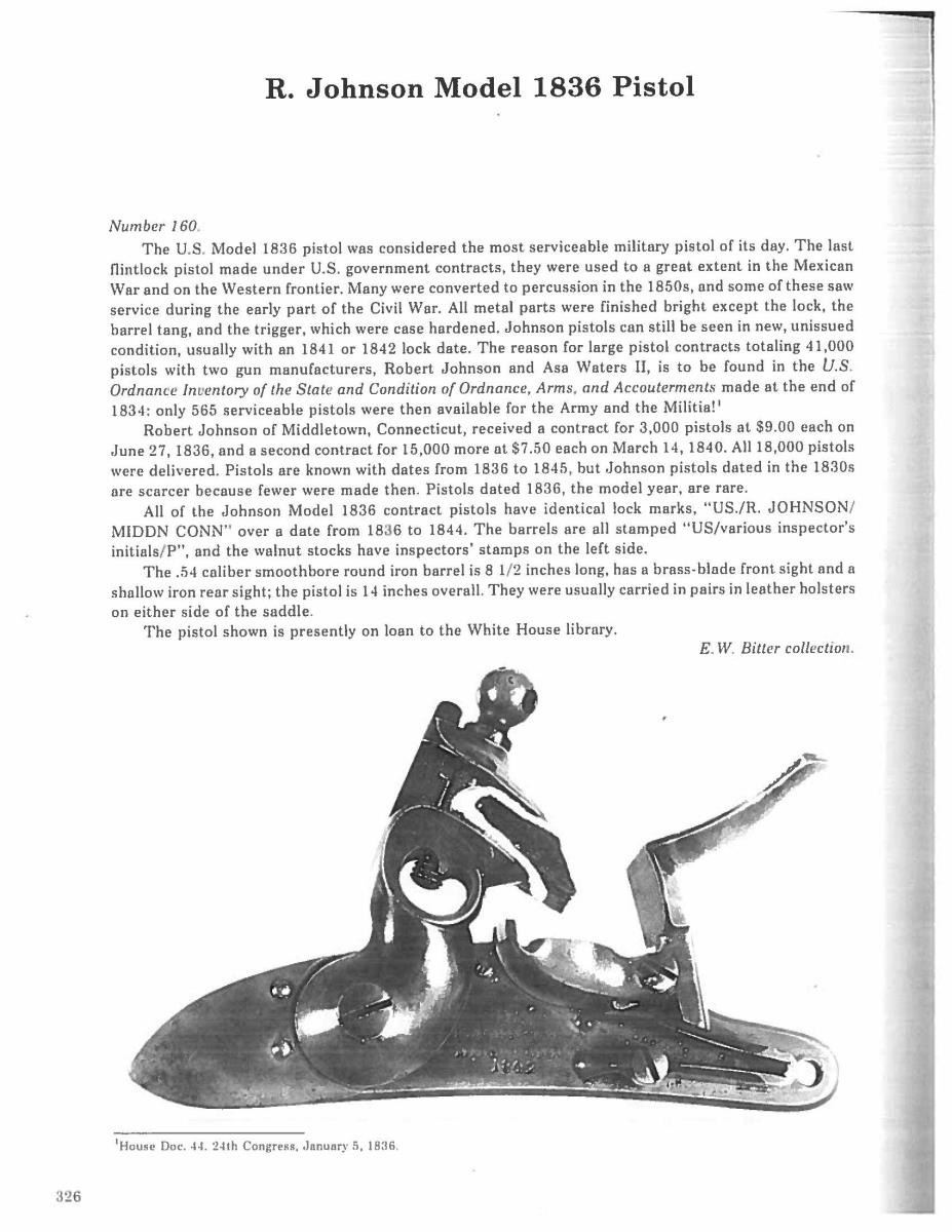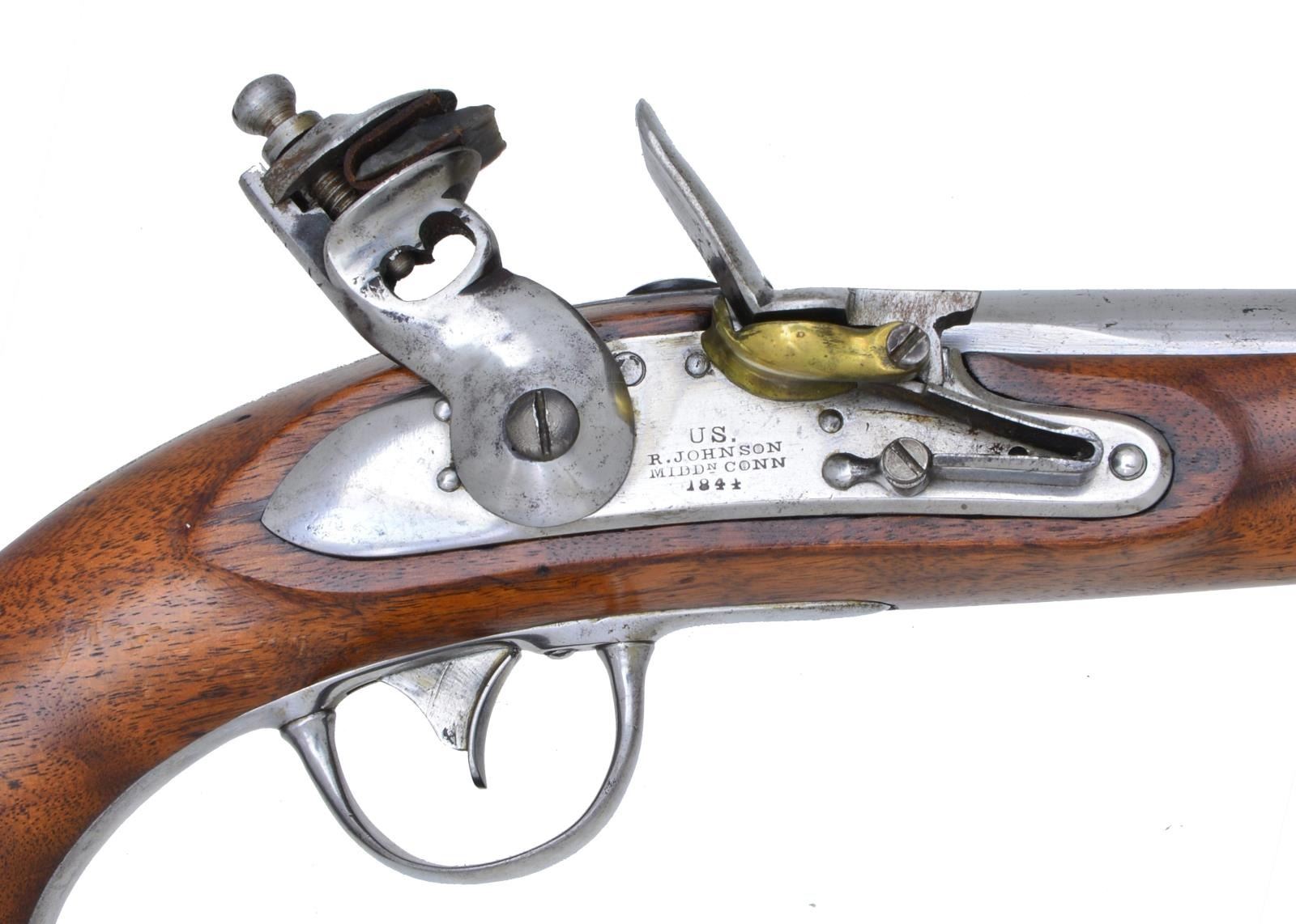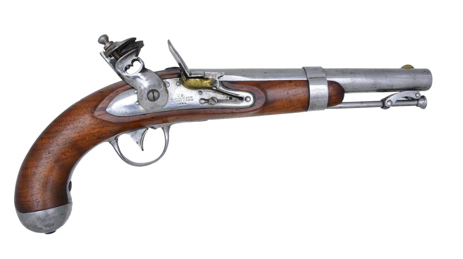 PISTOL. 54 cal. NSN. 8.5” barrel inspected at breech “JH / P”, lock: “US / R. JOHNSON / MIDD’N CONN / 1844”. Robert Johnson delivered 18,000 pistols (1836-1844). This is a fine all original example with 2 inspector cartouches. CONDITION: very good to fine overall, metal cleaned & polished bright, stock fine & well fit. (01-21470/JS). ANTIQUE. $1,500-2,500.
