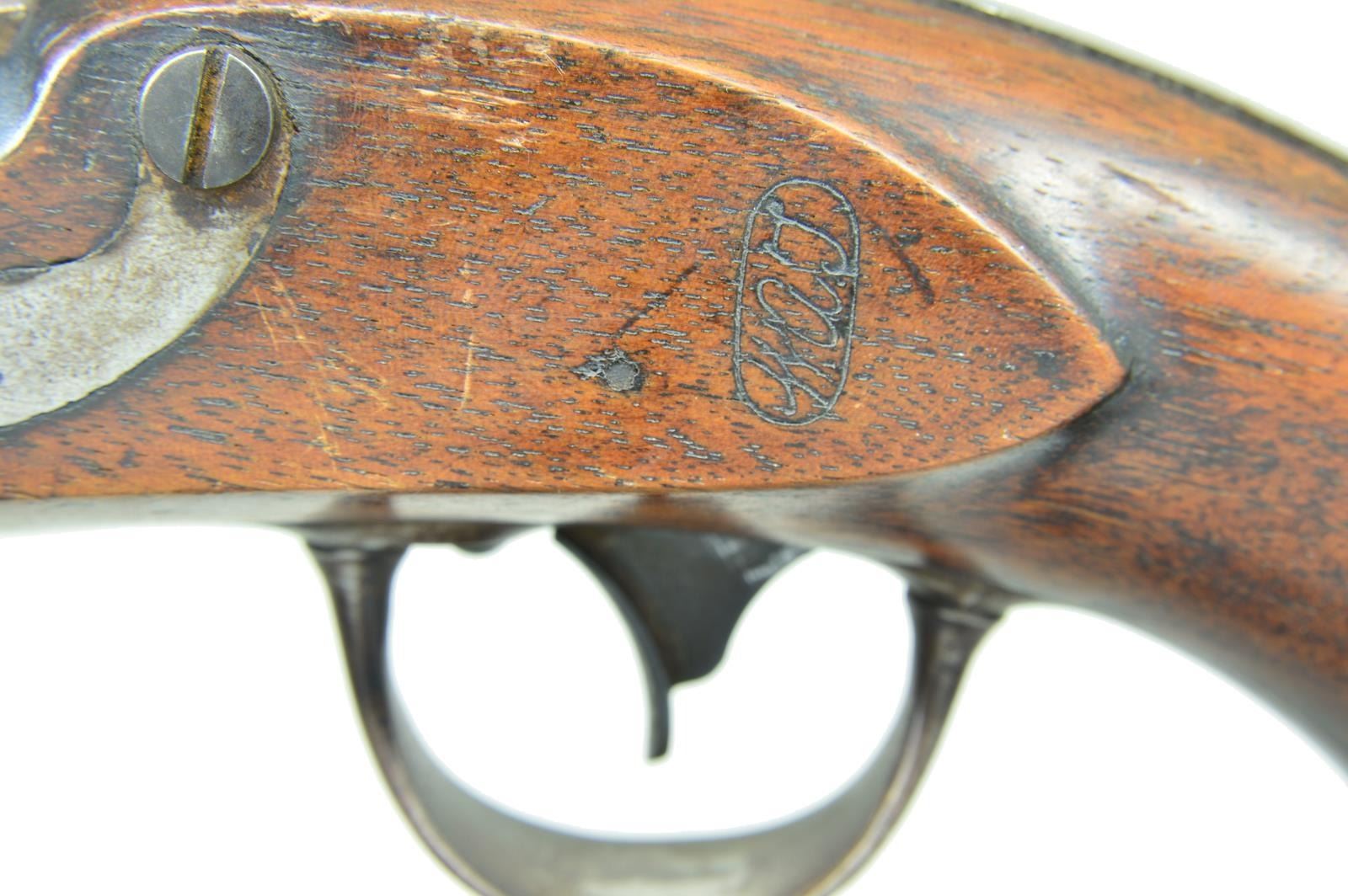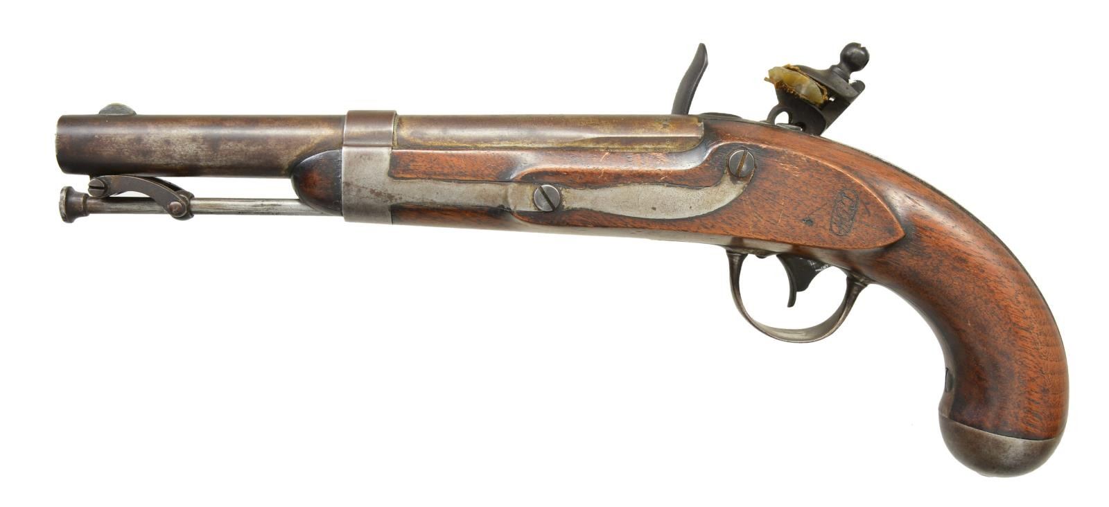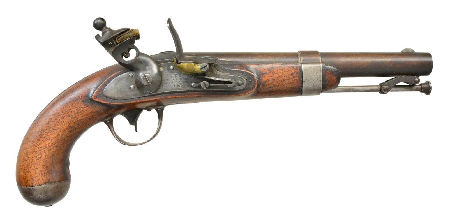 PISTOL. Cal. 54. S# NSN. 8 1/2" smooth bore, rnd. bbl. w/ fixed oval rear sight & brass blade front sight. Double neck hammer, brass pan, lockplate marked "US / RJOHNSON MIDDEN CONN / 1842". Bbl. marked on top "US. JH P". Marked on left side w/ tiny "B". Approx. 41,000 of these pistols were made & later converted to percussion. All iron furniture; bbl. band retained by sideplate. Swivel ramrod. Walnut stock marked on left side w/ crisp "WAT" (William A. Thornton) cartouche. CONDITION: stock has nice appearing original finish w/ crisp cartouche plus does have a degree of handling wear commensurate w/ a firearm of this age. Notable sm. cracks in front & rear of lockplate. Metal retains notable degree of original brown finish turning gray & patina w/ notable wear on backstrap. Lock appears to function correctly. Good shiny bore w/ scattered spots of very fine pitting. (01-23078/RW). ANTIQUE. $1,200-1,800.