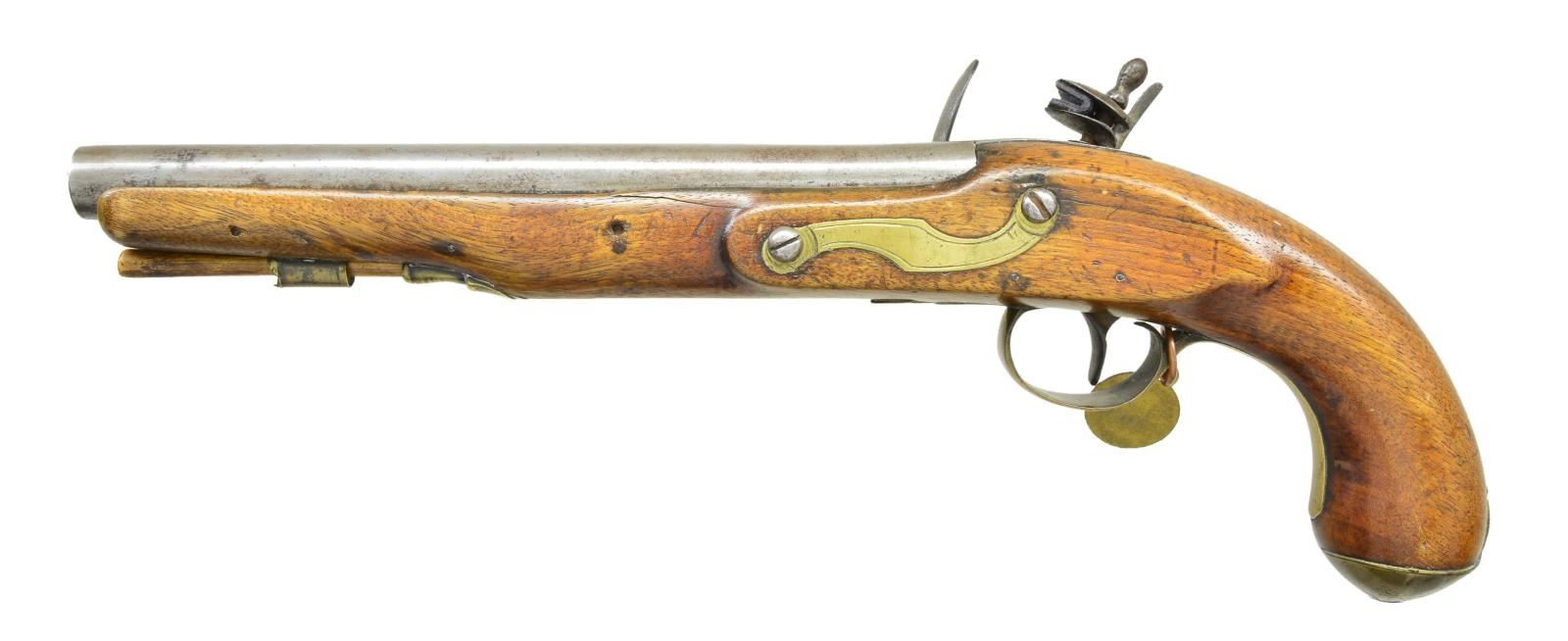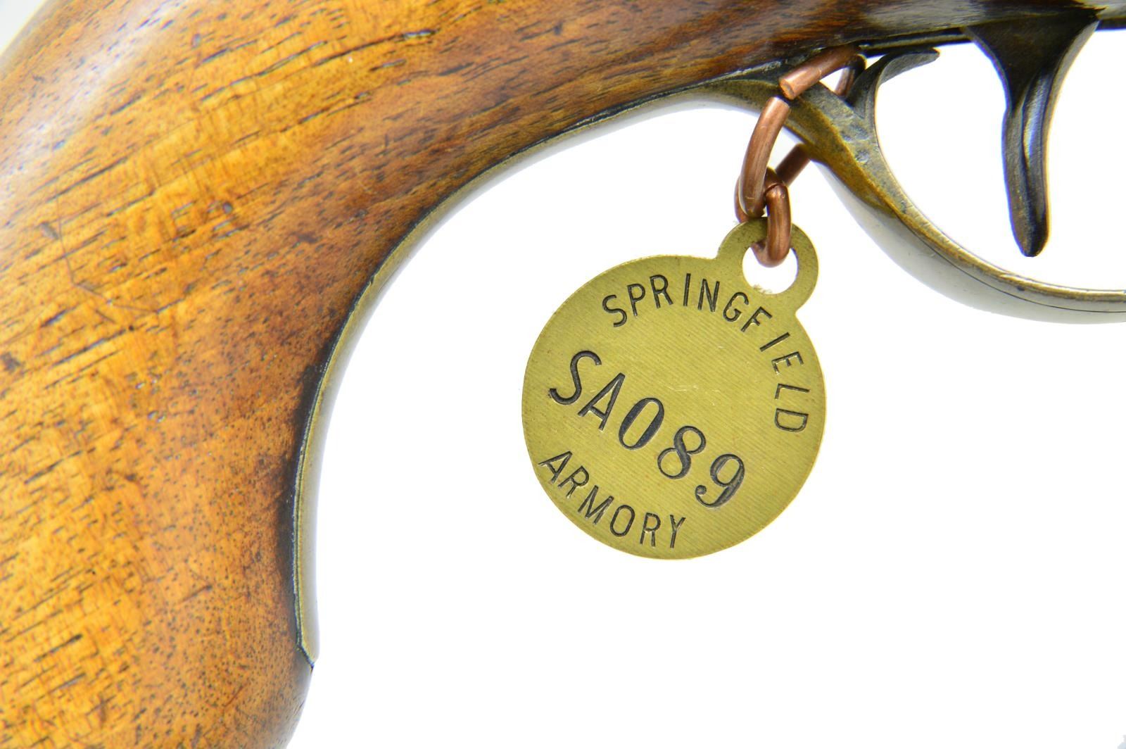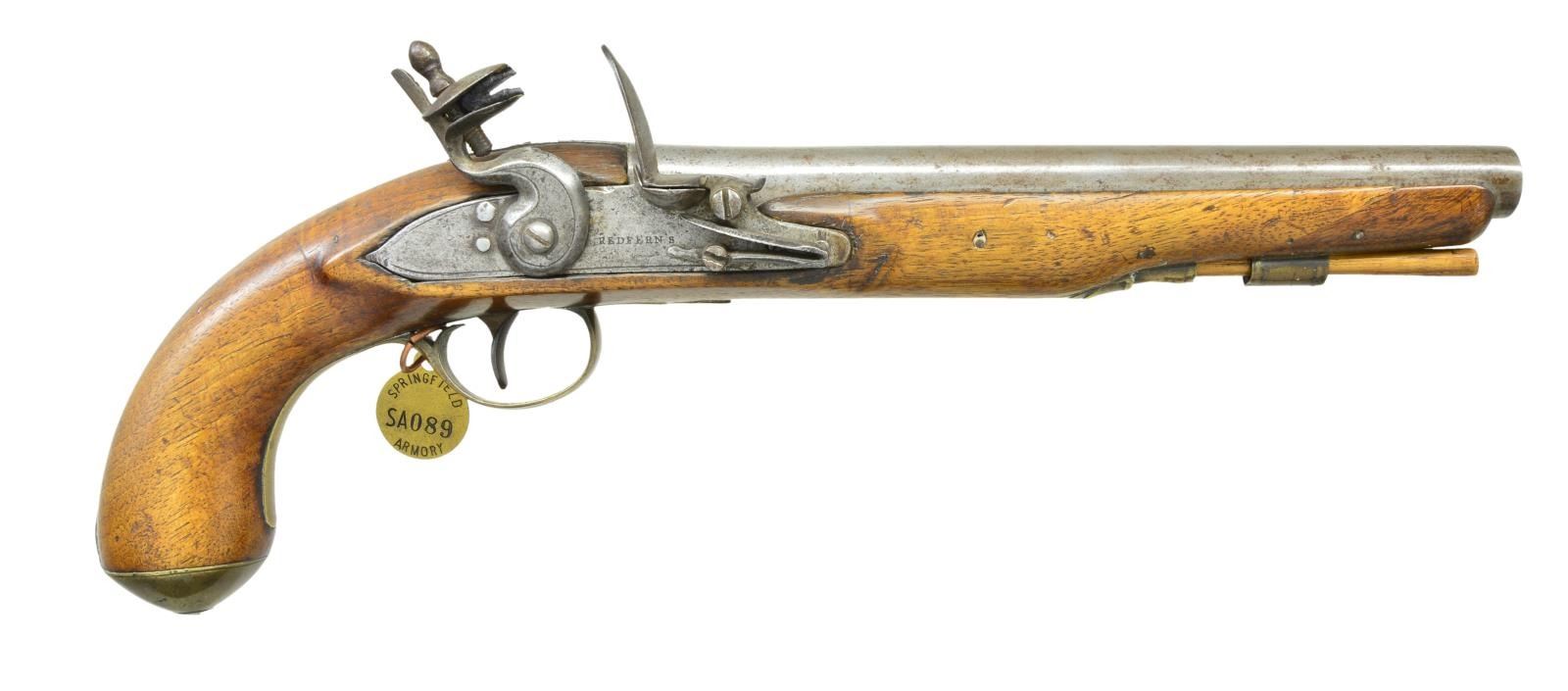 CAL. 55. NSN. Bbl. 9" smoothbore. "REDFERNS" marked lock. Maple stock w/ New England style brass buttcap & spear finial triggerguard; bow engraved w/ sunburst motif. Ramrod held by brass pipe & thimble. Triggerguard bow has Springfield Armory brass tag numbered "SA089". CONDITION: bbl. & lock has light gray patina appearance w/ light oxidation throughout & light pitting. Touch hole has been bushed & pan carved for touch hole. Stock has spliced nose tip starting 1" from muzzle diagonally to end of brass pipe. Stock has sanded & refinished appearance showing large crack left side in front of sideplate, numerous sm. gouges & marks. Brass pipe has piece missing. Dark pitted oxidized bore. (01-23034/MD). ANTIQUE. $600-800.