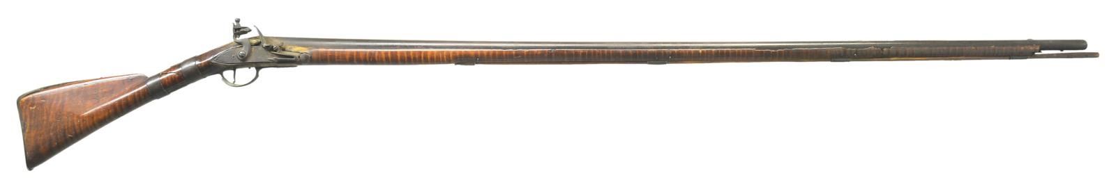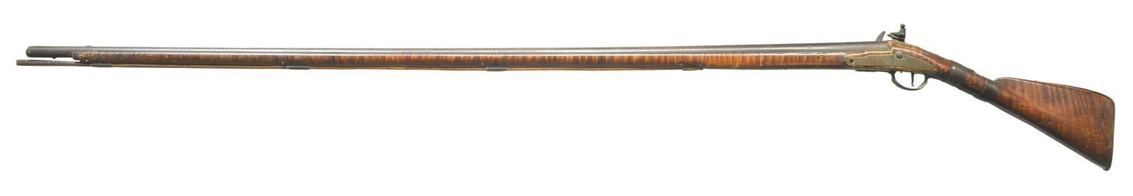 STOCK. Cal. 62. NSN. Bbl. 54". This amazing survivor has wonderful hand worn patina & initials & date carved in stock "RBI 1775 W". Brass mounted fowler w/ early oval wrist was broken & repaired w/ 2 braised iron bands: all w/ matching patina to rest of gun. Sock is cut back at muzzle for bayonet lug on bottom of bbl. There is a branded name in buttstock which consignor believes was soldier who served in the Connecticut line. This gun is thoughts to have characteristics of Connecticut maker Medad Hills from a well known family of Connecticut gun makers of the revolutionary war & earlier era. CONDITION: very good "as found". The Ketland tulip lock & bbl. have mostly smooth iron patina w/ pitting at breech. The iron band repair is so well done as is an iron headed nail or screw forward of lock taking place of long lost 2nd lock screw. Stock, other than the contemporary repair, is sound w/ hand worn patina w/ sm. well patinated reductions in crack toward muzzle. About 1" piece is missing on right side of forestock. Even the wooden ramrod appears original & very good. Lock spring good, but wont fall past half cock. Smooth, clear bore. PROVENANCE: From the Collection of James B. Taylor. (01-20503/JS). ANTIQUE. $6,000-10,000.
