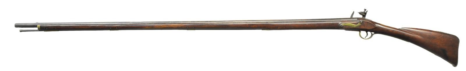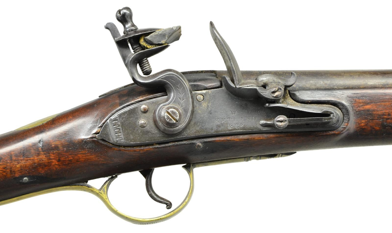 LOCK. Cal. 56. NSN. Bbl. 46 3/4" tapered rnd. w/ brass front sight & filed in sighting groove at rear. Trade flintlock w/ flat plate having teat fitted w/ serpentine cock, integral rnd. pan, bridled friction frizzen & feather spring w/ tear drop finial. Plate marked "KETLAND & Co.". Walnut stock extends to w/ in 4" of muzzle w/ thin brass cap & is pinned to bbl. Butt w/ semi handrail comb has lovely sweep through toeline. Stock is brass mounted. Trigger guard has spear finials & some engraving. Buttplate has fancy steeple tang. Sideplate is in classic "S" shape & there is a vacant brass escutcheon at top of grip. Steel ramrod mounts through 3 beaded pipes w/ matching thimble. CONDITION: very good. Bbl. w/ old oil cleaning shows gray highlights over deep brown patina. Lock is quite dark. Brass once cleaned is toning to mustard brown. Stock has good hand worn areas at grip & fore piece in what appears to be its original oil finish. There are numerous shrinkage cracks which have been repaired along bbl. channel on both sides, otherwise stock is sound. Shiny bore has scattered pitting. Lock will not fully cock. Cock is possible correct replacement. PROVENANCE: From the Collection of James B. Taylor. (01-20507/MGM). ANTIQUE. $1,500-2,000.