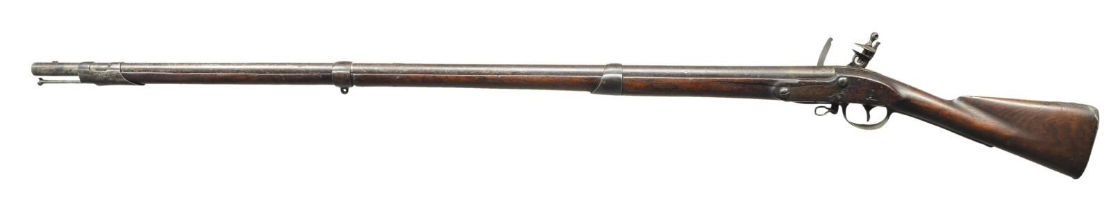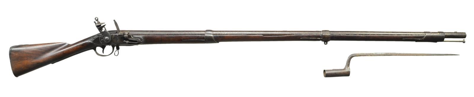 BAYONET. Cal. 69. S# NSN. Bbl. 44.75". Standard configuration of type I model 1795 (made 1799-1806), 59.5” overall, 44.75” barrel stamped top of breech “US” & proofed on left “P / eaglehead / V”. Pointed tail lock, “SPRINGFIELD in vertical arc, eagle over script “US”. Buttplate dated 1801. Battery with flat cock with heart shaped cutout, detachable faceted pan, faceted frizzen face with medial ridge & curved tail, frizzen spring terminates in fleur de les shaped finial. High comb walnut stocked with 3 spring retained bands, pointed ended trigger guard. Inspection script “A” opposite lock. “M” inspection initial rear of triggerguard. Bayonet has 14.5” blade inspected “US” & “NC”. Only 3,205 muskets were made in 1801. CONDITION: good to very good overall, metal has iron patina, sharp markings on lock, pitted trigger guard & buttplate. Stock is sound with hand worn patina, discernible inspection marks. Bayonet fits loosely and made for gun with larger lug. Mechanics fine, dark smooth bore. (01-22765/JS). $2,000-3,000.