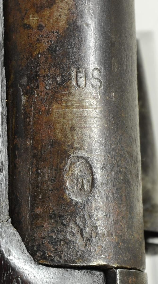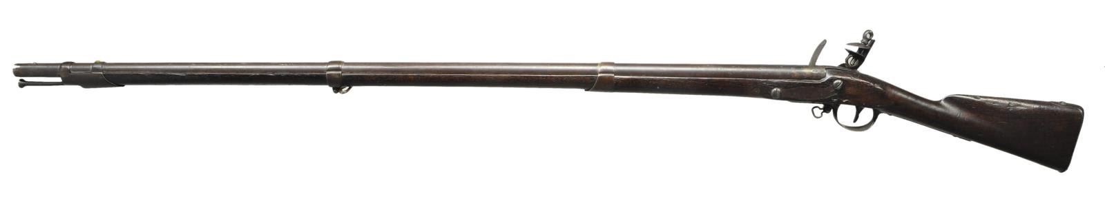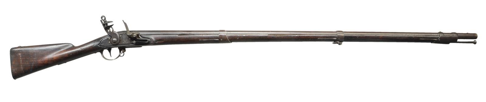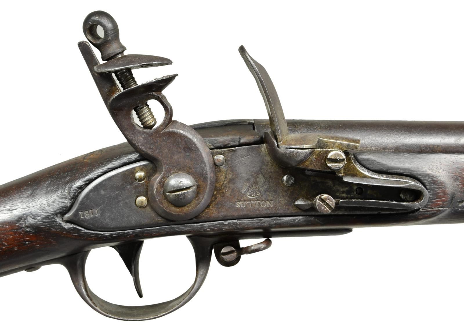 OF SUTTON MASS. Cal. 69. NSN. The 44 1/2" round barrel affixed with three spring retained bands is marked "US" eagle over "CT" in oval stamp and "V" at rear. "V" is also stamped on barrel tang. Lock with arched beveled flat plate has pointed tail and is fitted with reinforced cock, integral rounded pan, bridled frizzen and feather spring with small spear finial. All lock parts bear the same assembly stamps and lock is in its original configuration. An eagle over "SUTTON" is at center and "1811" is stamped horizontally on tail. Walnut stock with fluted comb is iron mounted and no markings are noted on fittings. Original type button ramrod and screwed on sling loops are present. CONDITION: good to very good. All iron parts exhibit smooth brown patina with some scattered light pitting. Stock shows old cleaning and reoiling over a very large number of marks and dings; some quite deep. There are some chips and missing wood along barrel channel. Bore is relatively smooth with some light pitting toward muzzle. Lock is good. PROVENANCE: From the Lifelong Collection of Glen E. Mattox. (01-22464/MGM). ANTIQUE. $2,000-3,000.