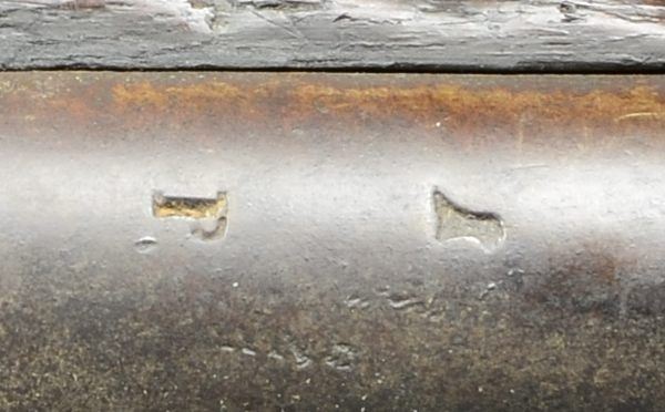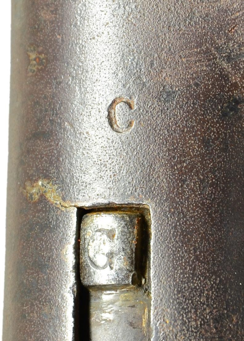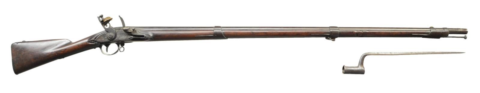 BAYONET. Cal. 70. NSN. Standard configuration of type II model 1795 (made 1806-1809), 59.25” overall, 44.5” barrel proofed on left “eaglehead / P” & small “SNY” on top. Pointed tail lock dated 1808, forward of cock: script “US” over eagle & “SPRINGFIELD in arc. Battery with flat cock with heart shaped cutout, removable round bottom iron pan, frizzen face with medial ridge & straight tail, frizzen spring terminates in triangular finial. Walnut stocked with 3 spring retained bands, buttplate dated “1808”. Bayonet has 14” thin fullered blade stamped “US”. Less than 6000 muskets were made in 1808. CONDITION: good to very good overall, sling swivels are later additions. Metal is smooth iron patina, sharp markings. Stock is sound with hand worn patina, no discernible inspection marks. Lock functions fine, smooth dark bore. Bayonet fits musket well with “C” proof near lug marked “G”. (01-22770/JS). ANTIQUE. $2,500-3,500.