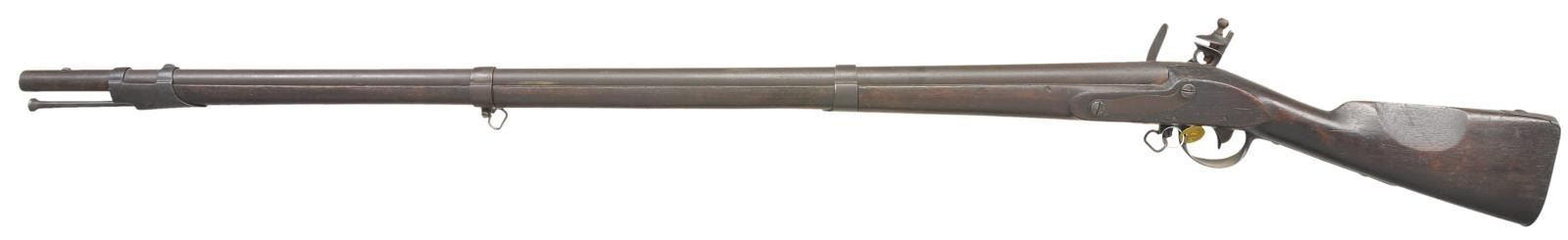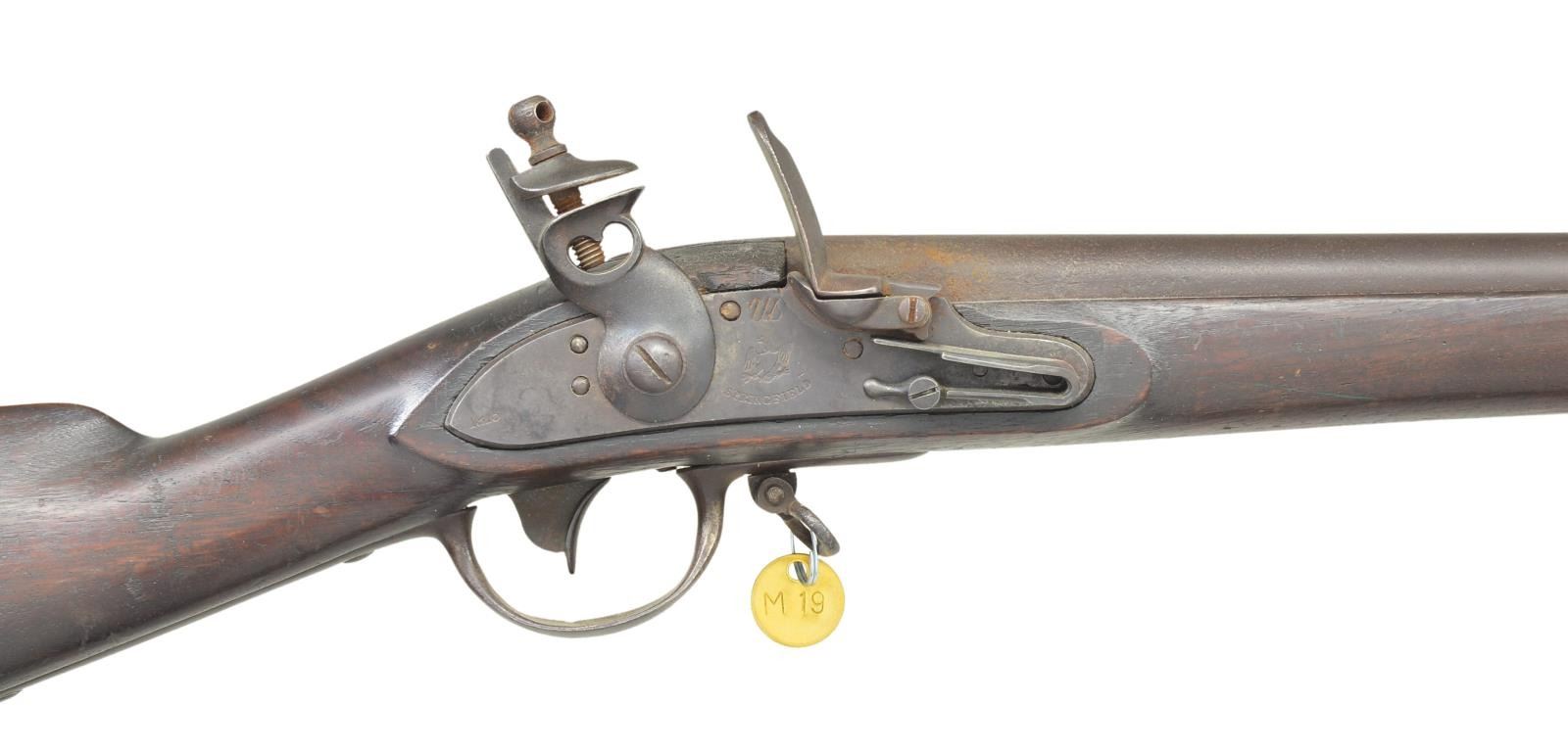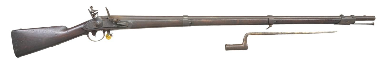 MUSKET & BAYONET. Cal. 69. NSN. Standard configuration of type II model 1812 (made 1815-1816), 57” overall, 42” barrel stamped top of breech “US” & proofed on left “P / eaglehead / V”. Flat beveled lock dated 1815, script “US” over eagle & “SPRINGFIELD in arc. Battery with rounded convex cock with heart shaped cutout, integral round bottom pan, frizzen spring terminates in teardrop shaped finial. Low comb walnut stocked with 3 spring retained bands covered except for studs by bands, buttplate dated “1815”. Bayonet has 14.5” blade inspected “JN” & “US”. These are scarce muskets made with new adopted design concurently with 1795 model with 1815 dates made 1st quarter of year. CONDITION: very good overall as reconversion to flint. Sling swivels later additions. Smooth iron patina, sharp lock markings. Stock is sound with hand worn patina, partially discernible inspection marks opposite lock and rear of trigger guard. Mechanics good, smoth dark bore. Bayonet fits musket well with same patina. (01-22771/JS). ANTIQUE. $2,000-3,000.