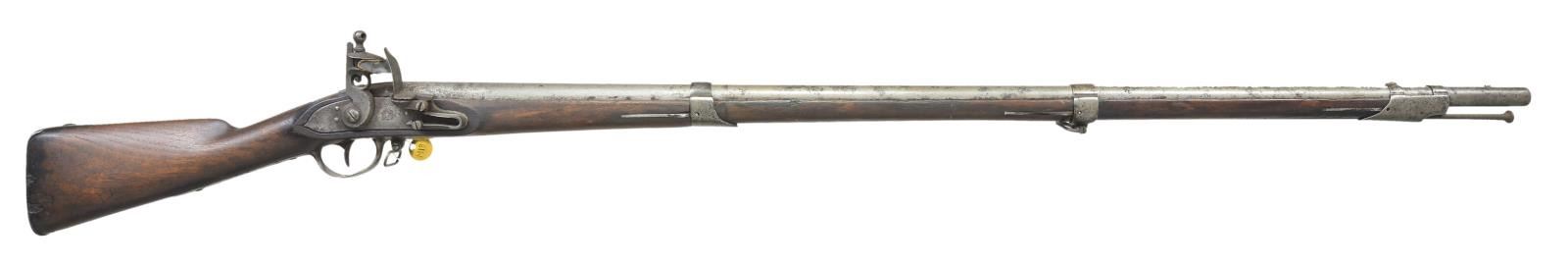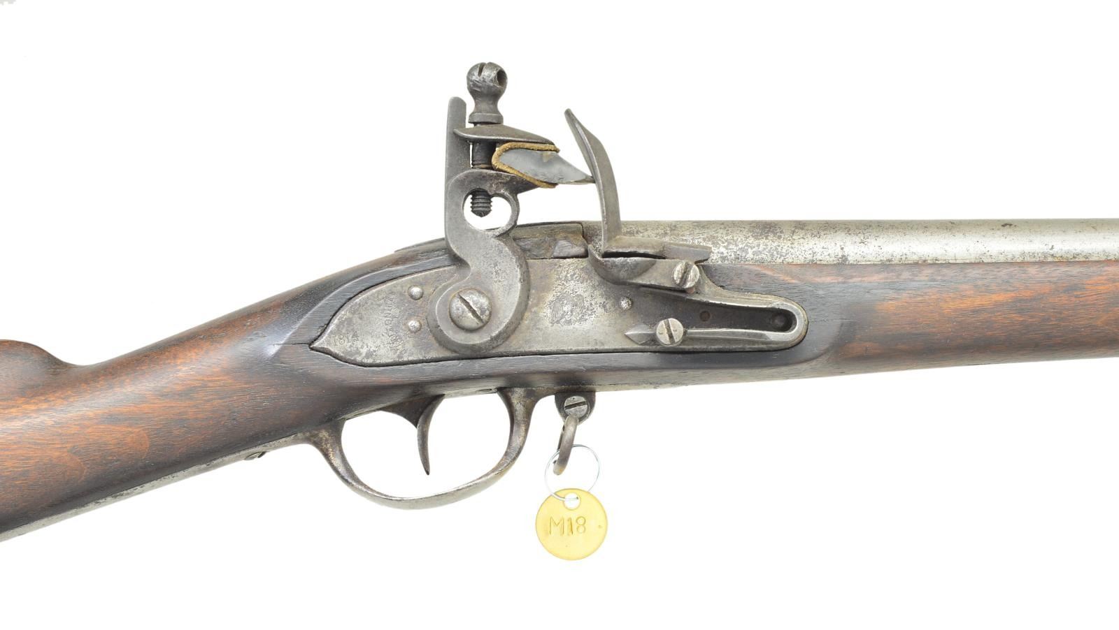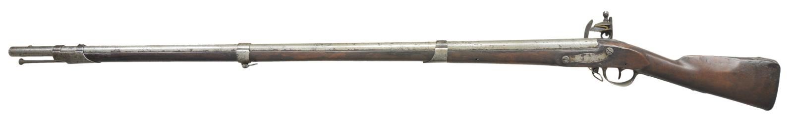 Cal. 69. NSN. Standard configuration of type III model 1795 (made 1809-1814), 59.5” overall, 44.75” barrel stamped on left breech “P / eaglehead / V”. There is also later shaped punched cartouche on top of breech. Pointed tail lock dated 1814 & “SPRINGFIELD” in vertical arc; script “US” over eagle forward of cock.