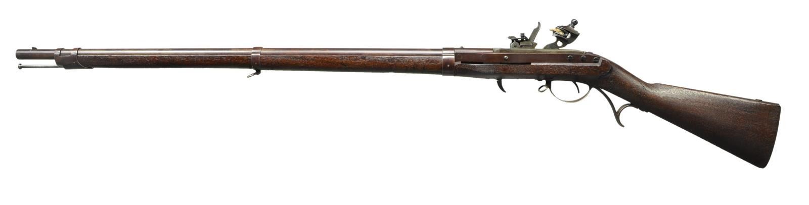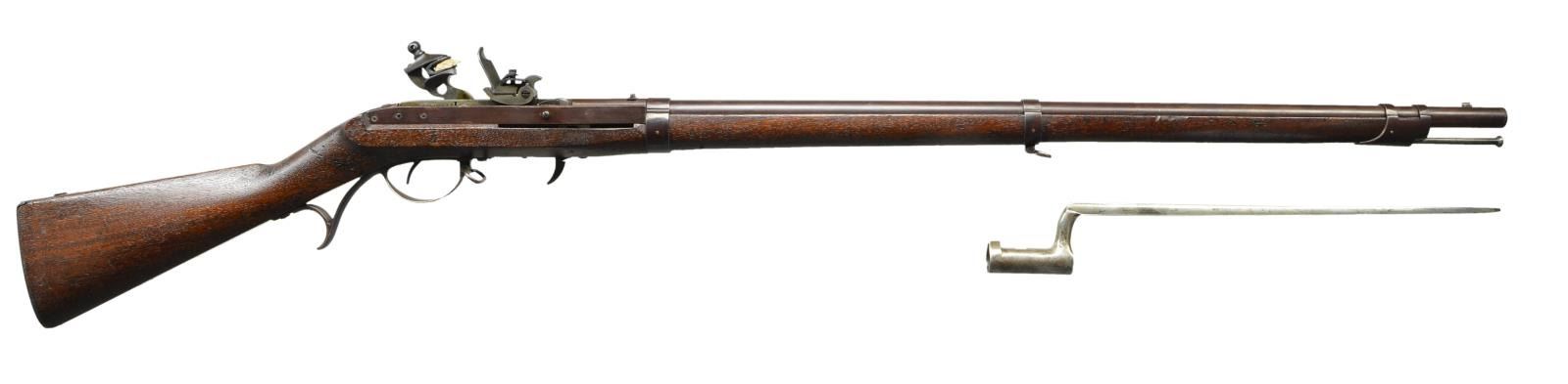BY HARPERS FERRY TYPE 2 WITH BAYONET. Cal. 52. NSN. Standard configuration with 32 5/8" barrel held by three pinned on bands, barrel, action and furniture are finished in brown lacquer. Case hardened breech block is marked "J.H. HALL" "H. FERRY" "US" "1837". American walnut stock is unmarked. UNATTACHED ACCESSORIES: rifle comes with scarce socket bayonet with 16" triangular blade. Special mounting ring has unique cut to slip over offset front sight, found only on this model. CONDITION: extremely fine retaining over 90% brown lacquer on barrel, action and furniture with only a few scratches and marks, mostly on buttplate. Tilting breech block retains nearly all of its case hardening color with only a few flint strikes on face of frizzen. There are no noted cracks in stock which retains most of its original finish and has had extra oil rubbed in over a fair number of heavy marks around breech. Bore is very fine, bright and shiny. Mechanically fine. Bayonet has been cleaned to gray brown overall with some marks and light pitting. PROVENANCE: From the Lifelong Collection of Glen E. Mattox. (01-22467/MGM). ANTIQUE. $4,000-6,000.