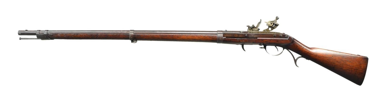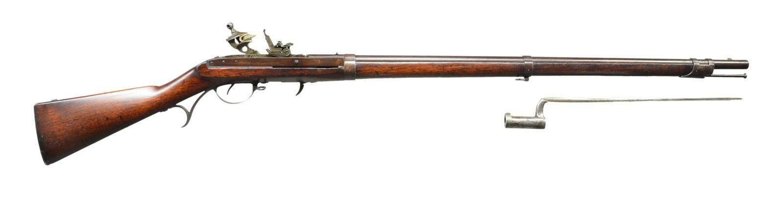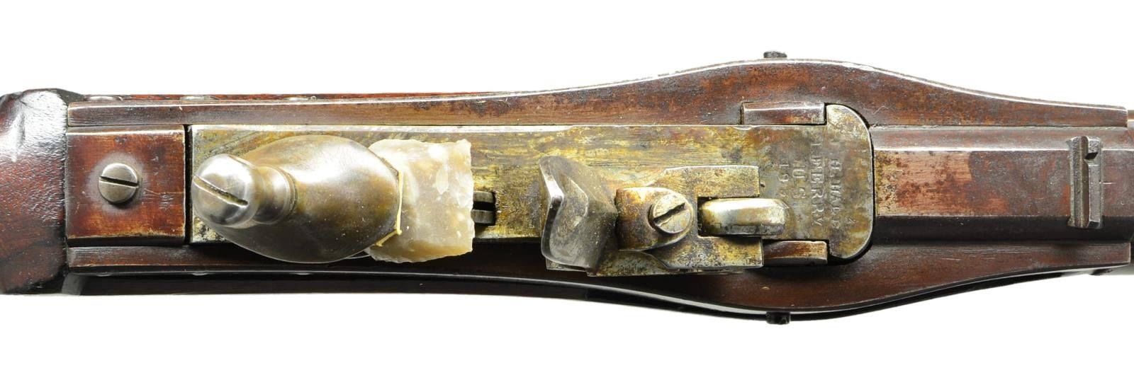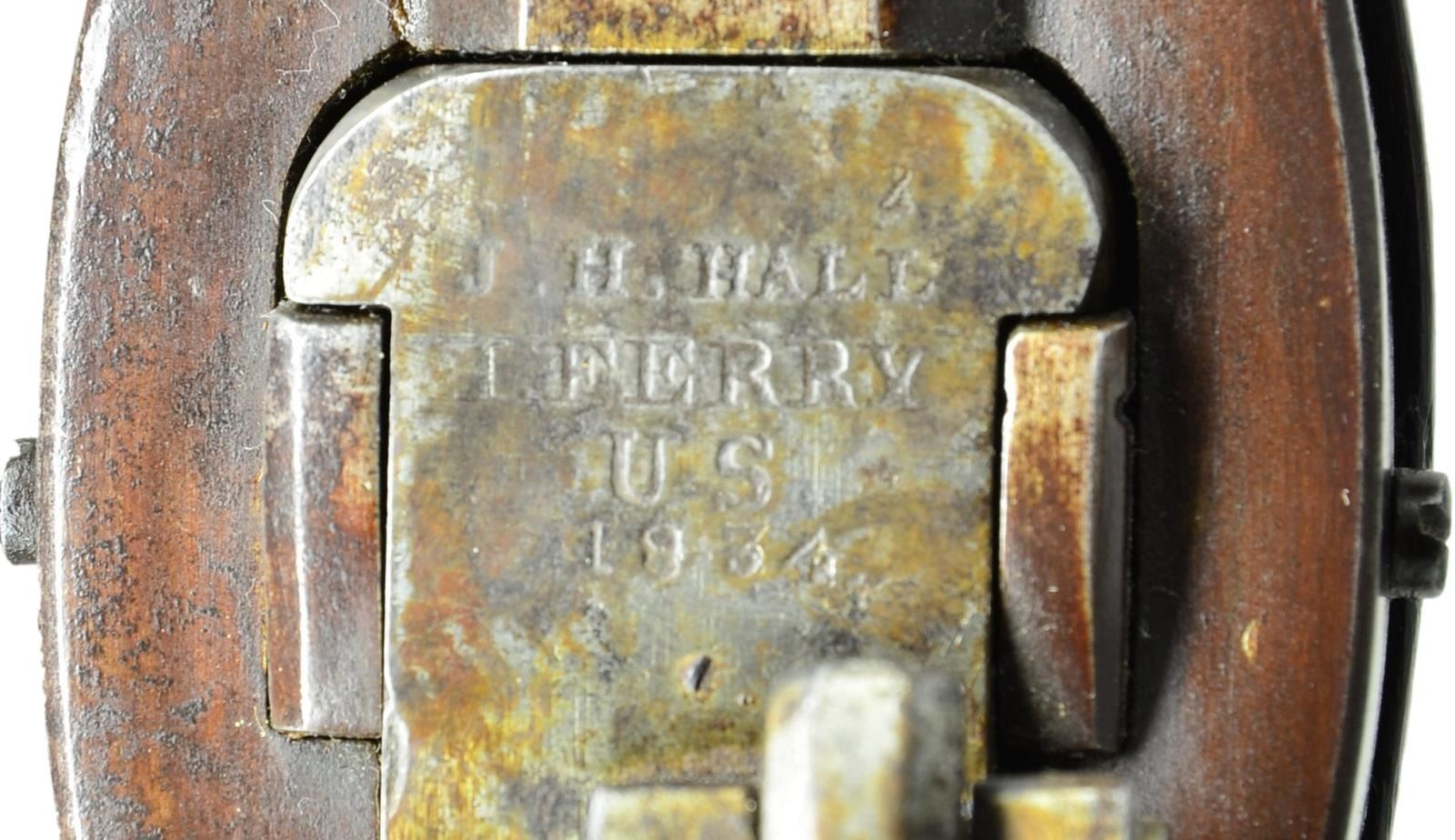 FLINTLOCK RIFLE. Cal. 52. NSN. Bbl. 32 5/8" w/ rifling that extends to 1 1/2” from muzzle. Blade front sight w/ fixed V notch rear sight. Single shot breech loading rifle. Breech block is released for loading by lever protruding through the bottom of the stock. Breech block is marked “J.H. HALL/FERRY/U.S./1834”. Iron fittings. Band fastened walnut stock. Button tipped iron ramrod. Total of 19,680 mfg. by 1840. UNATTACHED ACCESSORIES: unmarked triangular bayonet. Cleaned gray appearance showing small dents. CONDITION: fine. Bbl., action & fittings retain over 50% brown lacquer finish. Breech block retains faint traces of case colors. Balance showing a mottled gray brown. Unsanded stock shows light wear w/ scattered scratches, marks & dents. Bore retains sound rifling. (01-22707/DS). ANTIQUE. $2,500-3,500.