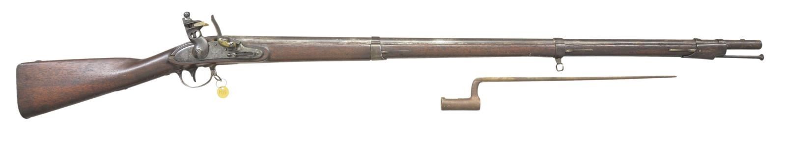 BAYONET. Cal. 69. NSN. Even though 16,000 muskets were made at Springfield in 1831, few survive in original unmolested condition like this example. Standard Type III Model 1816 flintlock musket, 57.5” overall, 42” barrel proofed and dated 1831 on tang. Flat lock beveled rear of cock, dated 1831 & “SPRING / FIELD vertically stamped & rear of cock eagle over block “US”. Battery with rounded convex cock with heart shaped cutout, detachable round bottom brass pan, frizzen spring terminates in teardrop finial. Walnut stocked with 3 spring retained bands, inspection marks opposite lock & rear of trigger guard. Bayonet has 16” blade with several inspection stamps. CONDITION: very good overall, appears complete & original, mottled smooth gray iron patina, lock has crisp markings, stock has chip rear of lock, good markings. Mechanically crisp smooth clear bore. Bayonet fits well. (01-22772/JS). ANTIQUE. $2,000-3,000.