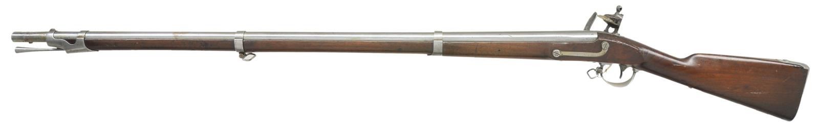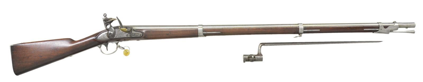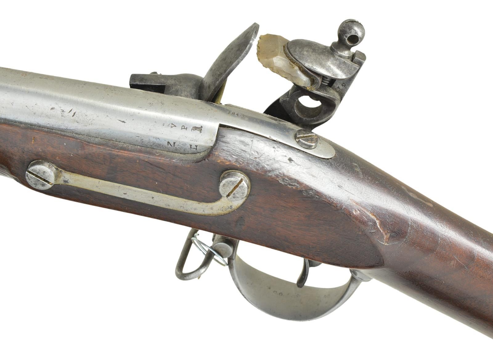 MUSKET IN GOOD ORIGINAL FLINT CONDITION WITH BAYONET. Cal. 69. NSN. All but 3,580 of the 30,421 1840 muskets produced were converted to percussion at Springfield in 1851. It is also documented that 2112 flintlock 1840's were issued to Pennsylvania and that another 87 were issued to New Hampshire. The NH issue were the only ones with identifying stamps. Standard configuration with 40" barrel held by three springs retained bands. Rear of barrel is stamped with "VP" and eagle head proofs. "NH" is on left flat. Barrel tang is dated 1842. Lock with chamfered plate having rounded tail is fitted with round bodied cock with circular central hole forming reinforce. Rounded brass pan is inset, bridled frizzen has straight toe, feather spring has bulbous finial. Internal inspection reveals identical makers marks on all individual parts except main spring and all appear to be original and not replaced except the possibility of frizzen which is of the correct style, but numbers and letters do not match. Lock plate is marked with eagle and "US" at center. "SPRING" "FIELD" "1842" is stamped vertically on tail. Walnut stock is iron mounted. Buttplate is stamped "US" and with rack number "27". A bronze tack with the number "729" is in front of trigger guard. U.S. inspectors marks are not found. Musket has correct type trumpet shaped ramrod. Brass collection tag marked "M22" is affixed to sling loop. UNATTACHED ACCESSORIES: musket is accompanied by correct style bayonet with retaining ring has 18 1/4" triangular blade stamped "P" (?). CONDITION: fine. Barrel and furniture showing cleaning to bright polish over some very light pitting most prevalent on buttplate. Lockplate is mostly gray with silver highlights. Stock retains most of its original oil finish with fair number of marks and scratches. Bore is bright with some scattered pits. Lock is fine. Stock is sound without any noted cracks. Bayonet shows cleaning to gray brown patina and fits musket well. (01-22761/MGM). ANTIQUE. $5,000-8,000.
