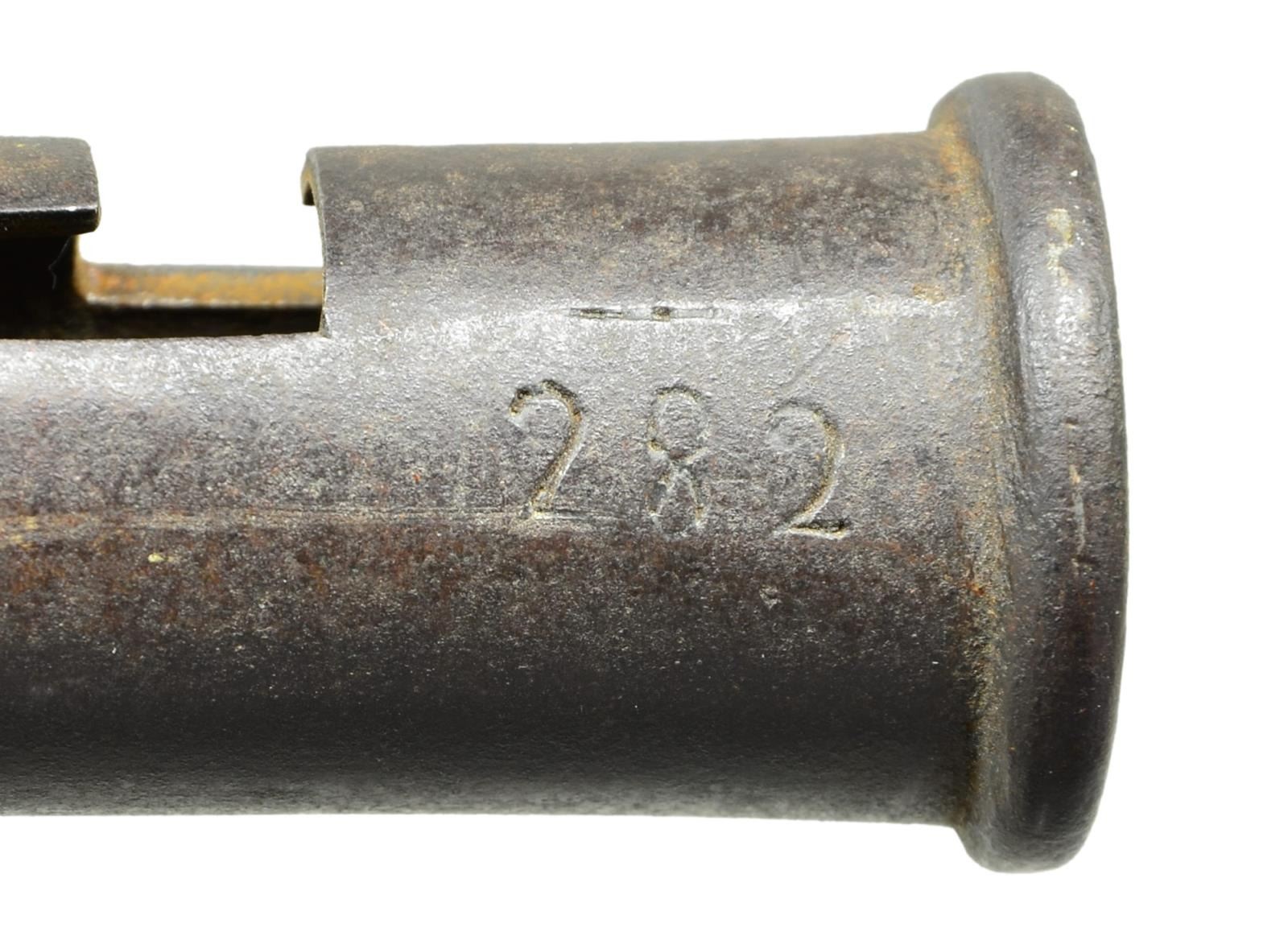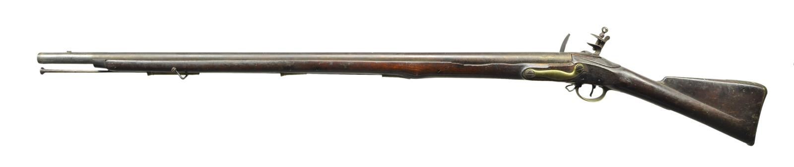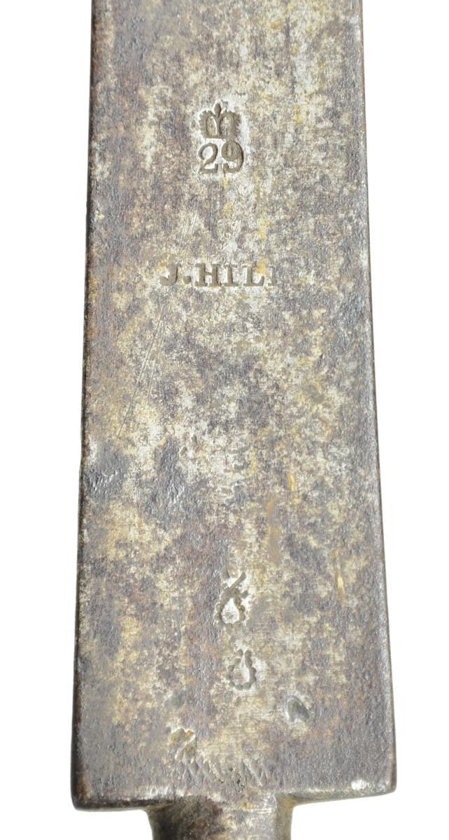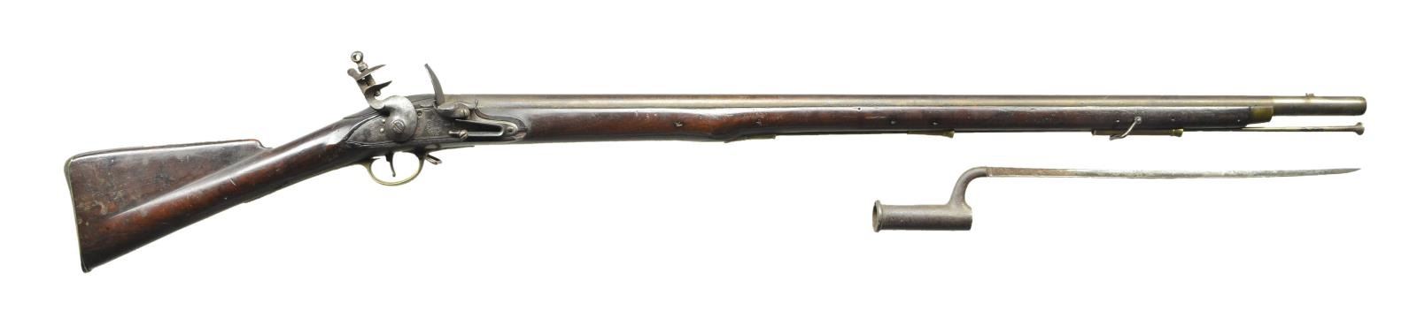 MUSKET & BAYONET CIRCA 1810. Cal. 75. S# NSN. Bbl.39.25". Standard configuration of 1793 pattern made last in 1815. Tower & GR cypher marked lock, broad arrow proofs on lock & barrel. This is an honest example of War of 1812 era Brown Bess musket. 17.25” blade bayonet proofed and contract maker stamped “J. HILL”. CONDITION: very good overall, all original, complete, & matching, smooth iron patina, pitting at breech, barrel bright where protected by attached bayonet. Mechanics fine, strong springs, clear dark smooth bore. Stock sound, stamped “DEWERSON” opposite lock. Bayonet matches well. (01-22774/JS). ANTIQUE. $2,000-3,000.