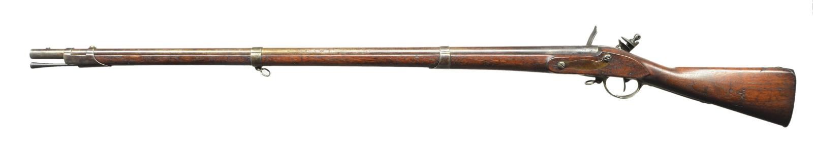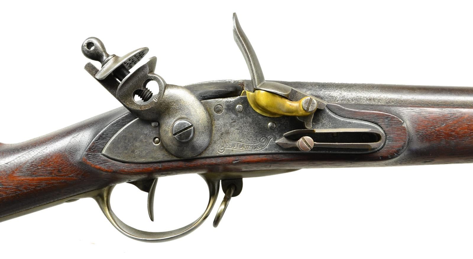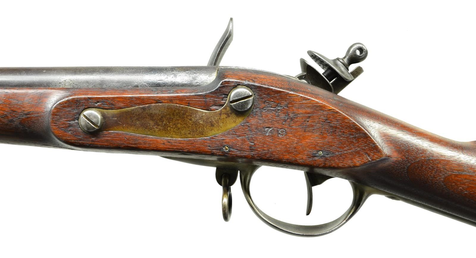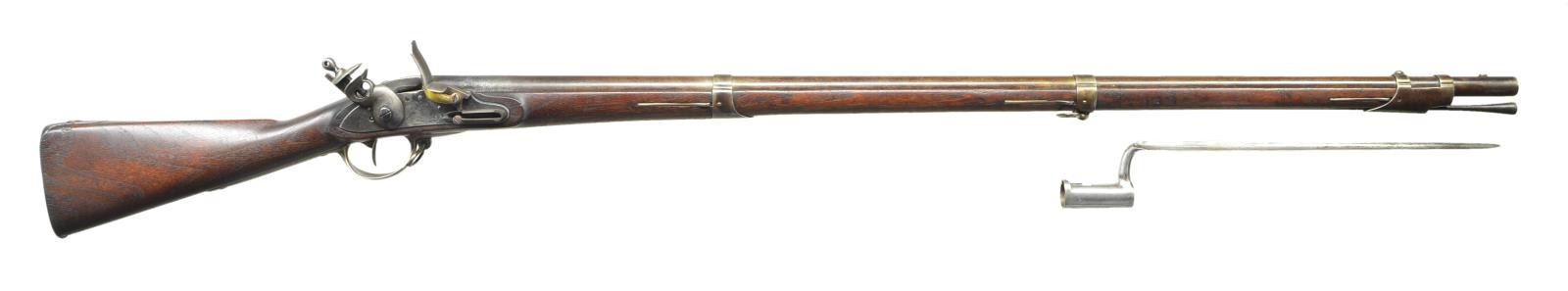 Cal. 69. NSN. Bbl. 42 w/ bayonet stud. "N HAVEN" marked in banner on lock w/ brass pan & spear tip finial spring. 3 Band musket stock w/ musket buttplate & button tipped ramrod. Toeline of stock stamped "D". Left ear of stock has "JN" J. Newbury inspector cartouche, stamped "79" & hand scratched "W. A. Rulam". "5" Stamped behind top tang. Lock marked "II.B" & "8" on interior. Internal parts of lock have assembly number "VI". UNATTACHED ACCESSORIES: Socket bayonet measuring 17.75", blade: 15". Stamped by mortise "11991" & "I". Also stamped "MS". CONDITION: exposed portions of bbl. & lock have dark brown patina appearance w/ heavily pitting around lock along w/ light corrosion & pitting throughout. Hammer, frizzen & frizzen spring appear replacements, while rest of lock appears original flint. Stock has a fine original finish showing an occasional sm. gouge, crack & scratch commensurate with age. Markings on stock appear mostly visible. Buttplate has large areas of black patina. Triggerguard has cleaned appearance with light pitting & reacquiring patina. Dark pitted bore. (01-22704/MD). ANTIQUE. $700-1,100.