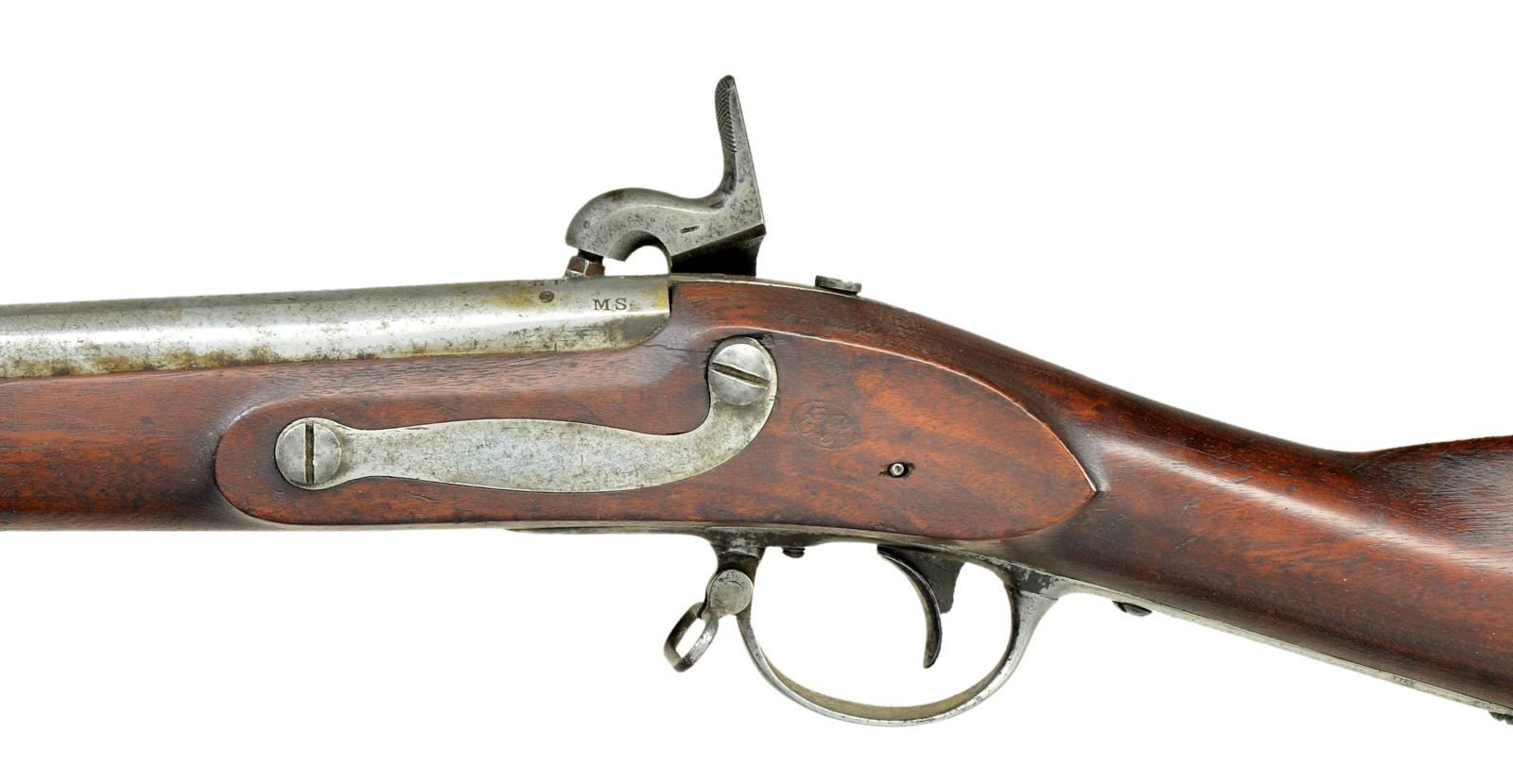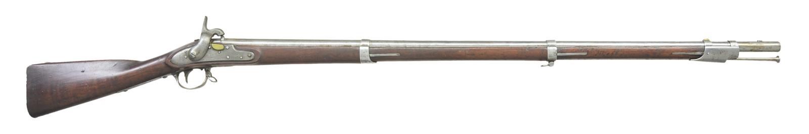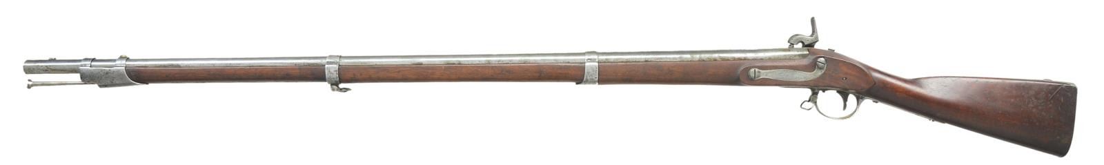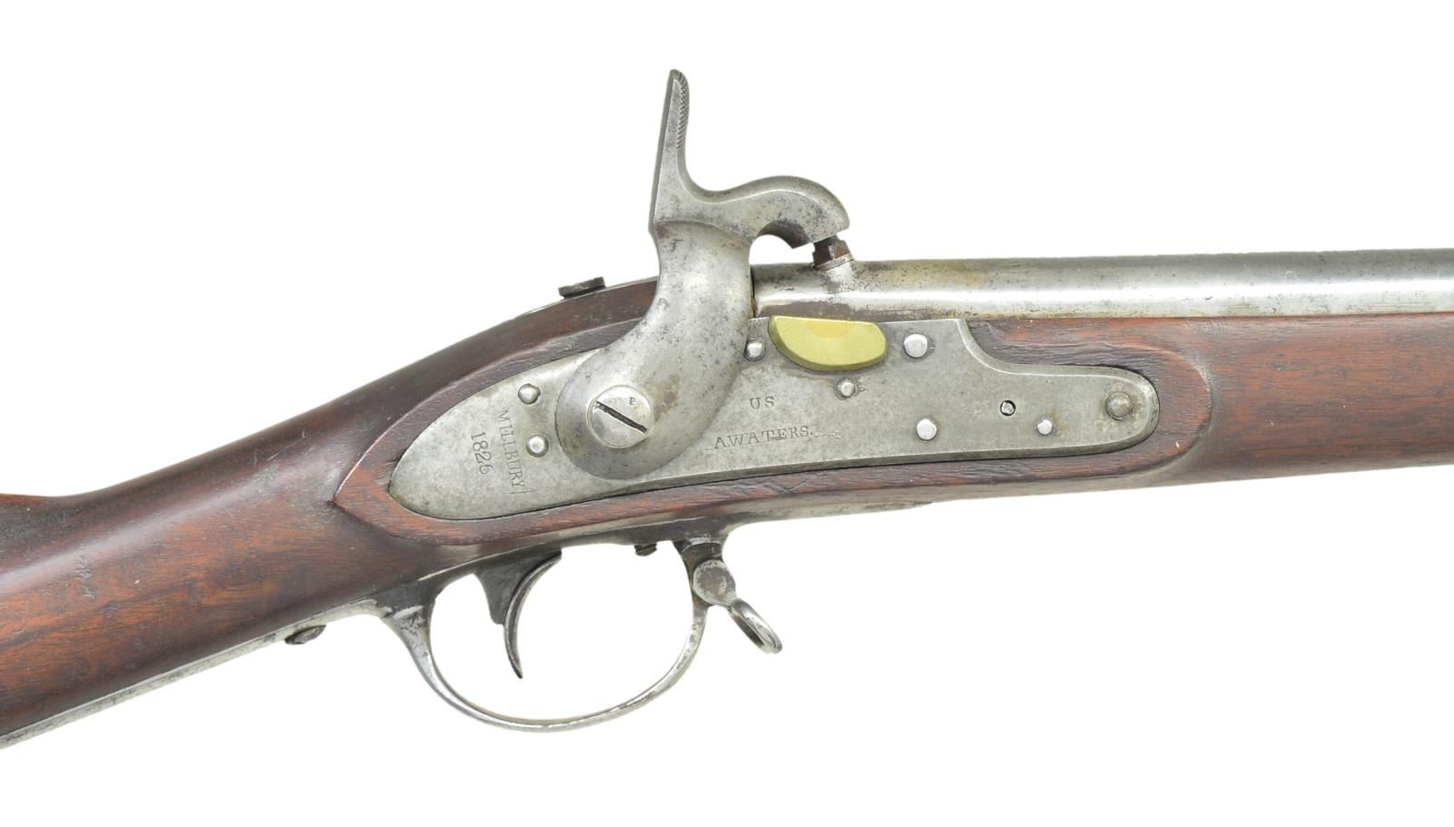 PERCUSSION. Cal. 69. NSN. Usual configuration. 42" barrel is marked "US" "ET" and "P" at top rear. "MS (Massachusetts) is stamped to left. Tang is dated 1826. Barrel is converted to percussion using the Belgian alteration as done by National Armories. Lock, fitted with percussion hammer is marked "US" "A WATERS" at center "MILLBURY" "1826" on tail. Walnut stock is iron mounted. Inspectors initials are on left side opposite lock. CONDITION: good. Metal parts cleaned to silver and gray over light pitting. Stock finish is fine; original and with many marks. Inspectors mark is clear. Bore has some shine and scattered pitting. Lock is good. PROVENANCE: From the Raymond Darida Estate. (01-22226/MGM). ANTIQUE. $600-1,000.