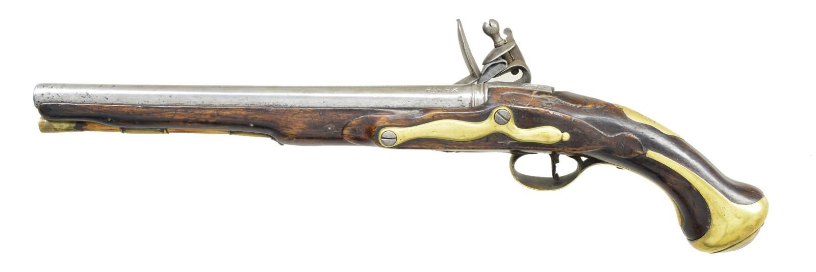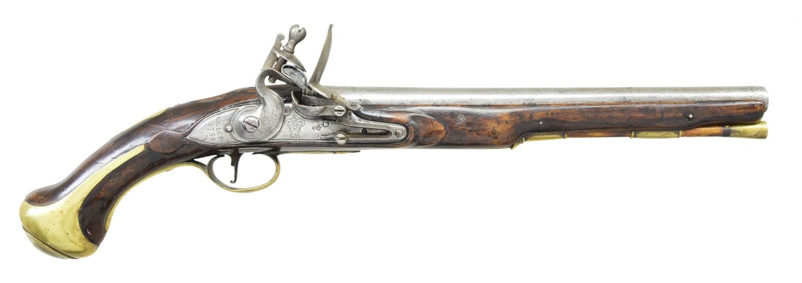 PISTOL. Cal. 54. NSN. Bbl. 11 7/8" round w/ smoothbore. Top flat of bbl. has Royal British Dragoon marking, the L in royal is raised & the S after the abbreviated Dragoon is raised. Left of center are crown over GR w/ broad arrow mark & Birmingham definitive black powder proof. To the left of that is stamped “IV”. Borderline engraved lock w/ makers name Brice over 1759 date at tail w/ crown over GR & broad arrow markings under the pan. Pin fastened walnut stock w/ relief carving around locks & top tang areas. Brass fittings consist of butt cap, trigger guard, side plate, wrist plate, thimble & single pipe. Wrist plate is marked 6 over 20 (6th soldier, 20th troop). Brass tipped hardwood ramrod. CONDITION: metal has cleaned appearance showing scattered pitting. Stock has added finish over dents & scratches. Forearm tip has small crack on right side. Sound lock. Dark bore. (01-23068/DS). ANTIQUE. $1,500-2,000.