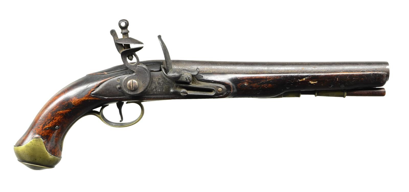 LIGHT DRAGOON FLINTLOCK PISTOL. Cal. 62. NSN. Bbl. 9 1/8" round w/ smoothbore having 2 British proof marks at left side. Lock is marked w/ crown over GR. Trigger guard bow is engraved “Bucks” referring to the Bucks Volunteers of the 85th light infantry regiment of Wellington’s army. The 85th fought in the battles of Bladensburg, the burning of Washington D.C., Baltimore & New Orleans in 1815. Pin fastened walnut stock. Brass fittings consist of butt cap, trigger guard, side plate, brass thimble & single pipe holding a hardwood ramrod. CONDITION: metal has a mottled gray appearance showing substantial wear. Stock shows heavy wear w/ handling marks having a crack in the side plate area. Forearm section shows numerous small holes & areas of repair. Functioning lock. Dark deeply pitted bore. (01-23066/DS). ANTIQUE. $1,200-1,800.