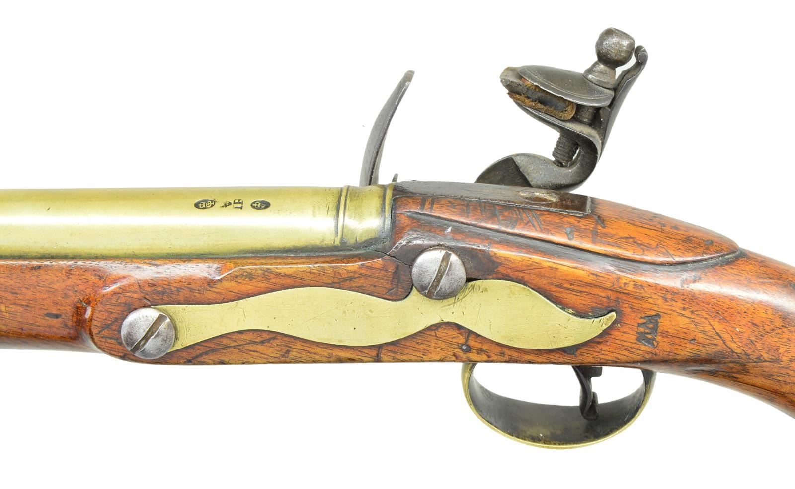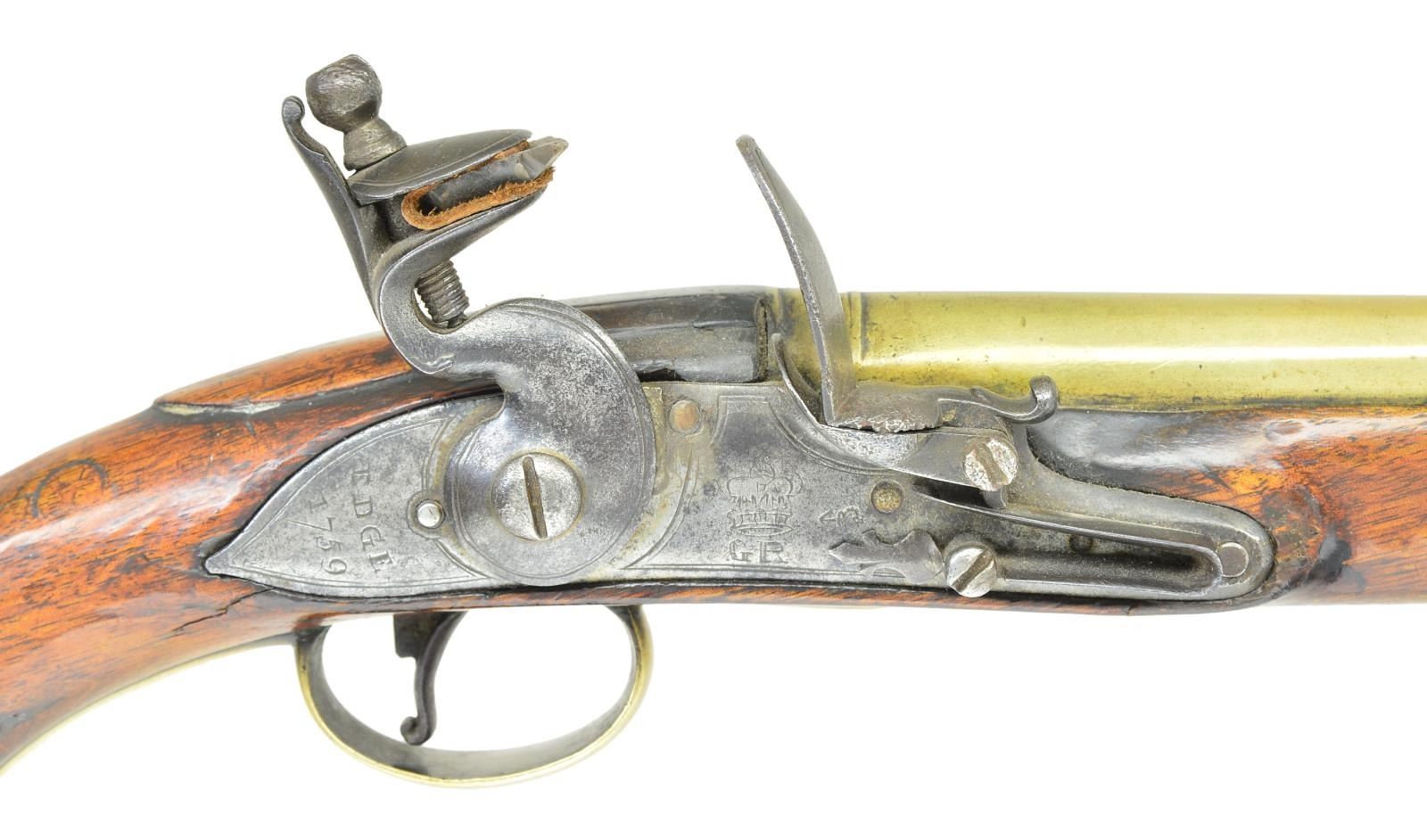 EDGE. Cal. 60. S# NSN. Bbl. 12" rnd brass bbl. Bbl. is marked on top w/ 2 British proofs & "IR". Rounded lock plate unreinforced hammer, iron pan w/ bridle & marked under pan "crowned GR" & "crowned broad arrow". Marked vertically at tail "EDGE 1759". Brass furniture w/ walnut stock. Replacement ramrod w/ brass tip. CONDITION: lock appears to function correctly. Stock has moderate wear, scratches & staining throughout w/ added protective finish. Stock has sm. crack at lower rear edge of lockplate & behind bbl. extending under sideplate screw on left side. Brass parts have been cleaned w/ traces of dark patina, wear & handling marks. Bore has dark oxidized appearance. (01-23064/RW). ANTIQUE. $1,200-1,800.