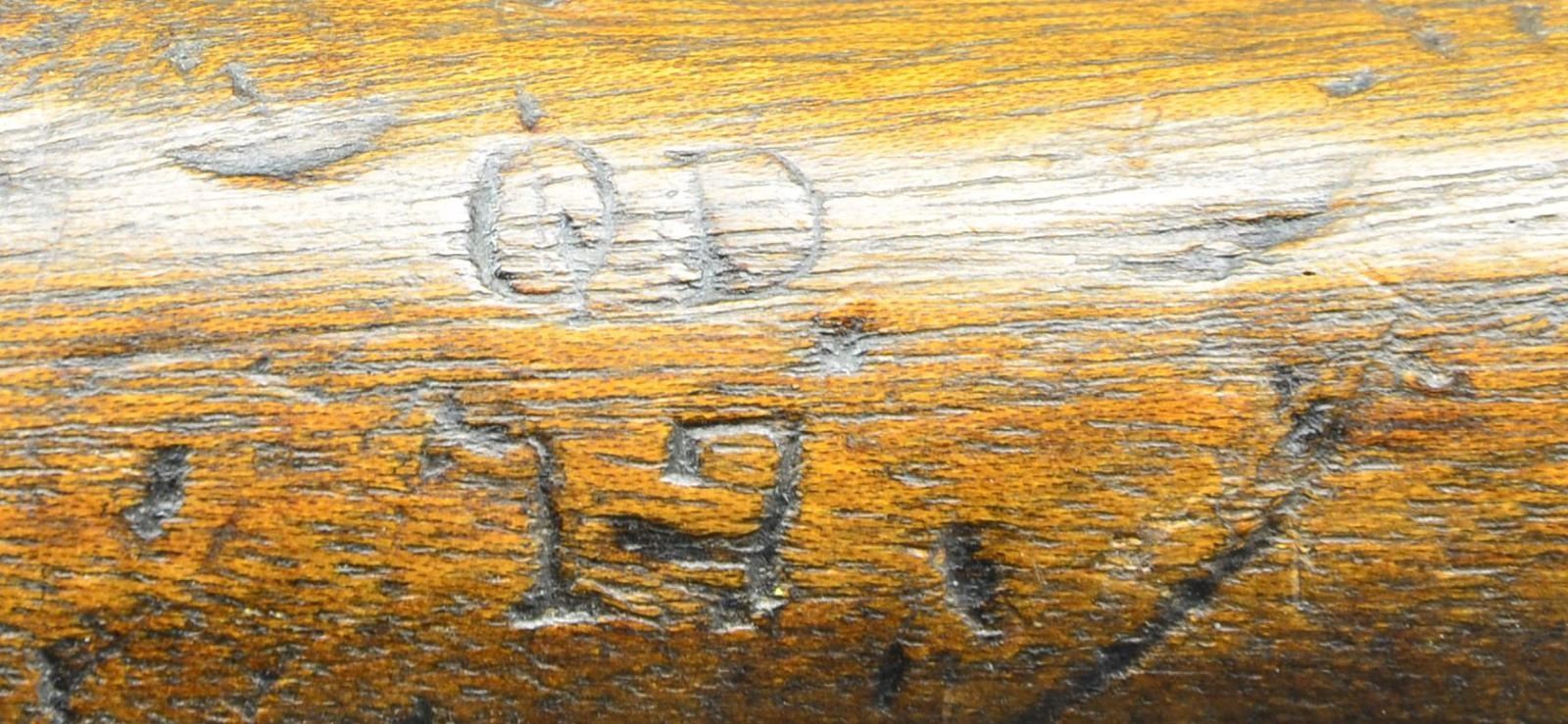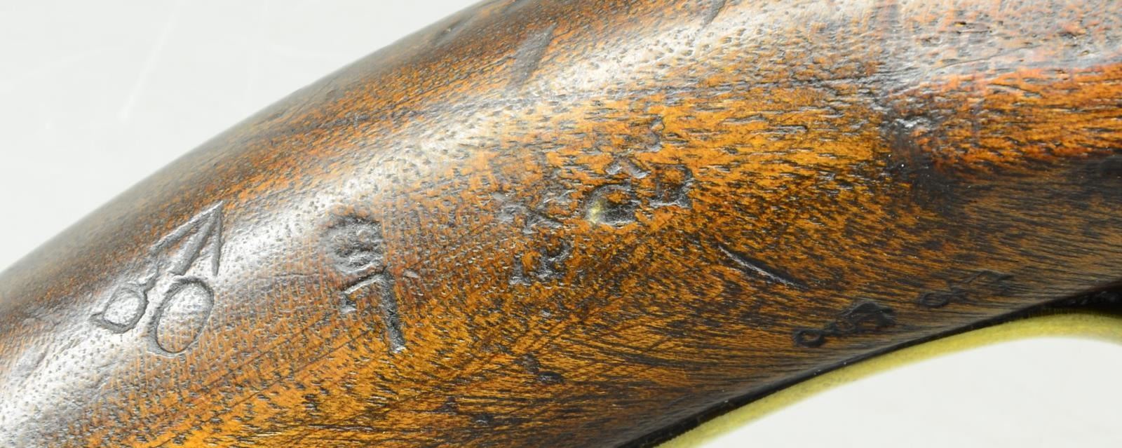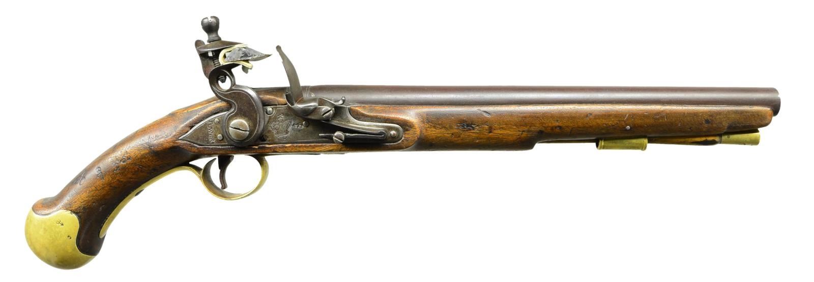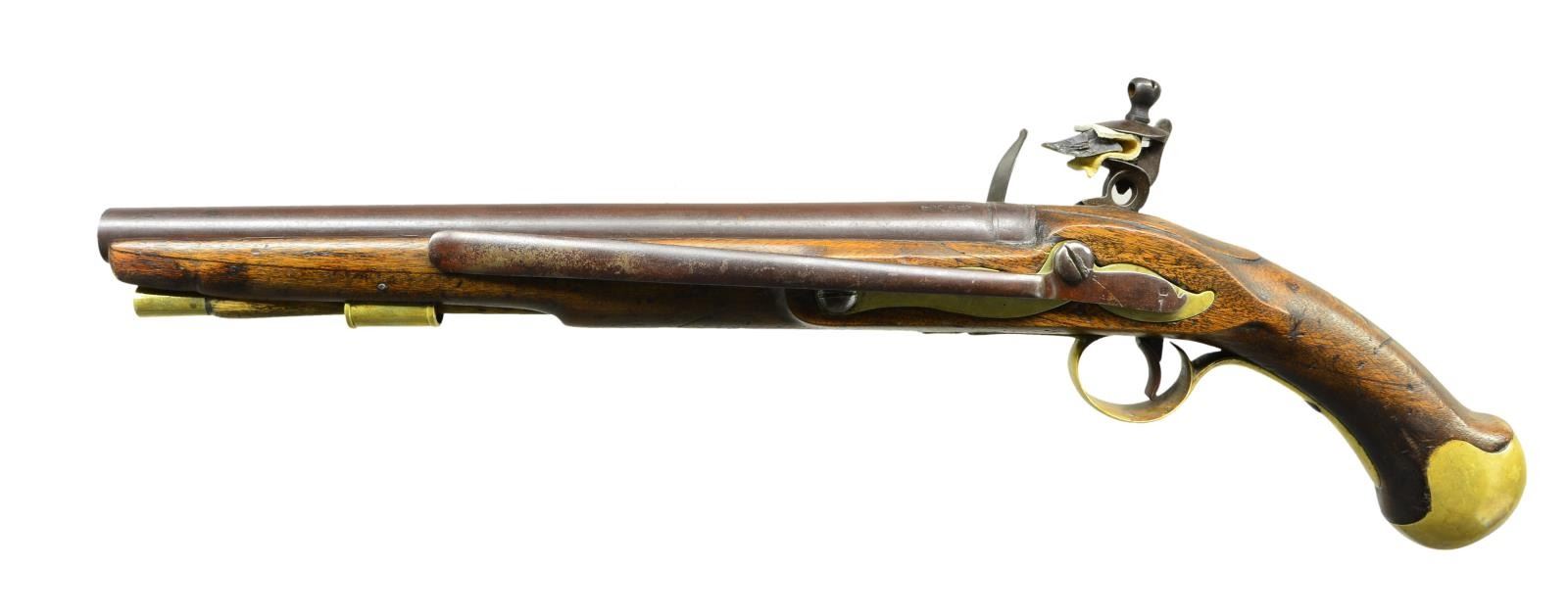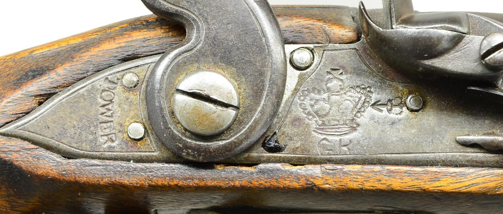 Cal. 60. S# NSN. 12" rnd. smooth bore bbl. Flat lockplate w/ beveled edge. Double neck hammer. Bridled pan. Lock is marked w/ "crown GR" below pan. Marked at rear "tower". Bbl. marked on top w/ "crown" proofs. Buttcap has "crown arrow" marking on right side. Brass furniture w/ iron belt hook. Pin fastened walnut stock. Stock is marked under forend "QD 1-7". Grip is marked on right side w/ "BO broad arrow" "crown 1802". Ramrod is original type w/ brass tip marked w/ "crown GR". CONDITION: stock has worn original finish w/ staining & handling marks throughout. There is a crack extending from underneath the sideplate to the grip area to the rear of the lock recess plus another long crack on the left side of the forend extending from the muzzle to the forward end of the sideplate. These cracks appear to have been repaired in a professional manner & are not open. An additional crack appears on the left side between the sideplate & bbl. Although repaired has a more opened appearance. The iron parts show 60% original brown finish w/ wear, light oxidation & patina. Brass furniture has been cleaned leaving a bright appearance w/ wear & scattered sm. handling marks. Lock does not hold on half cock. Dark oxidized bore w/ extensive pitting throughout. (01-23063/RW). ANTIQUE. $1,200-1,800.
