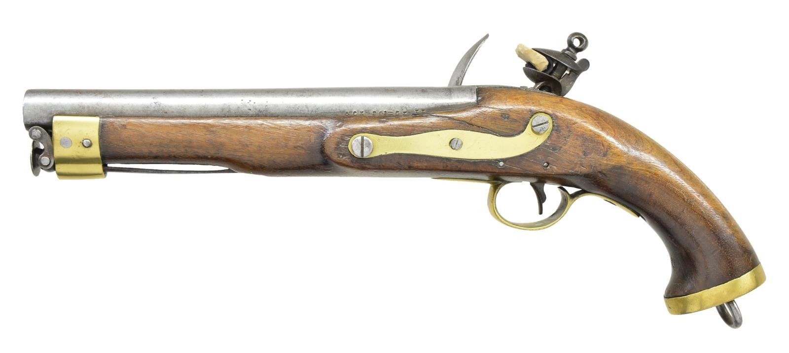 FLINTLOCK PISTOL. Cal. 65. NSN. Bbl. 9" round w/ smoothbore. Breech end of bbl. has London black powder proof & view marks. Lock is marked w/ the British East India Company trademark lion. Walnut stock has brass nose cap, side plate & flat butt cap w/ lanyard ring. Iron swivel ramrod. CONDITION: metal has heavily worn cleaned gray appearance w/ scattered light pitting. Left side of bbl. has added ID number partially covered by the stock. Refinished stock shows heavy wear w/ cracks & chips in lock, side plate & forearm areas. Functioning lock w/ stiff spring tension. Dark pitted bore. (01-23059/DS). ANTIQUE. $700-1,000.