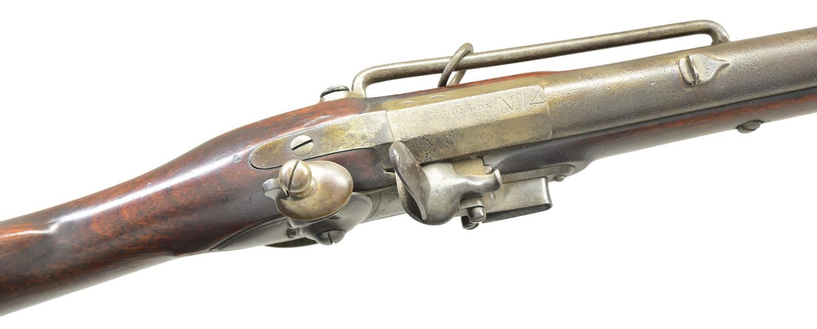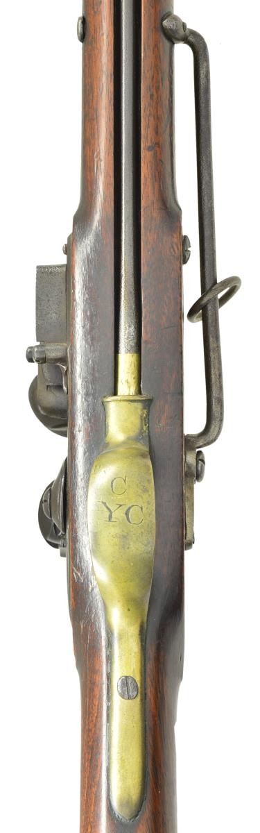 FLINTLOCK SHORT RIFLE BY H. NOCK. Cal. 69 (7 groove rifling, muzzle counterbored 4"). S# 14. A large number of military type rifles were made up during the period 1800-1840 for issue to privately raised militias, constabularies, etc. Some followed normal British standard many others did not. This interesting short rifle has 28" barrel with 3" octagonal breech section stamped "LONDON" on top flat, which is also engraved with rack number "No. 14". London commercial type black powder proofs are on top left flat. Barrels are fitted with "U" notch rear and bead front sights. There is no provision for mounting a bayonet. Lock of early style with rounded plate is fitted with serpentine cock, integral rounded pan, bridled friction frizzen and feather spring with dog nose finial. Lock has double line border engraving and "H. NOCK" is in center. (Henry Nock died in 1804). Turn of the 19th century style straight grip stock is brass mounted. Buttplate has 2 1/2" rounded return. Sideplate is of 1813 Baker rifle style. Trigger guard is also late style with truncated finial to accept large caliber ramrod. 1800 type ramrod pipes hold steel ramrod with large retaining swell and brass cap. Ramrod channel is of later type and is open to trigger guard finial. A saddle ring bar on left side is of 1813 type with teardrop secondary attachment at rear, front attachment differs from standard in having a pendular attachment point allowing bar to sit higher along barrel. Stock is pinned to barrel and has brass cap which ends 2 1/2" from muzzle. Stock is marked with acceptance initials "JC" behind sling bar mount. Trigger guard bow is engraved "C" "YC" (Cobham Yeomanry Calvary). An almost identical rifle is in the Royal Armouries Study Collection also by Nock. It's provenance is Cobham Hall, July 1957, Kent sale. The Royal Armouries estimates a manufacturing date of 1799. CONDITION: very good to fine. Barrel and lock show considerable old cleaning to gray brown over some fairly deep pitting. Marks remain clear. Stock retains most of what appears to be its original oil finish with a fair number of marks and dings. Brass is nicely toned. Bore is very fine, shiny with one or two minor pits. Lock is fine. A very interesting British flintlock rifle. (01-22256/MGM). ANTIQUE. $3,000-5,000.