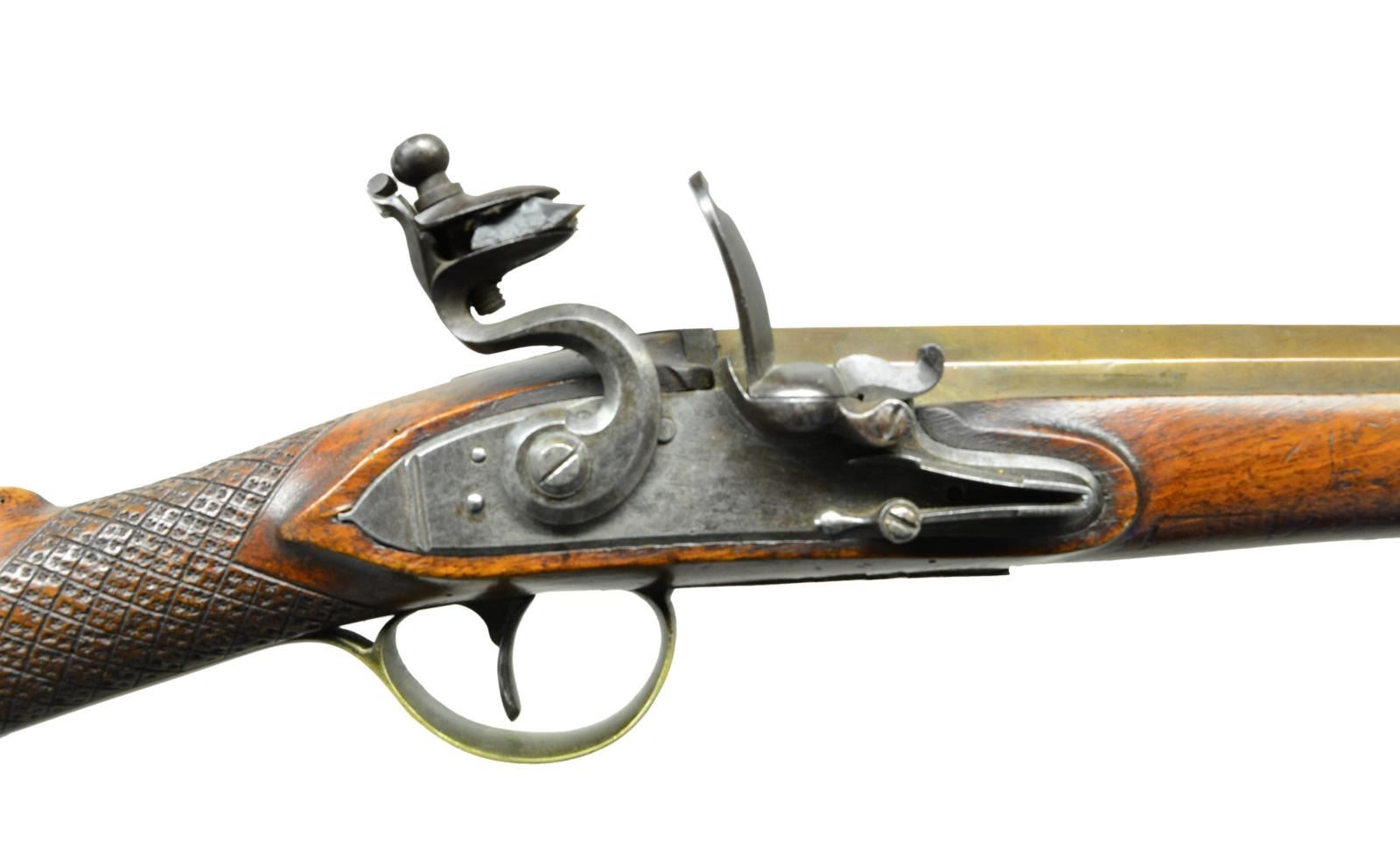 Cal. 60. NSN. This attractive medium quality gun has 17" bronze barrel which has octagonal breech section and is round toward muzzle with cannon turned rings. Good quality flintlock with beveled plate having rebated tail is fitted with chamfered serpentine cock, integral round pan, bridled friction frizzen and feather spring with bulbous finial having teat. European walnut stock extends to within 2" of muzzle and is brass mounted. Double beaded trigger guard has pineapple finial, buttplate has steeple type top tang. Both mounts have some scroll and foliate engraving. Stock has large square checkering at grip with punched in design and attaches to barrel with two side bolts without escutcheons. Greenheart ramrod with horn tip has steel worm tail. CONDITION: very good. Barrel and mounts with old cleaning are nicely toned. Lock is mottled gray patina. Stock has many marks in old possibly original finish. Bore is smooth. Lock is very good. PROVENANCE: From the Lifelong Collection of Glen E. Mattox. (01-22463/MGM). ANTIQUE. $1,200-1,800.