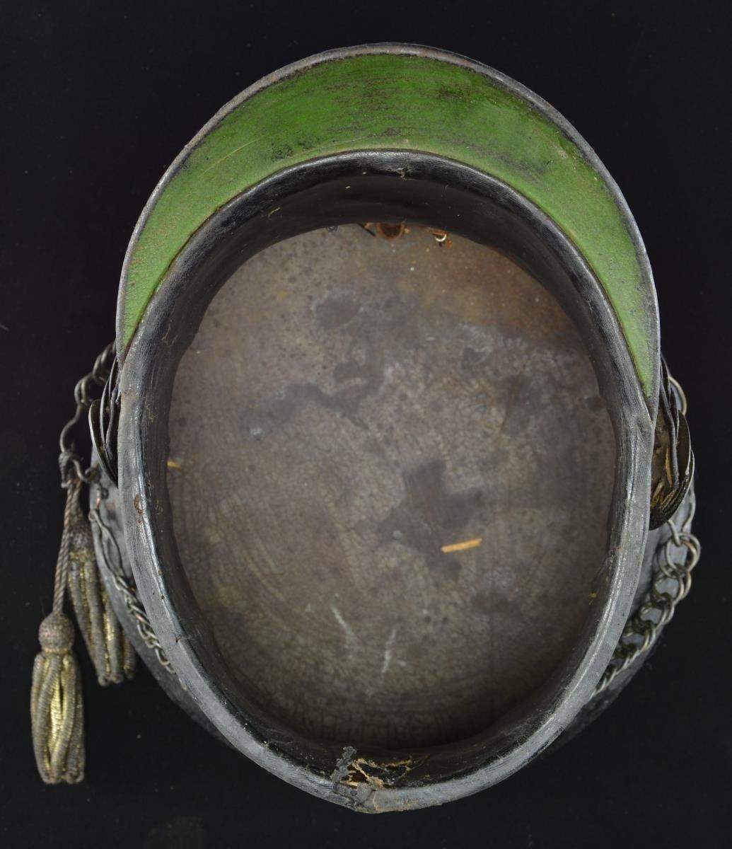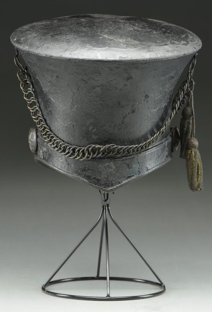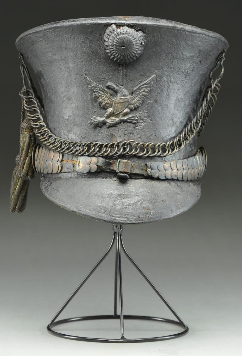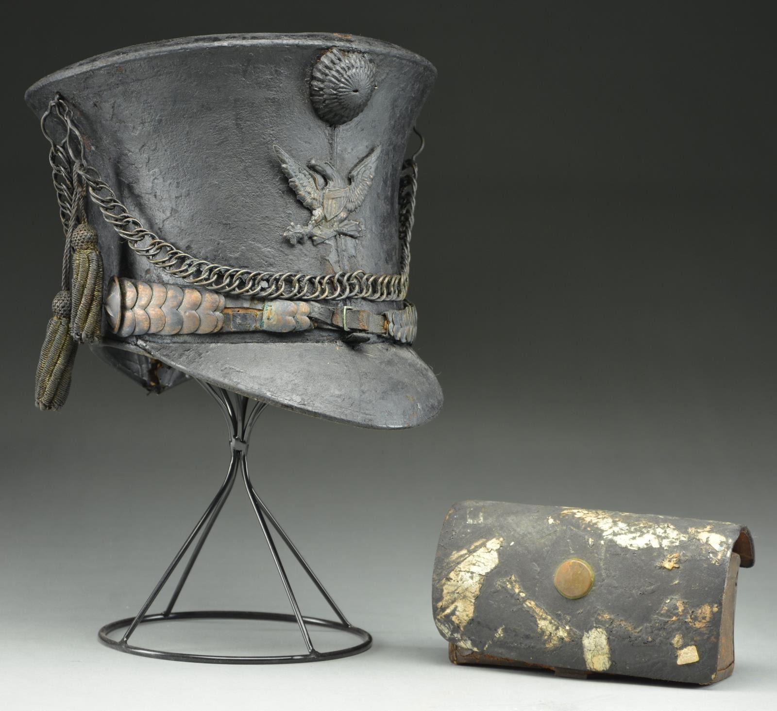 1) HELMET. This piece of early American military headgear is totally made of leather. It has an M1821 style eagle on the front with a leather cockade above. It has an individually scaled chinstrap with star side buttons. A decorative chain loops from the top of the helmet across the front and from the top of the helmet across the back. There are silver bullion tassels attached to the right side of the chain. No maker’s label. A later wool pompom is included for display purposes. CONDITION: the helmet appears to have been blackened a few times. Some of the original finish has flaked away, but the underlying layer has been blackened and blends well. Much of the blacking has migrated to the eagle, chain & chinstrap, necessitating a good cleaning.