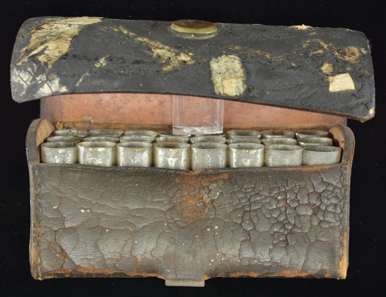 2) CARTRIDGE BOX. The cartridge box is leather with a round brass stud on the front. Both belt loops are partially detached and white paper residue is stuck to the front. The interior has 24 tin tubes and the closure is of the 1812 period. CONDITION: box shows heavy wear overall with substantial loss of finish. Interior tubes are complete & undamaged. (02-19563/BF). $1,400-2,200.