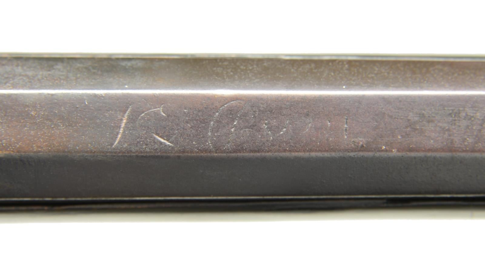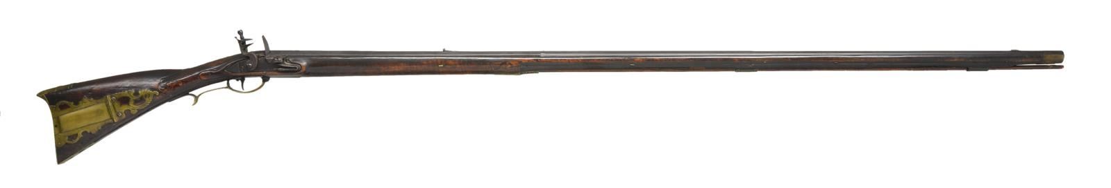 BERRY. Cal. 58 - 8 groove rifling. S# NSN. This classic rifle made either by Peter Berry the elder working in Dauphin County, PA 1786-96 or more likely his son of Annville, PA 1800-1807; has 50 1/2" half octagon half round barrel fitted with "V" notch rear and long brass bead front sights. Top flat is engraved "P. Berry". Lock, which appears to be in original flint, has good file decoration on lockplate and is fitted with serpentine cock, inset faceted pan and bridled friction frizzen. Feather spring is also decoratively filed and has bulbous finial with teat. Stock, of relatively plain hard maple is brass mounted. The most striking feature is the multi pierced patchbox which has distinctive Berry type sideplates either side of plain rectangular cover. Release button is in 2 1/2" brass return on toeline. Buttplate has some decorative filing. Beveled trigger guard has curl toward rear forming grip. Sideplate has fancy ogee outline similar to other known Berry rifles. Stock has raised mouldings around lock and sideplate with distinctive large drop points. Raised carved scrolls are around barrel tang, in front of cheekpiece, patchbox finial as well as large flourishes behind cheekpiece. Edge of cheekpiece has long triangular brass plate. Stock extends to muzzle with 2" brass cap and attaches to barrel with four captive brass sidebolts. Hickory ramrod is held by two beaded octagonal pipes and matching thimble. CONDITION: good. Iron parts are nearly all dark brown patina. Wood shows light refinishing with added oil over some minor repair of cracks along barrel channel and another repaired crack through grip area. Brass is nicely toned. Interior of lock shows replaced main spring, sear spring and some work on sear tail otherwise, lock and barrel appear to be in their original flint configuration. Bore is fair to good, pitted with considerable ramrod wear at muzzle, lock is good. (01-21954/MGM). ANTIQUE. $4,500-6,500.