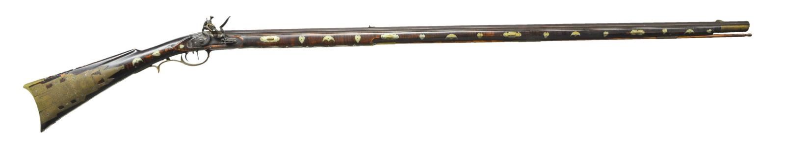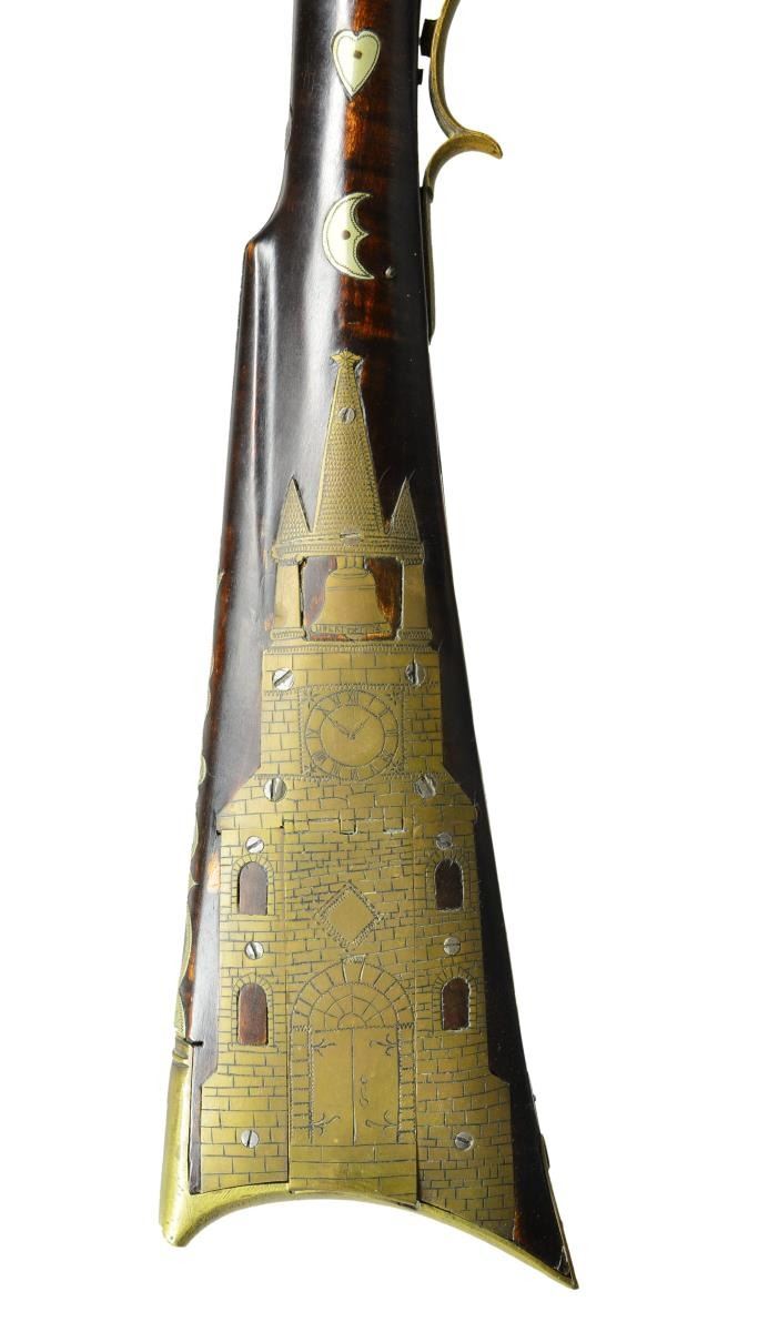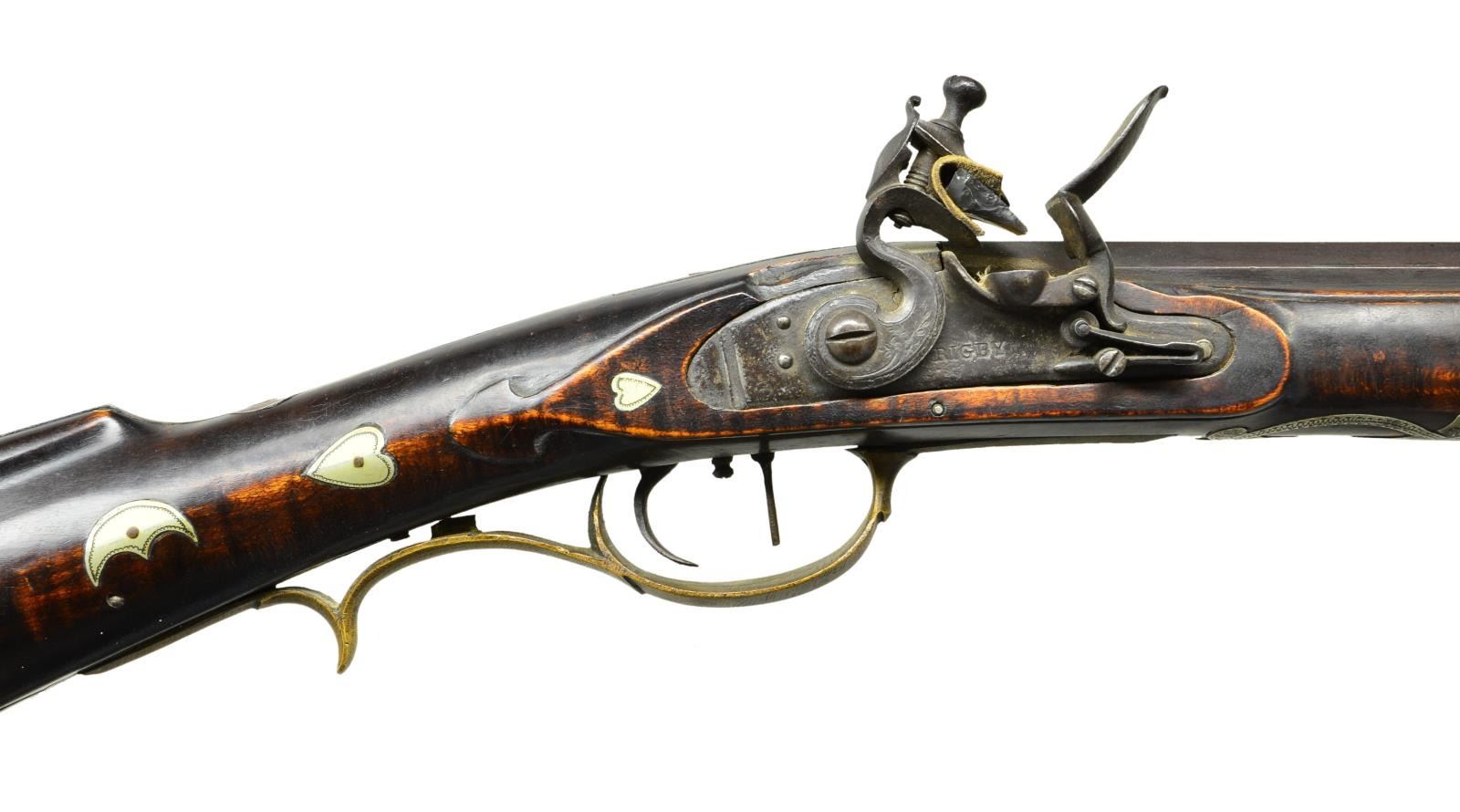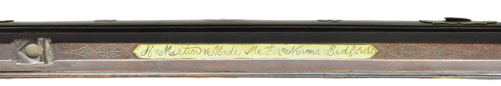 KENTUCKY RIFLE BY HACKER MARTIN. Cal. 32. S# NSN. Hacker Martin was an old school Kentucky rifle builder who learned his craft from his grandfather. This small bore light rifle has 42" octagon barrel fitted with "U" notch rear and German silver bead front sights. An inlet German silver area on top flat behind rear sight is engraved "H*Martin*Made Me For*Norma Bedford". Old, trade type flint lock with serpentine cock and bridled roller frizzen is stamped "RIGBY". Stock of hard maple with curly grain extends to muzzle with 2 1/2" brass cap and attaches to barrel with four brass sidebolts. Stock is brass mounted with usual faceted trigger guard and crescent buttplate. Fancy sideplate has three piercings, the center being a heart. Patchbox is quite unusual, shaped and engraved depicting a church spire, windows and belfry are pierced. Buttplate return with many piercings has fancy outline and patchbox release button is toward rear. Other unusual features of stock are the very long top tang which extends over comb, and pierced German silver comb plate. Stock is decorated with over 35 small German silver inlays of crescent moon and heart pattern. Sidebolt escutcheons are also of a fancy pattern. Butt has inlaid 8 pointed star at face of cheekpiece and edge has German silver wear plate with pricker. Area between trigger guard and thimble are inlaid with German silver palm plate having five elliptical piercings, central portraying a running stag. Stock also has some incised scroll carving behind and under cheekpiece. CONDITION: fine with artificial aging. Barrel and lock showing brown patina. Stock retains most of its original oil finish. Brass has toned to brown. Bore is shiny but has many minor pits toward muzzle, mechanically good. (01-21949/MGM). ANTIQUE. $5,500-7,500.