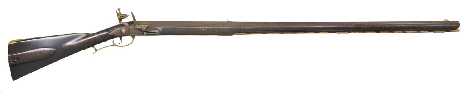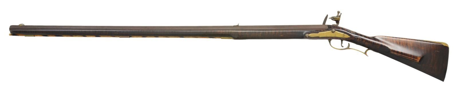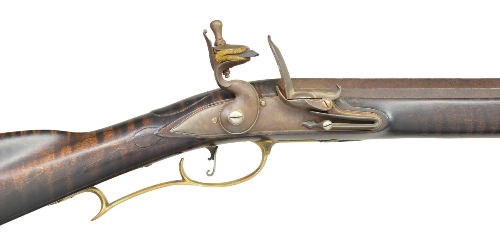 KENTUCKY RIFLE. Cal. 60. NSN. The 40 1/4" slightly swamped octagon barrel is fitted with one standing leaf rear and German silver blade front sights. Lock of 1760's style with rounded and beaded plate with long tail has serpentine cock, semi waterproof pan, bridled friction frizzen and feather spring with flame finial. Stock of dark finished fiddle figured maple has raised beavertail around barrel tang, traditional right hand cheekpiece and is brass mounted. Buttplate has steeple type top tang, trigger guard has husk type finial and loop to grip. Long sideplate is chamfered. A sliding wooden patchbox cover is on right side of butt. Stock is pinned to barrel. Hickory ramrod mounts through two octagonal pipes and matching thimble. CONDITION: fine as artificially aged. Barrel and lock showing overall brown patina, brass nicely toned. Stock shows a number of minor marks in its original finish. Bore is very good to fine, lightly rusted. Lock is also fine. Consignor states that this rifle was used by a reenactor in the filming of "The Patriot" movie. (01-23003/MGM). ANTIQUE. $2,000-3,000.