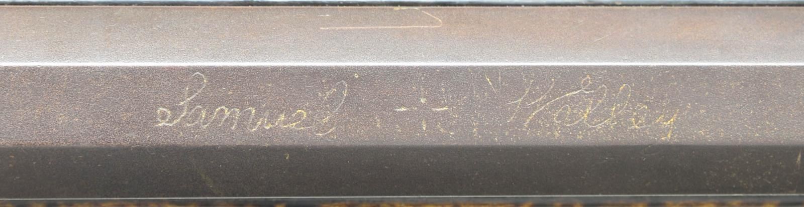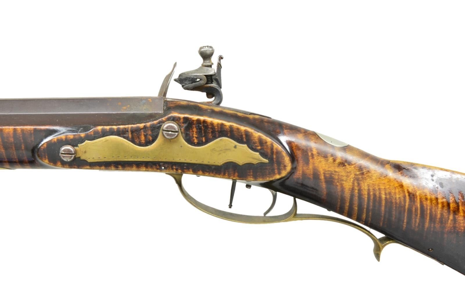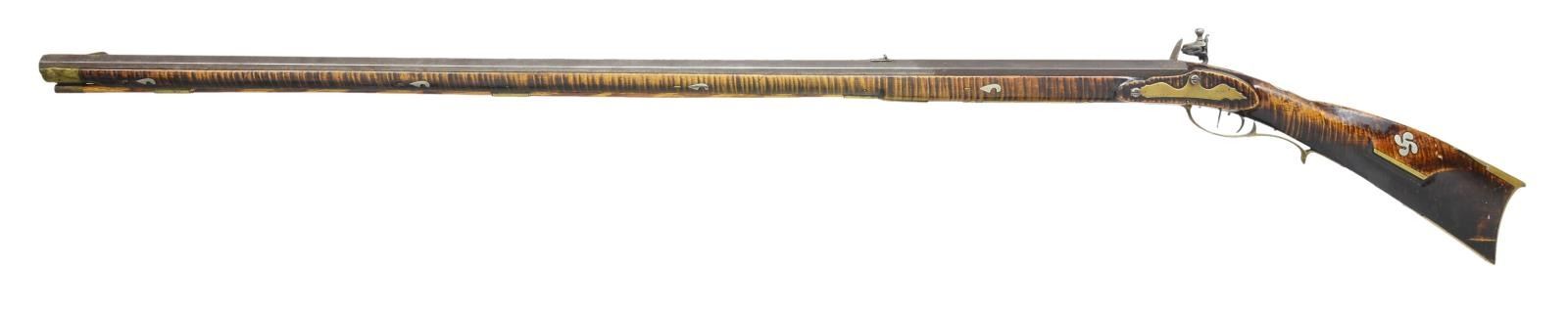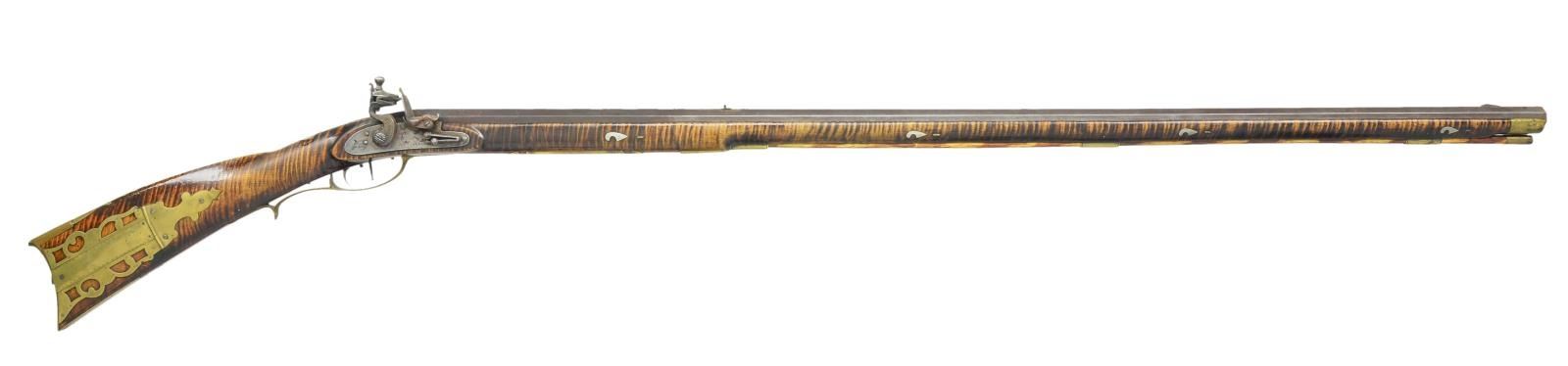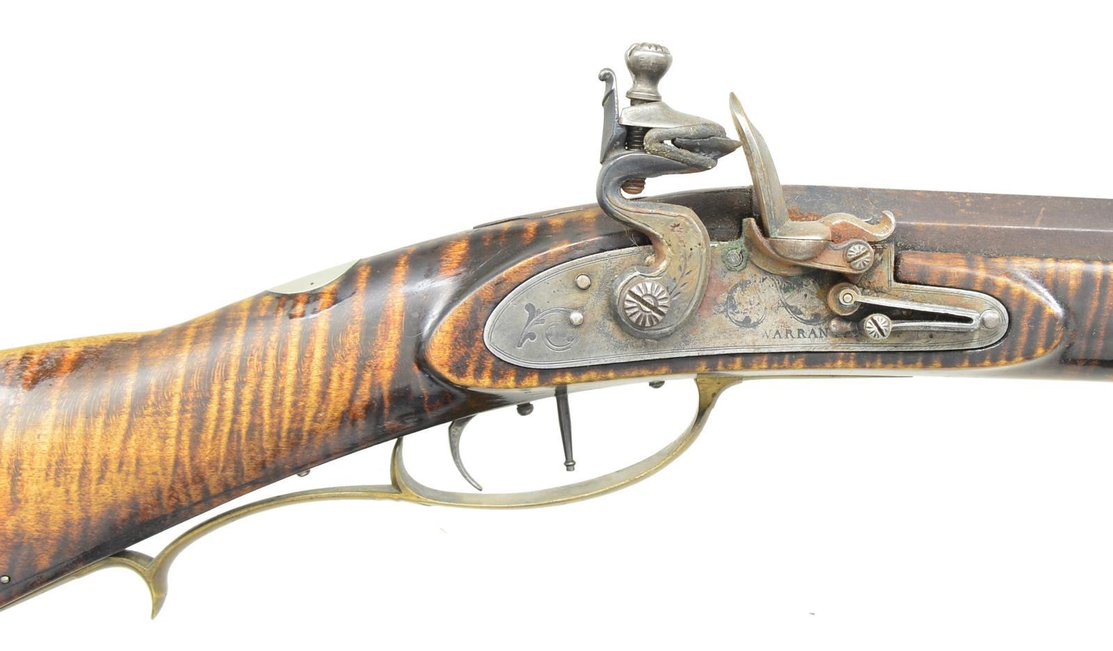 50 Cal. rifle 44" full octagon bbl. Signed "Samuel Walley" w/ an English "Warranted" Flint lock. Rifle has an extremely nice curly maple stock w/ a 4 piece brass patchbox w/ 8 piercings Rifle has dbl. set triggers & a 5" brass saddle plate & 3 wedge brass comb inlays. There are 10 silver inlays in the stock. Samuel Walley is listed as unlocated in Seller's Book. Ewing lists a John Worley in Beaver Township in 1848 who may have been related. This rifle is clearly signed and obviously form the Snyder County area. CONDITION: Rifle has been re-converted to flint. Hammer has been repaired by welding. Bore appears to be relined. Lock and triggers appear to function correctly. Stock has added finish with wear and handling marks. Repaired crack at toe prominent on the left side. Metal has the expected wear turning gray and patina. Brass and silver turning patina. Bore has strong sharp lands with very shallow pitting throughout.